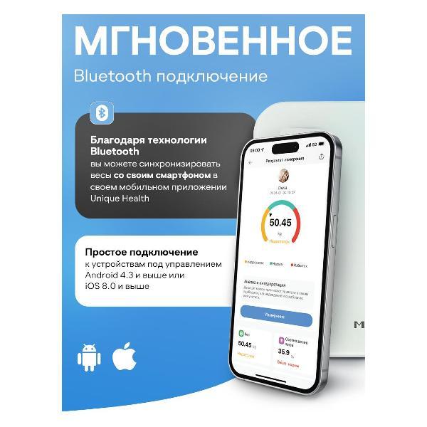 Устройство автоматически идентифицирует до десяти пользователей на основе сохраненных данных веса и передает результаты измерений по Bluetooth в фирменное мобильное приложение для Android или iOS. В приложении сохраняется вся история, строятся графики и отслеживается прогресс.