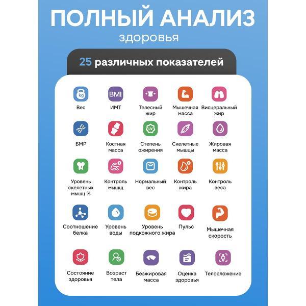 Прибор измеряет не только вес, но и восемь ключевых показателей: процент подкожного и висцерального жира, мышечную массу, содержание воды в организме, костную массу, скорость основного обмена (BMR), метаболический возраст и тип телосложения. Для этого используется метод биоимпедансного анализа: через тело пропускается безопасный слабый электрический сигнал.