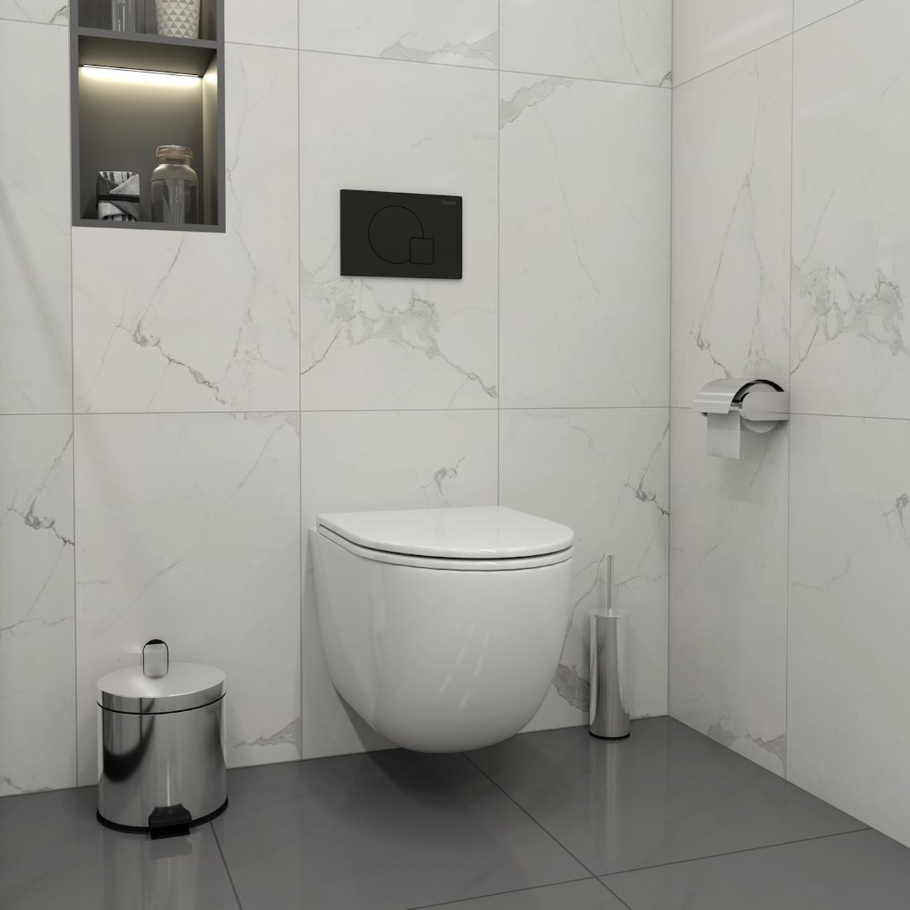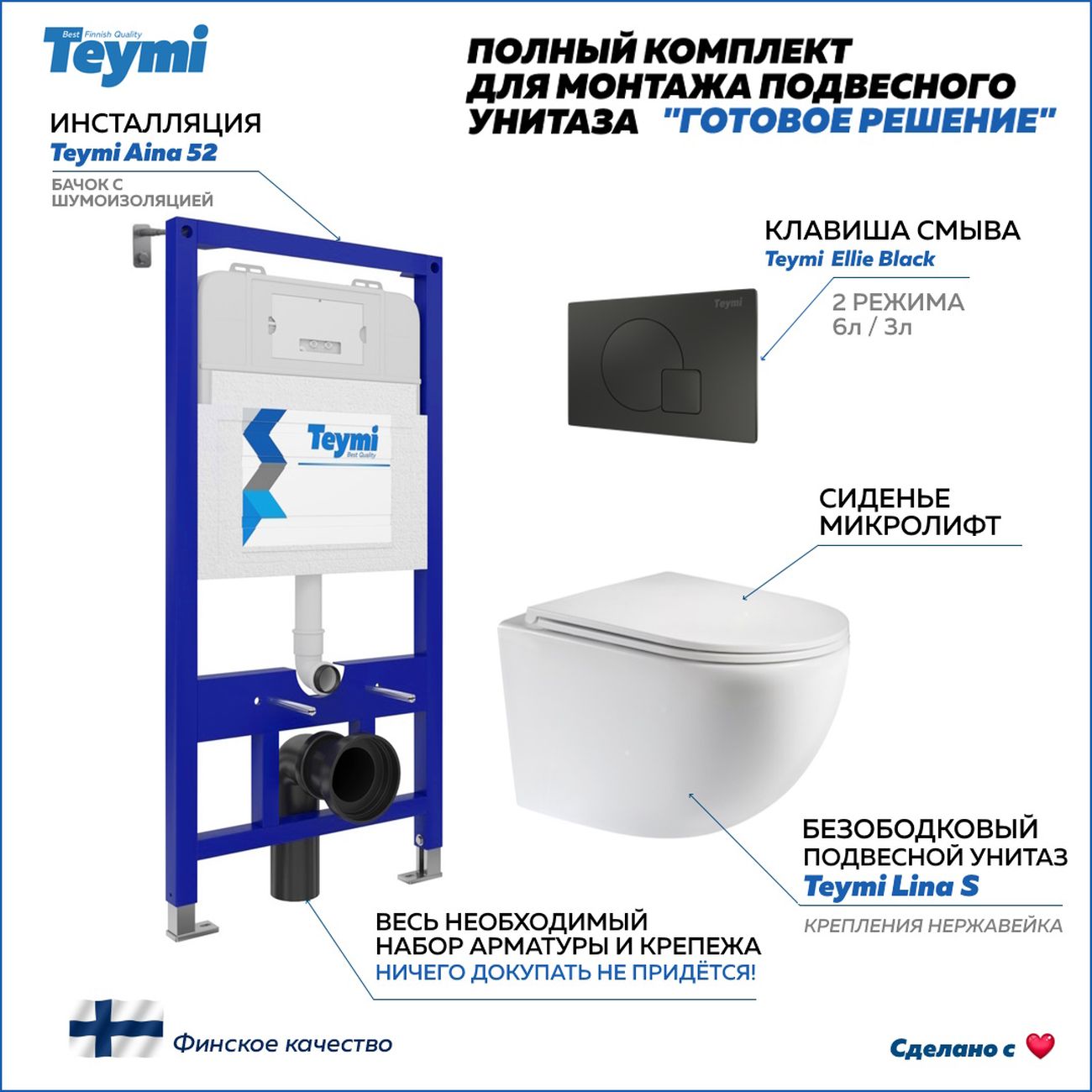 Комплект «Готовое решение» для установки инсталляции с подвесным унитазом включает: -- инсталляция TEYMI AINA 52 T70011 – монтажная рама из стального профиля толщиной 1.5 мм увеличенной ширины 52,5 см с дополнительными вертикальными усиливающими стойками, что позволяет выдерживать нагрузки до 400 кг; -- клавиша смыва TEYMI ELLIE T70023BM, цвет ЧЕРНЫЙ МАТОВЫЙ; -- унитаз подвесной TEYMI LINA S T40102; -- быстросъёмное сиденье с микролифтом; -- полный комплект арматуры для монтажа, включающий в себя уплотнительные кольца и манжеты, трубу смыва, фановый отвод с удлинителем, защитный кожух ревизионного окна с крепежной рамкой, закрывающей панелью и крышкой; -- полный комплект крепежа для установки, а именно: крепеж к стене, шпильки для унитаза, крепежная рамка, соединительные шпильки, толкатели; -- инструкция по установке и обслуживанию. Преимущества комплекта «Готовое решение» для установки инсталляции с подвесным унитазом: -- полная (максимальная) комплектация для установки - больше ничего докупать не придётся; -- все составляющие комплекта идеально подходят друг к другу; -- взаимозаменяемость комплектующих; -- рама покрыта суперпрочной порошковой краской с антикоррозионными свойствами; -- высота рамы может регулироваться с ходом до 20 см с помощью ножек, изготовленных из оцинкованной стали; -- сливной бачок скрытого монтажа изготовлен из современных полимерных материалов и является цельнолитым (бесшовным), что позволяет ему работать без протечек в течение всего периода эксплуатации; -- лёгкость обслуживания сливного бачка достигается благодаря удобному ревизионному окну, скрытому за клавишей смыва; -- клавиша смыва имеет две кнопки и работает в режиме ЭКОНОМ / ПОЛНЫЙ (объёмы смыва 3 / 6 литров); -- гарантия на весь комплект составляет 10 лет, а рама прослужит все 50. Комплект «Готовое решение» для установки инсталляции TEYMI AINA 52 с подвесным унитазом TEYMI LINA S T40102 и клавишей TEYMI ELLIE T70023BM в цвете черный матовый подобран специально для того, чтобы покупателям было проще сориентироваться в огромном выборе товаров для ванной комнаты. Оптимальное сочетание инсталляционной системы, клавиши смыва и подвесного унитаза позволит не задумываясь сделать правильный выбор. Инсталляция для подвесного унитаза от известного финского бренда TEYMI предназначена для оборудования санузлов и выгодно отличается своей надёжностью и простотой установки. Уважаемые покупатели, обращаем ваше внимание на то, что система инсталляции TEYMI AINA 52 может быть также укомплектована другими клавишами смыва или подвесными унитазами от бренда TEYMI (вы легко сможете найти их на этом сайте по указанным артикулам). Предлагаем вам рассмотреть варианты сочетания со следующими клавишами: : HELMI хром T70202CH : HELMI черная T70203BM : HELMI белая T70018WM : LINA хром T70102CH : LINA черная T70103BM : LINA белая T70019WM : AINA хром T70012CH : AINA черная T70013BM : AINA белая T70020WM : KATI хром T70701CH : KATI черная T70702BM : KATI белая T70021WM : ELLIE хром T70022CH : ELLIE черная T70023BM : ELLIE белая T70024WM Также просим обратить взгляд на наши лучшие безободковые подвесные унитазы: : SOLLI T40201 : LINA S T40102 : HELMI S T40302 : HELMI VORTEX T40303 : IVA T40601 : ELLIE T40802 : LINA MEDIA T40105 : LORI T40501 : KATI T40701 : HANNA PRO T40901 : HELMI S BLACK T40302MB : VITRA PRO T40806 : VITRA T40804 : DEMI T40208 : LINA VORTEX T40110 : RITTA T40809 : LINA PRO T40106