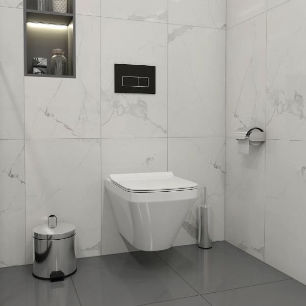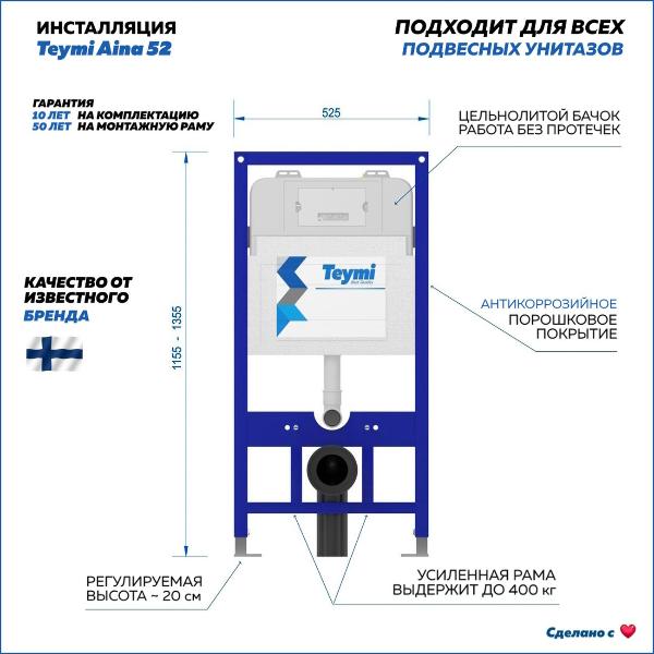 Комплект «Готовое решение» для установки инсталляции с подвесным унитазом включает: -- инсталляция TEYMI AINA 52 T70011 – монтажная рама из стального профиля толщиной 1.5 мм увеличенной ширины 52,5 см с дополнительными вертикальными усиливающими стойками, что позволяет выдерживать нагрузки до 400 кг; -- клавиша смыва TEYMI HELMI T70205, цвет ЧЕРНЫЙ МАТОВЫЙ, ОКАНТОВКА ХРОМ; -- унитаз подвесной TEYMI KATI T40701; -- быстросъёмное сиденье с микролифтом; -- полный комплект арматуры для монтажа, включающий в себя уплотнительные кольца и манжеты, трубу смыва, фановый отвод с удлинителем, защитный кожух ревизионного окна с крепежной рамкой, закрывающей панелью и крышкой; -- полный комплект крепежа для установки, а именно: крепеж к стене, шпильки для унитаза, крепежная рамка, соединительные шпильки, толкатели; -- инструкция по установке и обслуживанию. Преимущества комплекта «Готовое решение» для установки инсталляции с подвесным унитазом: -- полная (максимальная) комплектация для установки - больше ничего докупать не придётся; -- все составляющие комплекта идеально подходят друг к другу; -- взаимозаменяемость комплектующих; -- рама покрыта суперпрочной порошковой краской с антикоррозионными свойствами; -- высота рамы может регулироваться с ходом до 20 см с помощью ножек, изготовленных из оцинкованной стали; -- сливной бачок скрытого монтажа изготовлен из современных полимерных материалов и является цельнолитым (бесшовным), что позволяет ему работать без протечек в течение всего периода эксплуатации; -- лёгкость обслуживания сливного бачка достигается благодаря удобному ревизионному окну, скрытому за клавишей смыва; -- клавиша смыва имеет две кнопки и работает в режиме ЭКОНОМ / ПОЛНЫЙ (объёмы смыва 3 / 6 литров); -- гарантия на весь комплект составляет 10 лет, а рама прослужит все 50. Уважаемые покупатели, обращаем ваше внимание на то, что система инсталляции TEYMI AINA 52 может быть также укомплектована другими клавишами смыва или подвесными унитазами от бренда TEYMI (вы можете найти их на этом сайте по указанным артикулам). Предлагаем вам рассмотреть варианты сочетания со следующими клавишами: : HELMI хром T70202CH : HELMI черная T70203BM : HELMI белая T70018WM : LINA хром T70102CH : LINA черная T70103BM : LINA белая T70019WM : AINA хром T70012CH : AINA черная T70013BM : AINA белая T70020WM : KATI хром T70701CH : KATI черная T70702BM : KATI белая T70021WM : ELLIE хром T70022CH : ELLIE черная T70023BM : ELLIE белая T70024WM Также просим обратить взгляд на наши лучшие безободковые подвесные унитазы: : SOLLI T40201 : LINA S T40102 : HELMI S T40302 : HELMI VORTEX T40303 : IVA T40601 : ELLIE T40802 : LINA MEDIA T40105 : KATI T40701 : HANNA PRO T40901 : HELMI S BLACK T40302MB : VITRA PRO T40806 : VITRA T40804 : DEMI T40208 : LINA VORTEX T40110 : RITTA T40809 : LINA PRO T40106 : LINA S BLACK T40111
