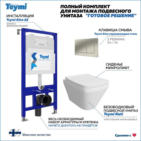 Комплект «Готовое решение» для установки инсталляции с подвесным унитазом включает: -- инсталляция TEYMI AINA 52 T70011 – монтажная рама из стального профиля толщиной 1.5 мм увеличенной ширины 52,5 см с дополнительными вертикальными усиливающими стойками, что позволяет выдерживать нагрузки до 400 кг; -- клавиша смыва TEYMI AINA T70014, корпус нержавеющая сталь, цвет НЕРЖАВЕЮЩАЯ СТАЛЬ матовый; -- унитаз подвесной TEYMI KATI T40701; -- быстросъёмное сиденье с микролифтом; -- полный комплект арматуры для монтажа, включающий в себя уплотнительные кольца и манжеты, трубу смыва, фановый отвод с удлинителем, защитный кожух ревизионного окна с крепежной рамкой, закрывающей панелью и крышкой; -- полный комплект крепежа для установки, а именно: крепеж к стене, шпильки для унитаза, крепежная рамка, соединительные шпильки, толкатели; -- инструкция по установке и обслуживанию. Преимущества комплекта «Готовое решение» для установки инсталляции с подвесным унитазом: -- полная (максимальная) комплектация для установки - больше ничего докупать не придётся; -- все составляющие комплекта идеально подходят друг к другу; -- взаимозаменяемость комплектующих; -- рама покрыта суперпрочной порошковой краской с антикоррозионными свойствами; -- высота рамы может регулироваться с ходом до 20 см с помощью ножек, изготовленных из оцинкованной стали; -- сливной бачок скрытого монтажа изготовлен из современных полимерных материалов и является цельнолитым (бесшовным), что позволяет ему работать без протечек в течение всего периода эксплуатации; -- лёгкость обслуживания сливного бачка достигается благодаря удобному ревизионному окну, скрытому за клавишей смыва; -- клавиша смыва имеет две кнопки и работает в режиме ЭКОНОМ / ПОЛНЫЙ (объёмы смыва 3 / 6 литров); -- гарантия на весь комплект составляет 10 лет, а рама прослужит все 50. Уважаемые покупатели, обращаем ваше внимание на то, что система инсталляции TEYMI AINA 52 может быть также укомплектована другими клавишами смыва или подвесными унитазами от бренда TEYMI (вы можете найти их на этом сайте по указанным артикулам). Предлагаем вам рассмотреть варианты сочетания со следующими клавишами: : HELMI хром T70202CH : HELMI черная T70203BM : HELMI белая T70018WM : LINA хром T70102CH : LINA черная T70103BM : LINA белая T70019WM : AINA хром T70012CH : AINA черная T70013BM : AINA белая T70020WM : KATI хром T70701CH : KATI черная T70702BM : KATI белая T70021WM : ELLIE хром T70022CH : ELLIE черная T70023BM : ELLIE белая T70024WM Также просим обратить взгляд на наши лучшие безободковые подвесные унитазы: : SOLLI T40201 : LINA S T40102 : HELMI S T40302 : HELMI VORTEX T40303 : IVA T40601 : ELLIE T40802 : LINA MEDIA T40105 : KATI T40701 : HANNA PRO T40901 : HELMI S BLACK T40302MB : VITRA PRO T40806 : VITRA T40804 : DEMI T40208 : LINA VORTEX T40110 : RITTA T40809 : LINA PRO T40106 : LINA S BLACK T40111