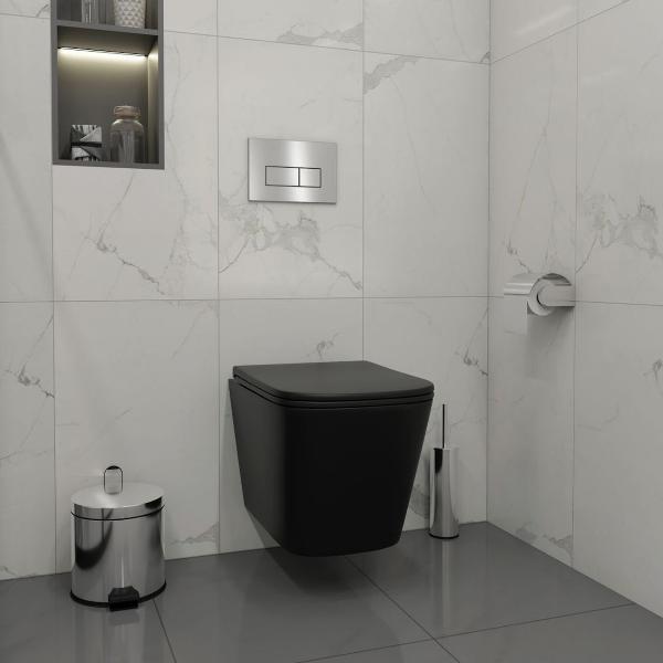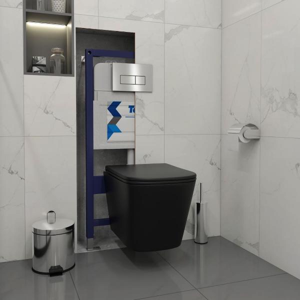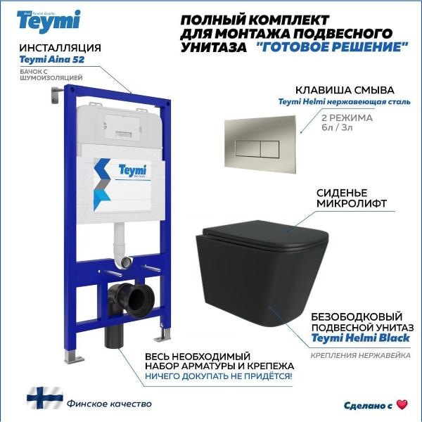 Комплект «Готовое решение» для установки инсталляции с подвесным унитазом включает: -- инсталляция TEYMI AINA 52 T70011 – монтажная рама из стального профиля толщиной 1.5 мм увеличенной ширины 52,5 см с дополнительными вертикальными усиливающими стойками, что позволяет выдерживать нагрузки до 400 кг; -- клавиша смыва TEYMI HELMI T70204, корпус нержавеющая сталь, цвет НЕРЖАВЕЮЩАЯ СТАЛЬ МАТОВАЯ; -- унитаз подвесной TEYMI HELMI BLACK T40302MB; -- быстросъёмное сиденье с микролифтом; -- полный комплект арматуры для монтажа, включающий в себя уплотнительные кольца и манжеты, трубу смыва, фановый отвод с удлинителем, защитный кожух ревизионного окна с крепежной рамкой, закрывающей панелью и крышкой; -- полный комплект крепежа для установки, а именно: крепеж к стене, шпильки для унитаза, крепежная рамка, соединительные шпильки, толкатели; -- инструкция по установке и обслуживанию. Преимущества комплекта «Готовое решение» для установки инсталляции с подвесным унитазом: -- полная (максимальная) комплектация для установки - больше ничего докупать не придётся; -- все составляющие комплекта идеально подходят друг к другу; -- взаимозаменяемость комплектующих; -- рама покрыта суперпрочной порошковой краской с антикоррозионными свойствами; -- высота рамы может регулироваться с ходом до 20 см с помощью ножек, изготовленных из оцинкованной стали; -- сливной бачок скрытого монтажа изготовлен из современных полимерных материалов и является цельнолитым (бесшовным), что позволяет ему работать без протечек в течение всего периода эксплуатации; -- лёгкость обслуживания сливного бачка достигается благодаря удобному ревизионному окну, скрытому за клавишей смыва; -- клавиша смыва имеет две кнопки и работает в режиме ЭКОНОМ / ПОЛНЫЙ (объёмы смыва 3 / 6 литров); -- гарантия на весь комплект составляет 10 лет, а рама прослужит все 50. Уважаемые покупатели, обращаем ваше внимание на то, что система инсталляции TEYMI AINA 52 может быть также укомплектована другими клавишами смыва или подвесными унитазами от бренда TEYMI (вы можете найти их на этом сайте по указанным артикулам). Предлагаем вам рассмотреть варианты сочетания со следующими клавишами: : HELMI хром T70202CH : HELMI черная T70203BM : HELMI белая T70018WM : LINA хром T70102CH : LINA черная T70103BM : LINA белая T70019WM : AINA хром T70012CH : AINA черная T70013BM : AINA белая T70020WM : KATI хром T70701CH : KATI черная T70702BM : KATI белая T70021WM : ELLIE хром T70022CH : ELLIE черная T70023BM : ELLIE белая T70024WM Также просим обратить взгляд на наши лучшие безободковые подвесные унитазы: : SOLLI T40201 : LINA S T40102 : HELMI S T40302 : HELMI VORTEX T40303 : IVA T40601 : ELLIE T40802 : LINA MEDIA T40105 : KATI T40701 : HANNA PRO T40901 : HELMI S BLACK T40302MB : VITRA PRO T40806 : VITRA T40804 : DEMI T40208 : LINA VORTEX T40110 : RITTA T40809 : LINA PRO T40106 : LINA S BLACK T40111