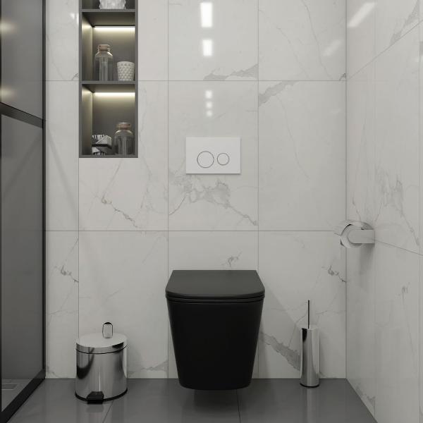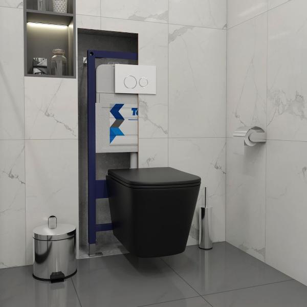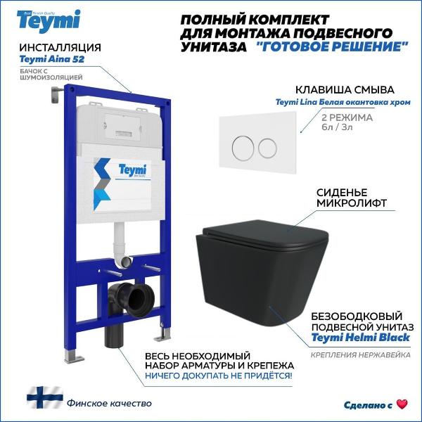 Комплект «Готовое решение» для установки инсталляции с подвесным унитазом включает: -- инсталляция TEYMI AINA 52 T70011 – монтажная рама из стального профиля толщиной 1.5 мм увеличенной ширины 52,5 см с дополнительными вертикальными усиливающими стойками, что позволяет выдерживать нагрузки до 400 кг; -- клавиша смыва TEYMI LINA T70106, цвет БЕЛЫЙ МАТОВЫЙ, ОКАНТОВКА ХРОМ; -- унитаз подвесной TEYMI HELMI BLACK T40302MB; -- быстросъёмное сиденье с микролифтом; -- полный комплект арматуры для монтажа, включающий в себя уплотнительные кольца и манжеты, трубу смыва, фановый отвод с удлинителем, защитный кожух ревизионного окна с крепежной рамкой, закрывающей панелью и крышкой; -- полный комплект крепежа для установки, а именно: крепеж к стене, шпильки для унитаза, крепежная рамка, соединительные шпильки, толкатели; -- инструкция по установке и обслуживанию. Преимущества комплекта «Готовое решение» для установки инсталляции с подвесным унитазом: -- полная (максимальная) комплектация для установки - больше ничего докупать не придётся; -- все составляющие комплекта идеально подходят друг к другу; -- взаимозаменяемость комплектующих; -- рама покрыта суперпрочной порошковой краской с антикоррозионными свойствами; -- высота рамы может регулироваться с ходом до 20 см с помощью ножек, изготовленных из оцинкованной стали; -- сливной бачок скрытого монтажа изготовлен из современных полимерных материалов и является цельнолитым (бесшовным), что позволяет ему работать без протечек в течение всего периода эксплуатации; -- лёгкость обслуживания сливного бачка достигается благодаря удобному ревизионному окну, скрытому за клавишей смыва; -- клавиша смыва имеет две кнопки и работает в режиме ЭКОНОМ / ПОЛНЫЙ (объёмы смыва 3 / 6 литров); -- гарантия на весь комплект составляет 10 лет, а рама прослужит все 50. Уважаемые покупатели, обращаем ваше внимание на то, что система инсталляции TEYMI AINA 52 может быть также укомплектована другими клавишами смыва или подвесными унитазами от бренда TEYMI (вы можете найти их на этом сайте по указанным артикулам). Предлагаем вам рассмотреть варианты сочетания со следующими клавишами: : HELMI хром T70202CH : HELMI черная T70203BM : HELMI белая T70018WM : LINA хром T70102CH : LINA черная T70103BM : LINA белая T70019WM : AINA хром T70012CH : AINA черная T70013BM : AINA белая T70020WM : KATI хром T70701CH : KATI черная T70702BM : KATI белая T70021WM : ELLIE хром T70022CH : ELLIE черная T70023BM : ELLIE белая T70024WM Также просим обратить взгляд на наши лучшие безободковые подвесные унитазы: : SOLLI T40201 : LINA S T40102 : HELMI S T40302 : HELMI VORTEX T40303 : IVA T40601 : ELLIE T40802 : LINA MEDIA T40105 : KATI T40701 : HANNA PRO T40901 : HELMI S BLACK T40302MB : VITRA PRO T40806 : VITRA T40804 : DEMI T40208 : LINA VORTEX T40110 : RITTA T40809 : LINA PRO T40106 : LINA S BLACK T40111