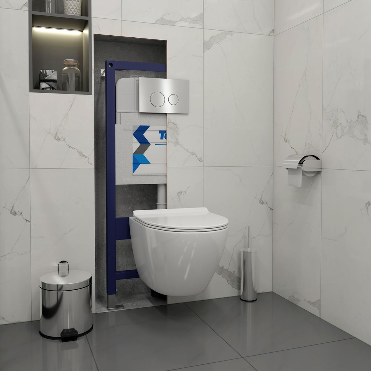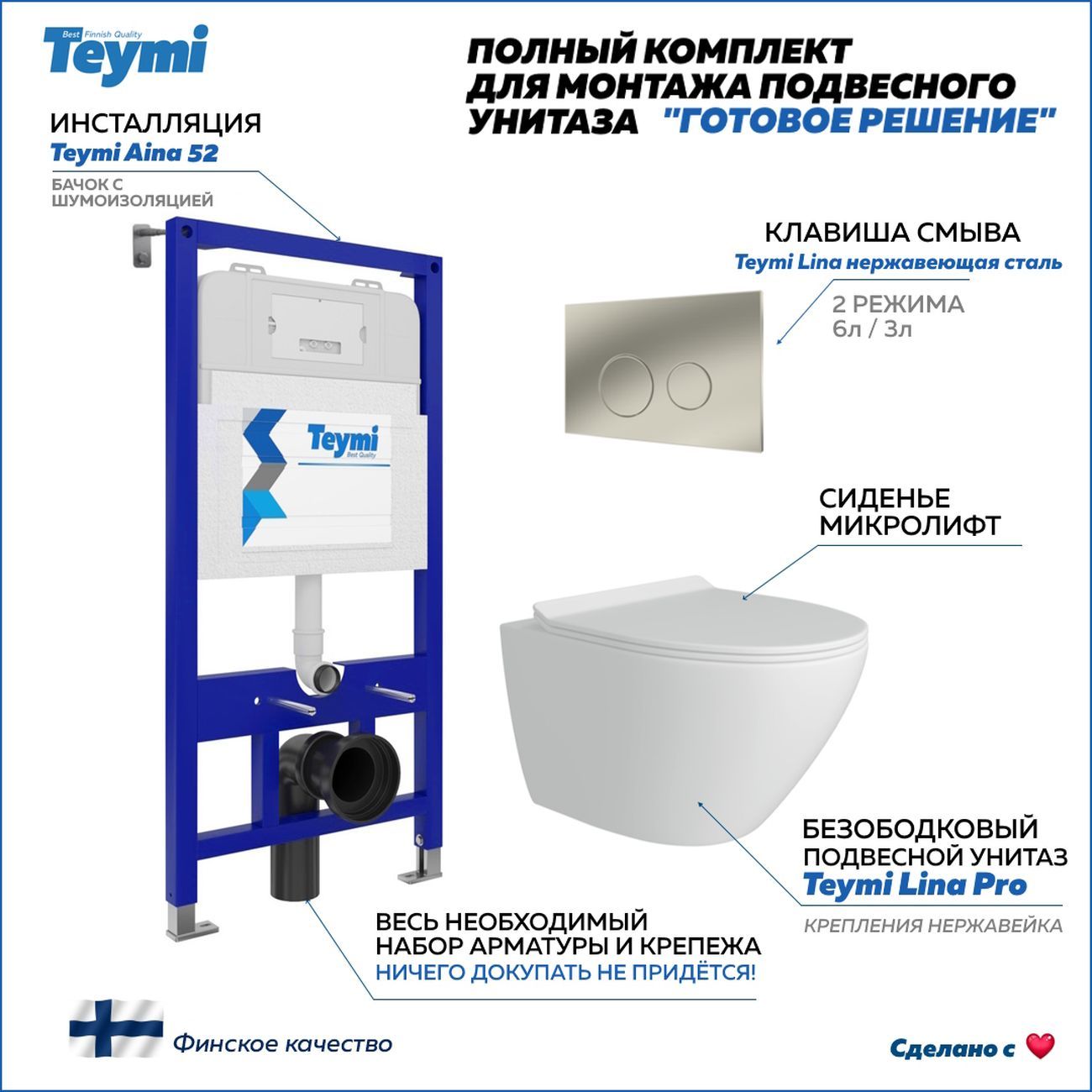 Комплект «Готовое решение» для установки инсталляции с подвесным унитазом включает: -- инсталляция TEYMI AINA 52 T70011 – монтажная рама из стального профиля толщиной 1.5 мм увеличенной ширины 52,5 см с дополнительными вертикальными усиливающими стойками, что позволяет выдерживать нагрузки до 400 кг; -- клавиша смыва TEYMI LINA T70104, корпус нержавеющая сталь, цвет НЕРЖАВЕЮЩАЯ СТАЛЬ МАТОВЫЙ; -- унитаз подвесной TEYMI LINA PRO T40106; -- быстросъёмное сиденье с микролифтом; -- полный комплект арматуры для монтажа, включающий в себя уплотнительные кольца и манжеты, трубу смыва, фановый отвод с удлинителем, защитный кожух ревизионного окна с крепежной рамкой, закрывающей панелью и крышкой; -- полный комплект крепежа для установки, а именно: крепеж к стене, шпильки для унитаза, крепежная рамка, соединительные шпильки, толкатели; -- инструкция по установке и обслуживанию. Преимущества комплекта «Готовое решение» для установки инсталляции с подвесным унитазом: -- полная (максимальная) комплектация для установки - больше ничего докупать не придётся; -- все составляющие комплекта идеально подходят друг к другу; -- взаимозаменяемость комплектующих; -- рама покрыта суперпрочной порошковой краской с антикоррозионными свойствами; -- высота рамы может регулироваться с ходом до 20 см с помощью ножек, изготовленных из оцинкованной стали; -- сливной бачок скрытого монтажа изготовлен из современных полимерных материалов и является цельнолитым (бесшовным), что позволяет ему работать без протечек в течение всего периода эксплуатации; -- лёгкость обслуживания сливного бачка достигается благодаря удобному ревизионному окну, скрытому за клавишей смыва; -- клавиша смыва имеет две кнопки и работает в режиме ЭКОНОМ / ПОЛНЫЙ (объёмы смыва 3 / 6 литров); -- гарантия на весь комплект составляет 10 лет, а рама прослужит все 50. Уважаемые покупатели, обращаем ваше внимание на то, что система инсталляции TEYMI AINA 52 может быть также укомплектована другими клавишами смыва или подвесными унитазами от бренда TEYMI (вы можете найти их на этом сайте по указанным артикулам). Предлагаем вам рассмотреть варианты сочетания со следующими клавишами: : HELMI хром T70202CH : HELMI черная T70203BM : HELMI белая T70018WM : LINA хром T70102CH : LINA черная T70103BM : LINA белая T70019WM : AINA хром T70012CH : AINA черная T70013BM : AINA белая T70020WM : KATI хром T70701CH : KATI черная T70702BM : KATI белая T70021WM : ELLIE хром T70022CH : ELLIE черная T70023BM : ELLIE белая T70024WM Также просим обратить взгляд на наши лучшие безободковые подвесные унитазы: : SOLLI T40201 : LINA S T40102 : HELMI S T40302 : HELMI VORTEX T40303 : IVA T40601 : ELLIE T40802 : LINA MEDIA T40105 : KATI T40701 : HANNA PRO T40901 : HELMI S BLACK T40302MB : VITRA PRO T40806 : VITRA T40804 : DEMI T40208 : LINA VORTEX T40110 : RITTA T40809 : LINA PRO T40106 : LINA S BLACK T40111