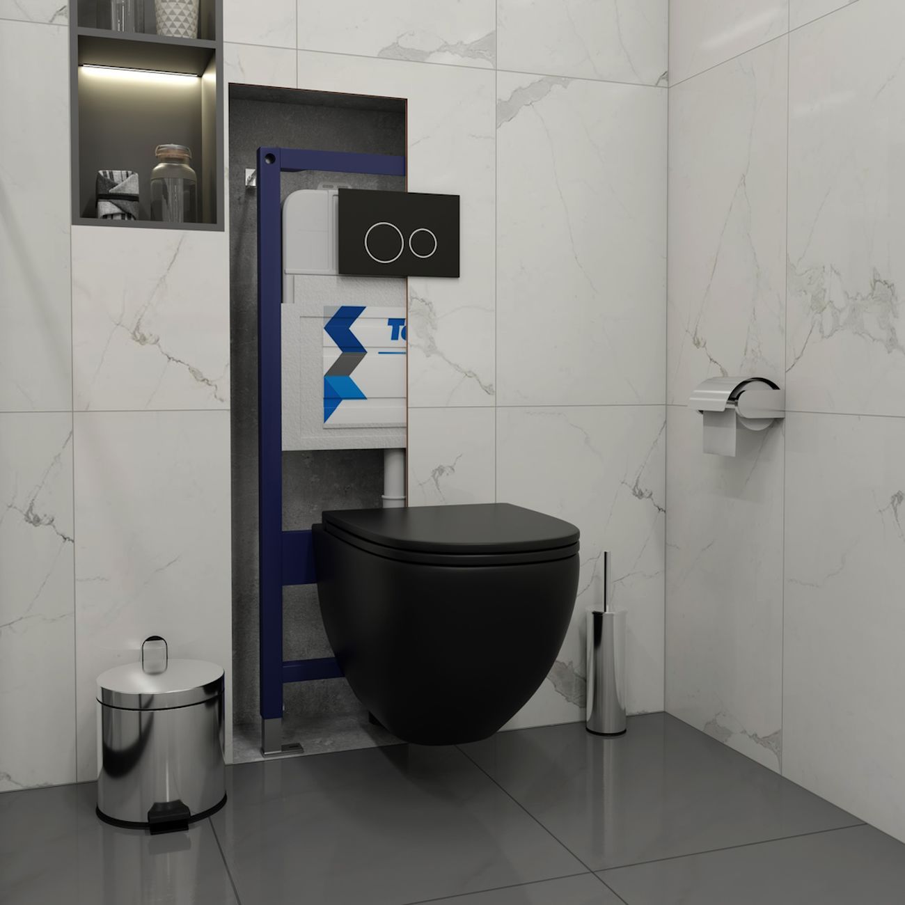 Комплект «Готовое решение» для установки инсталляции с подвесным унитазом включает: -- инсталляция TEYMI AINA 52 T70011 – монтажная рама из стального профиля толщиной 1.5 мм увеличенной ширины 52,5 см с дополнительными вертикальными усиливающими стойками, что позволяет выдерживать нагрузки до 400 кг; -- клавиша смыва TEYMI LINA T70105, цвет ЧЕРНЫЙ МАТОВЫЙ, ОКАНТОВКА ХРОМ; -- унитаз подвесной TEYMI LINA S BLACK T40111; -- быстросъёмное сиденье с микролифтом; -- полный комплект арматуры для монтажа, включающий в себя уплотнительные кольца и манжеты, трубу смыва, фановый отвод с удлинителем, защитный кожух ревизионного окна с крепежной рамкой, закрывающей панелью и крышкой; -- полный комплект крепежа для установки, а именно: крепеж к стене, шпильки для унитаза, крепежная рамка, соединительные шпильки, толкатели; -- инструкция по установке и обслуживанию. Преимущества комплекта «Готовое решение» для установки инсталляции с подвесным унитазом: -- полная (максимальная) комплектация для установки - больше ничего докупать не придётся; -- все составляющие комплекта идеально подходят друг к другу; -- взаимозаменяемость комплектующих; -- рама покрыта суперпрочной порошковой краской с антикоррозионными свойствами; -- высота рамы может регулироваться с ходом до 20 см с помощью ножек, изготовленных из оцинкованной стали; -- сливной бачок скрытого монтажа изготовлен из современных полимерных материалов и является цельнолитым (бесшовным), что позволяет ему работать без протечек в течение всего периода эксплуатации; -- лёгкость обслуживания сливного бачка достигается благодаря удобному ревизионному окну, скрытому за клавишей смыва; -- клавиша смыва имеет две кнопки и работает в режиме ЭКОНОМ / ПОЛНЫЙ (объёмы смыва 3 / 6 литров); -- гарантия на весь комплект составляет 10 лет, а рама прослужит все 50. Уважаемые покупатели, обращаем ваше внимание на то, что система инсталляции TEYMI AINA 52 может быть также укомплектована другими клавишами смыва или подвесными унитазами от бренда TEYMI (вы можете найти их на этом сайте по указанным артикулам). Предлагаем вам рассмотреть варианты сочетания со следующими клавишами: : HELMI хром T70202CH : HELMI черная T70203BM : HELMI белая T70018WM : LINA хром T70102CH : LINA черная T70103BM : LINA белая T70019WM : AINA хром T70012CH : AINA черная T70013BM : AINA белая T70020WM : KATI хром T70701CH : KATI черная T70702BM : KATI белая T70021WM : ELLIE хром T70022CH : ELLIE черная T70023BM : ELLIE белая T70024WM Также просим обратить взгляд на наши лучшие безободковые подвесные унитазы: : SOLLI T40201 : LINA S T40102 : HELMI S T40302 : HELMI VORTEX T40303 : IVA T40601 : ELLIE T40802 : LINA MEDIA T40105 : KATI T40701 : HANNA PRO T40901 : HELMI S BLACK T40302MB : VITRA PRO T40806 : VITRA T40804 : DEMI T40208 : LINA VORTEX T40110 : RITTA T40809 : LINA PRO T40106 : LINA S BLACK T40111