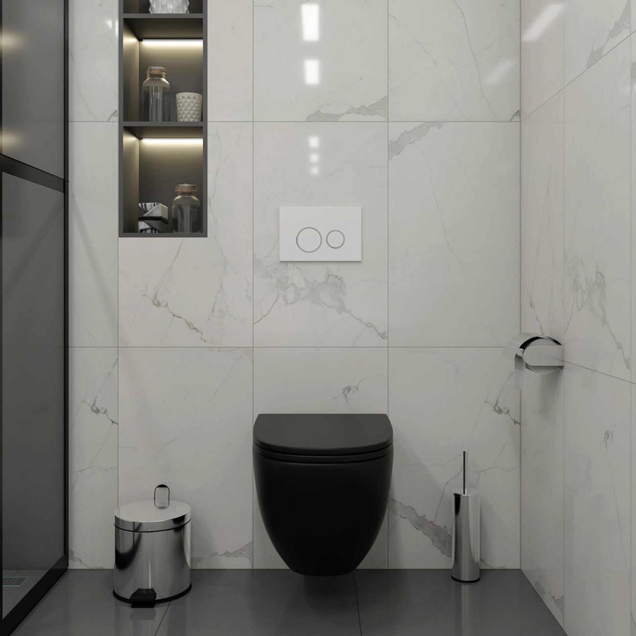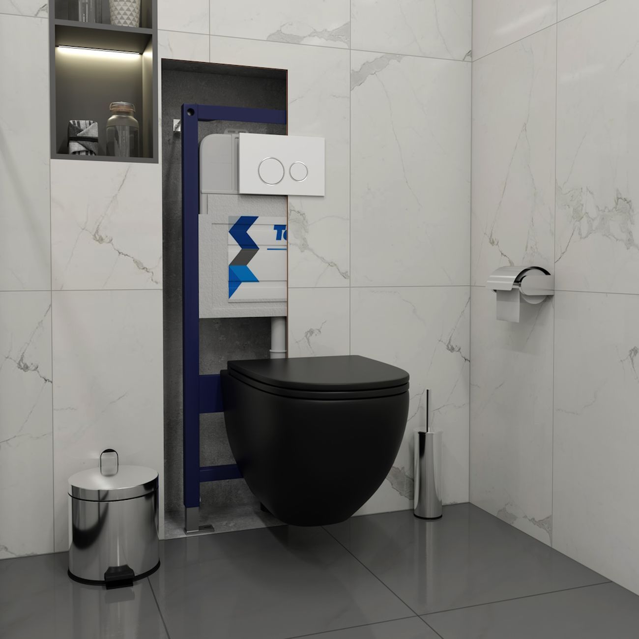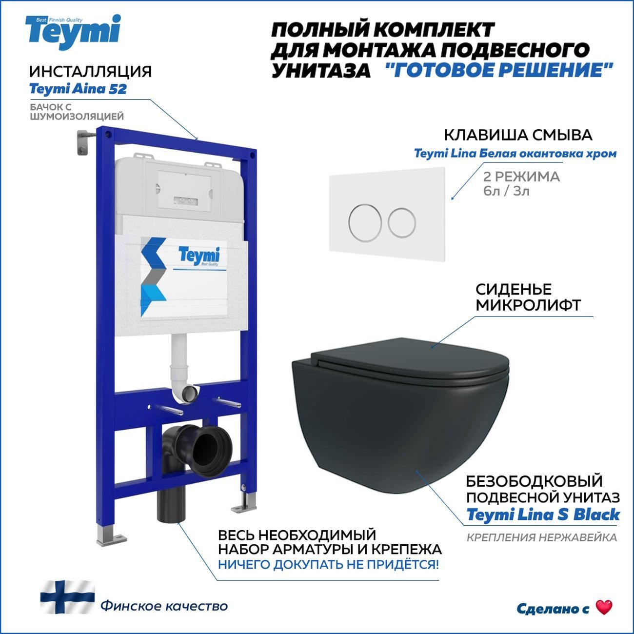 Комплект «Готовое решение» для установки инсталляции с подвесным унитазом включает: -- инсталляция TEYMI AINA 52 T70011 – монтажная рама из стального профиля толщиной 1.5 мм увеличенной ширины 52,5 см с дополнительными вертикальными усиливающими стойками, что позволяет выдерживать нагрузки до 400 кг; -- клавиша смыва TEYMI LINA T70106, цвет БЕЛЫЙ МАТОВЫЙ, ОКАНТОВКА ХРОМ; -- унитаз подвесной TEYMI LINA S BLACK T40111; -- быстросъёмное сиденье с микролифтом; -- полный комплект арматуры для монтажа, включающий в себя уплотнительные кольца и манжеты, трубу смыва, фановый отвод с удлинителем, защитный кожух ревизионного окна с крепежной рамкой, закрывающей панелью и крышкой; -- полный комплект крепежа для установки, а именно: крепеж к стене, шпильки для унитаза, крепежная рамка, соединительные шпильки, толкатели; -- инструкция по установке и обслуживанию. Преимущества комплекта «Готовое решение» для установки инсталляции с подвесным унитазом: -- полная (максимальная) комплектация для установки - больше ничего докупать не придётся; -- все составляющие комплекта идеально подходят друг к другу; -- взаимозаменяемость комплектующих; -- рама покрыта суперпрочной порошковой краской с антикоррозионными свойствами; -- высота рамы может регулироваться с ходом до 20 см с помощью ножек, изготовленных из оцинкованной стали; -- сливной бачок скрытого монтажа изготовлен из современных полимерных материалов и является цельнолитым (бесшовным), что позволяет ему работать без протечек в течение всего периода эксплуатации; -- лёгкость обслуживания сливного бачка достигается благодаря удобному ревизионному окну, скрытому за клавишей смыва; -- клавиша смыва имеет две кнопки и работает в режиме ЭКОНОМ / ПОЛНЫЙ (объёмы смыва 3 / 6 литров); -- гарантия на весь комплект составляет 10 лет, а рама прослужит все 50. Уважаемые покупатели, обращаем ваше внимание на то, что система инсталляции TEYMI AINA 52 может быть также укомплектована другими клавишами смыва или подвесными унитазами от бренда TEYMI (вы можете найти их на этом сайте по указанным артикулам). Предлагаем вам рассмотреть варианты сочетания со следующими клавишами: : HELMI хром T70202CH : HELMI черная T70203BM : HELMI белая T70018WM : LINA хром T70102CH : LINA черная T70103BM : LINA белая T70019WM : AINA хром T70012CH : AINA черная T70013BM : AINA белая T70020WM : KATI хром T70701CH : KATI черная T70702BM : KATI белая T70021WM : ELLIE хром T70022CH : ELLIE черная T70023BM : ELLIE белая T70024WM Также просим обратить взгляд на наши лучшие безободковые подвесные унитазы: : SOLLI T40201 : LINA S T40102 : HELMI S T40302 : HELMI VORTEX T40303 : IVA T40601 : ELLIE T40802 : LINA MEDIA T40105 : KATI T40701 : HANNA PRO T40901 : HELMI S BLACK T40302MB : VITRA PRO T40806 : VITRA T40804 : DEMI T40208 : LINA VORTEX T40110 : RITTA T40809 : LINA PRO T40106 : LINA S BLACK T40111