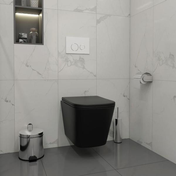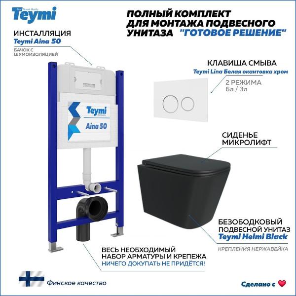 Комплект «Готовое решение» для установки инсталляции с подвесным унитазом: -- инсталляция TEYMI AINA 50 T70033 – монтажная рама из цельного стального профиля прямоугольного сечения, позволяющая выдерживать нагрузки до 400 кг. Габаритная ширина рамы 525 мм; -- клавиша смыва TEYMI LINA T70106, цвет БЕЛЫЙ МАТОВЫЙ, ОКАНТОВКА ХРОМ; -- унитаз подвесной TEYMI HELMI S T40302MB черный; -- быстросъёмное сиденье с микролифтом; -- полный комплект арматуры для монтажа, включающий в себя уплотнительные кольца и манжеты, трубу смыва, фановый отвод с удлинителем, защитный кожух ревизионного окна с крепежной рамкой, закрывающей панелью и крышкой; -- полный комплект крепежа для установки, а именно: крепеж к стене, шпильки для унитаза, крепежная рамка, соединительные шпильки, толкатели; -- инструкция по установке и обслуживанию. Преимущества комплекта: -- полная (максимальная) комплектация для установки - больше ничего докупать не придётся; -- все составляющие комплекта идеально подходят друг к другу; -- рама покрыта суперпрочной порошковой краской синего цвета с антикоррозионными свойствами; -- высота монтажной рамы может регулироваться с ходом до 20 см с помощью ножек из оцинкованной стали; -- универсальный монтаж – межосевое расстояние под шпильки для подвесного унитаза 180 и 230 мм – подходит ко всем подвесным унитазам; -- сливной бачок скрытого монтажа, изготовленный из полиэтилена низкого давления, рассчитан на 200 тысяч циклов смыва, а цельнолитая бесшовная конструкция позволит работать без протечек в течение всего периода эксплуатации; -- 2-режимный слив 3 / 6 л с возможностью регулировки; -- лёгкость обслуживания бачка благодаря ревизионному окну, скрытому за клавишей смыва; -- гарантия 10 лет на весь комплект и 50 лет на стальную раму. Размер инсталляции с бачком: высота 1055 мм Х ширина 525 мм Х глубина 96 мм. Уважаемые покупатели, обращаем ваше внимание на то, что система инсталляции TEYMI AINA 50 может быть также укомплектована другими клавишами смыва или подвесными унитазами от бренда TEYMI (вы можете найти их на этом сайте по указанным артикулам). Предлагаем вам рассмотреть варианты сочетания со следующими клавишами: : HELMI хром T70202CH : HELMI черная T70203BM : HELMI белая T70018WM : HELMI нержавеющая сталь T70204 : HELMI черный матовый T70205 : HELMI белый глянцевый T70206 : LINA хром T70102CH : LINA черная T70103BM : LINA белая T70019WM : LINA нержавеющая сталь T70104 : LINA черный матовый T70105 : LINA белый матовый T70106 : AINA хром T70012CH : AINA черная T70013BM : AINA белая T70020WM : AINA нержавеющая сталь T70014 : KATI хром T70701CH : KATI черная T70702BM : KATI белая T70021WM : ELLIE хром T70022CH : ELLIE черная T70023BM : ELLIE белая T70024WM Также просим обратить взгляд на наши лучшие безободковые подвесные унитазы: : SOLLI T40201 : LINA S T40102 : HELMI S T40302 : HELMI VORTEX T40303 : IVA T40601 : ELLIE T40802 : LINA MEDIA T40105 : KATI T40701 : HANNA PRO T40901 : HELMI S BLACK T40302MB : VITRA PRO T40806 : VITRA T40804 : DEMI T40208 : LINA VORTEX T40110 : RITTA T40809 : LINA PRO T40106 : LINA S BLACK T40111