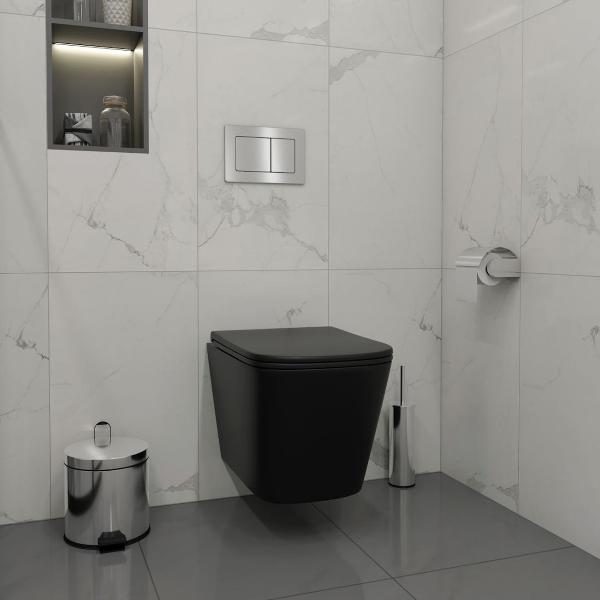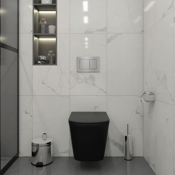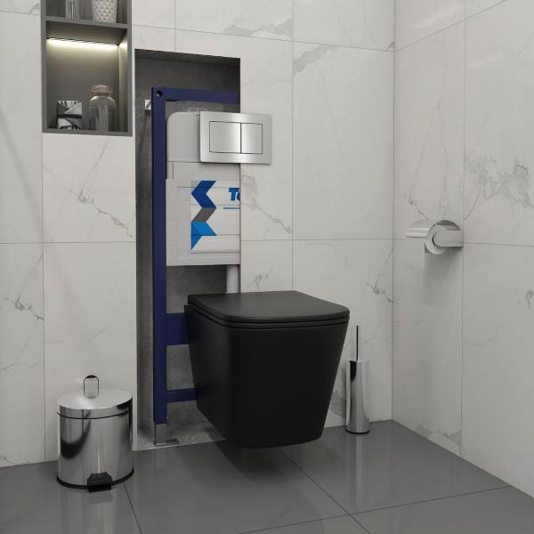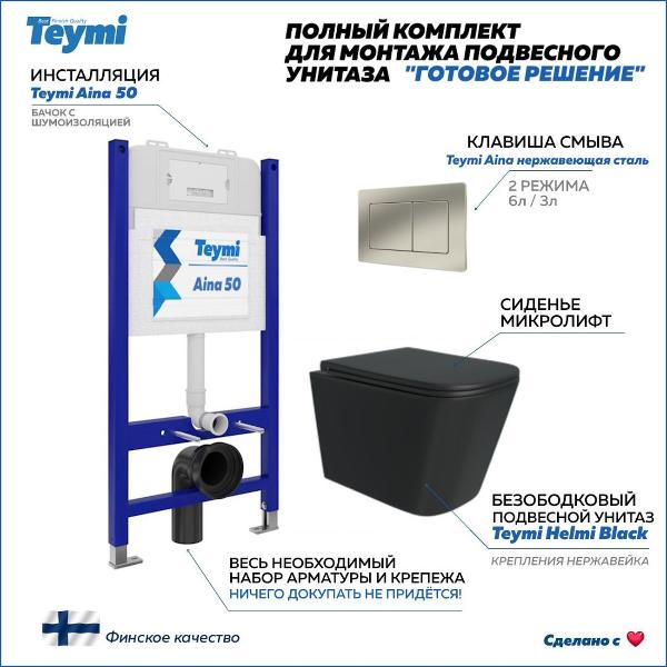 Комплект «Готовое решение» для установки инсталляции с подвесным унитазом: -- инсталляция TEYMI AINA 50 T70033 – монтажная рама из цельного стального профиля прямоугольного сечения, позволяющая выдерживать нагрузки до 400 кг. Габаритная ширина рамы 525 мм; -- клавиша смыва TEYMI AINA T70014, корпус нержавеющая сталь, цвет НЕРЖАВЕЮЩАЯ СТАЛЬ МАТОВЫЙ; -- унитаз подвесной TEYMI HELMI S T40302MB черный; -- быстросъёмное сиденье с микролифтом; -- полный комплект арматуры для монтажа, включающий в себя уплотнительные кольца и манжеты, трубу смыва, фановый отвод с удлинителем, защитный кожух ревизионного окна с крепежной рамкой, закрывающей панелью и крышкой; -- полный комплект крепежа для установки, а именно: крепеж к стене, шпильки для унитаза, крепежная рамка, соединительные шпильки, толкатели; -- инструкция по установке и обслуживанию. Преимущества комплекта: -- полная (максимальная) комплектация для установки - больше ничего докупать не придётся; -- все составляющие комплекта идеально подходят друг к другу; -- рама покрыта суперпрочной порошковой краской синего цвета с антикоррозионными свойствами; -- высота монтажной рамы может регулироваться с ходом до 20 см с помощью ножек из оцинкованной стали; -- универсальный монтаж – межосевое расстояние под шпильки для подвесного унитаза 180 и 230 мм – подходит ко всем подвесным унитазам; -- сливной бачок скрытого монтажа, изготовленный из полиэтилена низкого давления, рассчитан на 200 тысяч циклов смыва, а цельнолитая бесшовная конструкция позволит работать без протечек в течение всего периода эксплуатации; -- 2-режимный слив 3 / 6 л с возможностью регулировки; -- лёгкость обслуживания бачка благодаря ревизионному окну, скрытому за клавишей смыва; -- гарантия 10 лет на весь комплект и 50 лет на стальную раму. Размер инсталляции с бачком: высота 1055 мм Х ширина 525 мм Х глубина 96 мм. Уважаемые покупатели, обращаем ваше внимание на то, что система инсталляции TEYMI AINA 50 может быть также укомплектована другими клавишами смыва или подвесными унитазами от бренда TEYMI (вы можете найти их на этом сайте по указанным артикулам). Предлагаем вам рассмотреть варианты сочетания со следующими клавишами: : HELMI хром T70202CH : HELMI черная T70203BM : HELMI белая T70018WM : HELMI нержавеющая сталь T70204 : HELMI черный матовый T70205 : HELMI белый глянцевый T70206 : LINA хром T70102CH : LINA черная T70103BM : LINA белая T70019WM : LINA нержавеющая сталь T70104 : LINA черный матовый T70105 : LINA белый матовый T70106 : AINA хром T70012CH : AINA черная T70013BM : AINA белая T70020WM : AINA нержавеющая сталь T70014 : KATI хром T70701CH : KATI черная T70702BM : KATI белая T70021WM : ELLIE хром T70022CH : ELLIE черная T70023BM : ELLIE белая T70024WM Также просим обратить взгляд на наши лучшие безободковые подвесные унитазы: : SOLLI T40201 : LINA S T40102 : HELMI S T40302 : HELMI VORTEX T40303 : IVA T40601 : ELLIE T40802 : LINA MEDIA T40105 : KATI T40701 : HANNA PRO T40901 : HELMI S BLACK T40302MB : VITRA PRO T40806 : VITRA T40804 : DEMI T40208 : LINA VORTEX T40110 : RITTA T40809 : LINA PRO T40106 : LINA S BLACK T40111