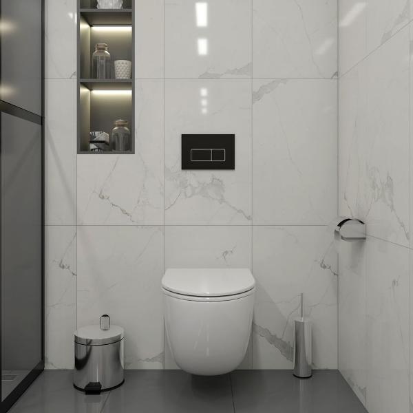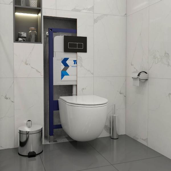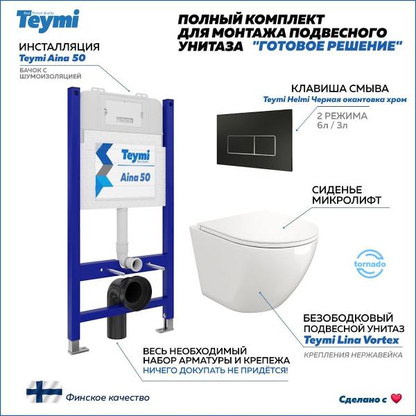 Комплект «Готовое решение» для установки инсталляции с подвесным унитазом: -- инсталляция TEYMI AINA 50 T70033 – монтажная рама из цельного стального профиля прямоугольного сечения, позволяющая выдерживать нагрузки до 400 кг. Габаритная ширина рамы 525 мм; -- клавиша смыва TEYMI HELMI T70205, цвет ЧЕРНЫЙ МАТОВЫЙ, ОКАНТОВКА ХРОМ; -- унитаз подвесной TEYMI LINA VORTEX T40110; -- быстросъёмное сиденье с микролифтом; -- полный комплект арматуры для монтажа, включающий в себя уплотнительные кольца и манжеты, трубу смыва, фановый отвод с удлинителем, защитный кожух ревизионного окна с крепежной рамкой, закрывающей панелью и крышкой; -- полный комплект крепежа для установки, а именно: крепеж к стене, шпильки для унитаза, крепежная рамка, соединительные шпильки, толкатели; -- инструкция по установке и обслуживанию. Преимущества комплекта: -- полная (максимальная) комплектация для установки - больше ничего докупать не придётся; -- все составляющие комплекта идеально подходят друг к другу; -- рама покрыта суперпрочной порошковой краской синего цвета с антикоррозионными свойствами; -- высота монтажной рамы может регулироваться с ходом до 20 см с помощью ножек из оцинкованной стали; -- универсальный монтаж – межосевое расстояние под шпильки для подвесного унитаза 180 и 230 мм – подходит ко всем подвесным унитазам; -- сливной бачок скрытого монтажа, изготовленный из полиэтилена низкого давления, рассчитан на 200 тысяч циклов смыва, а цельнолитая бесшовная конструкция позволит работать без протечек в течение всего периода эксплуатации; -- 2-режимный слив 3 / 6 л с возможностью регулировки; -- лёгкость обслуживания бачка благодаря ревизионному окну, скрытому за клавишей смыва; -- гарантия 10 лет на весь комплект и 50 лет на стальную раму. Размер инсталляции с бачком: высота 1055 мм Х ширина 525 мм Х глубина 96 мм. Уважаемые покупатели, обращаем ваше внимание на то, что система инсталляции TEYMI AINA 50 может быть также укомплектована другими клавишами смыва или подвесными унитазами от бренда TEYMI (вы можете найти их на этом сайте по указанным артикулам). Предлагаем вам рассмотреть варианты сочетания со следующими клавишами: : HELMI хром T70202CH : HELMI черная T70203BM : HELMI белая T70018WM : HELMI нержавеющая сталь T70204 : HELMI черный матовый T70205 : HELMI белый глянцевый T70206 : LINA хром T70102CH : LINA черная T70103BM : LINA белая T70019WM : LINA нержавеющая сталь T70104 : LINA черный матовый T70105 : LINA белый матовый T70106 : AINA хром T70012CH : AINA черная T70013BM : AINA белая T70020WM : AINA нержавеющая сталь T70014 : KATI хром T70701CH : KATI черная T70702BM : KATI белая T70021WM : ELLIE хром T70022CH : ELLIE черная T70023BM : ELLIE белая T70024WM Также просим обратить взгляд на наши лучшие безободковые подвесные унитазы: : SOLLI T40201 : LINA S T40102 : HELMI S T40302 : HELMI VORTEX T40303 : IVA T40601 : ELLIE T40802 : LINA MEDIA T40105 : KATI T40701 : HANNA PRO T40901 : HELMI S BLACK T40302MB : VITRA PRO T40806 : VITRA T40804 : DEMI T40208 : LINA VORTEX T40110 : RITTA T40809 : LINA PRO T40106 : LINA S BLACK T40111