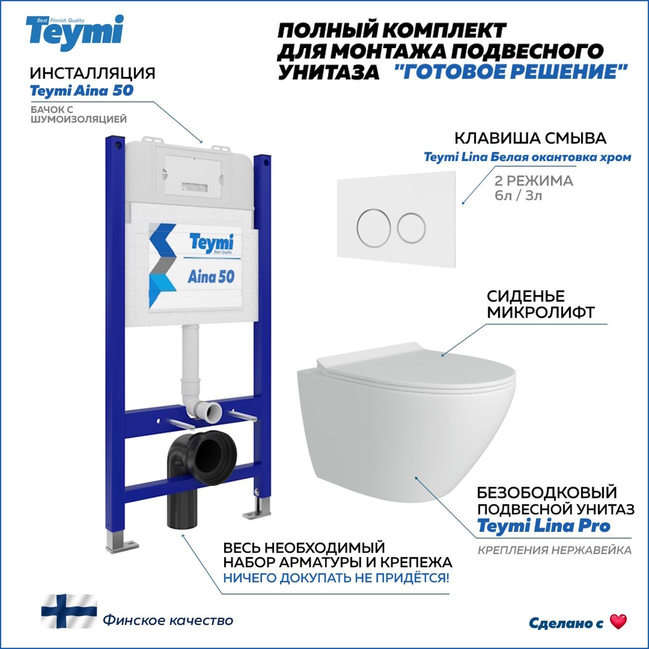 Комплект «Готовое решение» для установки инсталляции с подвесным унитазом: -- инсталляция TEYMI AINA 50 T70033 – монтажная рама из цельного стального профиля прямоугольного сечения, позволяющая выдерживать нагрузки до 400 кг. Габаритная ширина рамы 525 мм; -- клавиша смыва TEYMI LINA T70106, цвет БЕЛЫЙ МАТОВЫЙ, ОКАНТОВКА ХРОМ; -- унитаз подвесной TEYMI LINA PRO T40106; -- быстросъёмное сиденье с микролифтом; -- полный комплект арматуры для монтажа, включающий в себя уплотнительные кольца и манжеты, трубу смыва, фановый отвод с удлинителем, защитный кожух ревизионного окна с крепежной рамкой, закрывающей панелью и крышкой; -- полный комплект крепежа для установки, а именно: крепеж к стене, шпильки для унитаза, крепежная рамка, соединительные шпильки, толкатели; -- инструкция по установке и обслуживанию. Преимущества комплекта: -- полная (максимальная) комплектация для установки - больше ничего докупать не придётся; -- все составляющие комплекта идеально подходят друг к другу; -- рама покрыта суперпрочной порошковой краской синего цвета с антикоррозионными свойствами; -- высота монтажной рамы может регулироваться с ходом до 20 см с помощью ножек из оцинкованной стали; -- универсальный монтаж – межосевое расстояние под шпильки для подвесного унитаза 180 и 230 мм – подходит ко всем подвесным унитазам; -- сливной бачок скрытого монтажа, изготовленный из полиэтилена низкого давления, рассчитан на 200 тысяч циклов смыва, а цельнолитая бесшовная конструкция позволит работать без протечек в течение всего периода эксплуатации; -- 2-режимный слив 3 / 6 л с возможностью регулировки; -- лёгкость обслуживания бачка благодаря ревизионному окну, скрытому за клавишей смыва; -- гарантия 10 лет на весь комплект и 50 лет на стальную раму. Размер инсталляции с бачком: высота 1055 мм Х ширина 525 мм Х глубина 96 мм. Уважаемые покупатели, обращаем ваше внимание на то, что система инсталляции TEYMI AINA 50 может быть также укомплектована другими клавишами смыва или подвесными унитазами от бренда TEYMI (вы можете найти их на этом сайте по указанным артикулам). Предлагаем вам рассмотреть варианты сочетания со следующими клавишами: : HELMI хром T70202CH : HELMI черная T70203BM : HELMI белая T70018WM : HELMI нержавеющая сталь T70204 : HELMI черный матовый T70205 : HELMI белый глянцевый T70206 : LINA хром T70102CH : LINA черная T70103BM : LINA белая T70019WM : LINA нержавеющая сталь T70104 : LINA черный матовый T70105 : LINA белый матовый T70106 : AINA хром T70012CH : AINA черная T70013BM : AINA белая T70020WM : AINA нержавеющая сталь T70014 : KATI хром T70701CH : KATI черная T70702BM : KATI белая T70021WM : ELLIE хром T70022CH : ELLIE черная T70023BM : ELLIE белая T70024WM Также просим обратить взгляд на наши лучшие безободковые подвесные унитазы: : SOLLI T40201 : LINA S T40102 : HELMI S T40302 : HELMI VORTEX T40303 : IVA T40601 : ELLIE T40802 : LINA MEDIA T40105 : KATI T40701 : HANNA PRO T40901 : HELMI S BLACK T40302MB : VITRA PRO T40806 : VITRA T40804 : DEMI T40208 : LINA VORTEX T40110 : RITTA T40809 : LINA PRO T40106 : LINA S BLACK T40111