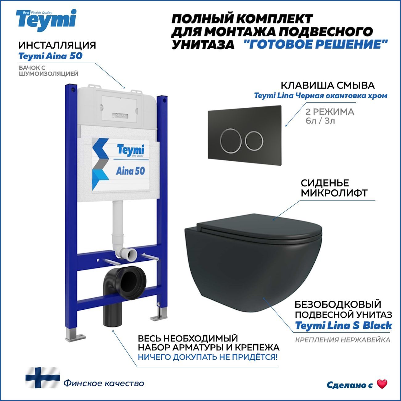 Комплект «Готовое решение» для установки инсталляции с подвесным унитазом: -- инсталляция TEYMI AINA 50 T70033 – монтажная рама из цельного стального профиля прямоугольного сечения, позволяющая выдерживать нагрузки до 400 кг. Габаритная ширина рамы 525 мм; -- клавиша смыва TEYMI LINA T70105, цвет ЧЕРНЫЙ МАТОВЫЙ, ОКАНТОВКА ХРОМ; -- унитаз подвесной TEYMI Lina S Black черный T40111; -- быстросъёмное сиденье с микролифтом; -- полный комплект арматуры для монтажа, включающий в себя уплотнительные кольца и манжеты, трубу смыва, фановый отвод с удлинителем, защитный кожух ревизионного окна с крепежной рамкой, закрывающей панелью и крышкой; -- полный комплект крепежа для установки, а именно: крепеж к стене, шпильки для унитаза, крепежная рамка, соединительные шпильки, толкатели; -- инструкция по установке и обслуживанию. Преимущества комплекта: -- полная (максимальная) комплектация для установки - больше ничего докупать не придётся; -- все составляющие комплекта идеально подходят друг к другу; -- рама покрыта суперпрочной порошковой краской синего цвета с антикоррозионными свойствами; -- высота монтажной рамы может регулироваться с ходом до 20 см с помощью ножек из оцинкованной стали; -- универсальный монтаж – межосевое расстояние под шпильки для подвесного унитаза 180 и 230 мм – подходит ко всем подвесным унитазам; -- сливной бачок скрытого монтажа, изготовленный из полиэтилена низкого давления, рассчитан на 200 тысяч циклов смыва, а цельнолитая бесшовная конструкция позволит работать без протечек в течение всего периода эксплуатации; -- 2-режимный слив 3 / 6 л с возможностью регулировки; -- лёгкость обслуживания бачка благодаря ревизионному окну, скрытому за клавишей смыва; -- гарантия 10 лет на весь комплект и 50 лет на стальную раму. Размер инсталляции с бачком: высота 1055 мм Х ширина 525 мм Х глубина 96 мм. Уважаемые покупатели, обращаем ваше внимание на то, что система инсталляции TEYMI AINA 50 может быть также укомплектована другими клавишами смыва или подвесными унитазами от бренда TEYMI (вы можете найти их на этом сайте по указанным артикулам). Предлагаем вам рассмотреть варианты сочетания со следующими клавишами: : HELMI хром T70202CH : HELMI черная T70203BM : HELMI белая T70018WM : HELMI нержавеющая сталь T70204 : HELMI черный матовый T70205 : HELMI белый глянцевый T70206 : LINA хром T70102CH : LINA черная T70103BM : LINA белая T70019WM : LINA нержавеющая сталь T70104 : LINA черный матовый T70105 : LINA белый матовый T70106 : AINA хром T70012CH : AINA черная T70013BM : AINA белая T70020WM : AINA нержавеющая сталь T70014 : KATI хром T70701CH : KATI черная T70702BM : KATI белая T70021WM : ELLIE хром T70022CH : ELLIE черная T70023BM : ELLIE белая T70024WM Также просим обратить взгляд на наши лучшие безободковые подвесные унитазы: : SOLLI T40201 : LINA S T40102 : HELMI S T40302 : HELMI VORTEX T40303 : IVA T40601 : ELLIE T40802 : LINA MEDIA T40105 : KATI T40701 : HANNA PRO T40901 : HELMI S BLACK T40302MB : VITRA PRO T40806 : VITRA T40804 : DEMI T40208 : LINA VORTEX T40110 : RITTA T40809 : LINA PRO T40106 : LINA S BLACK T40111
