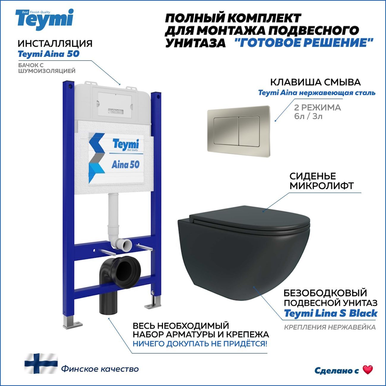 Комплект «Готовое решение» для установки инсталляции с подвесным унитазом: -- инсталляция TEYMI AINA 50 T70033 – монтажная рама из цельного стального профиля прямоугольного сечения, позволяющая выдерживать нагрузки до 400 кг. Габаритная ширина рамы 525 мм; -- клавиша смыва TEYMI AINA T70014, корпус нержавеющая сталь, цвет НЕРЖАВЕЮЩАЯ СТАЛЬ МАТОВЫЙ; -- унитаз подвесной TEYMI Lina S Black черный T40111; -- быстросъёмное сиденье с микролифтом; -- полный комплект арматуры для монтажа, включающий в себя уплотнительные кольца и манжеты, трубу смыва, фановый отвод с удлинителем, защитный кожух ревизионного окна с крепежной рамкой, закрывающей панелью и крышкой; -- полный комплект крепежа для установки, а именно: крепеж к стене, шпильки для унитаза, крепежная рамка, соединительные шпильки, толкатели; -- инструкция по установке и обслуживанию. Преимущества комплекта: -- полная (максимальная) комплектация для установки - больше ничего докупать не придётся; -- все составляющие комплекта идеально подходят друг к другу; -- рама покрыта суперпрочной порошковой краской синего цвета с антикоррозионными свойствами; -- высота монтажной рамы может регулироваться с ходом до 20 см с помощью ножек из оцинкованной стали; -- универсальный монтаж – межосевое расстояние под шпильки для подвесного унитаза 180 и 230 мм – подходит ко всем подвесным унитазам; -- сливной бачок скрытого монтажа, изготовленный из полиэтилена низкого давления, рассчитан на 200 тысяч циклов смыва, а цельнолитая бесшовная конструкция позволит работать без протечек в течение всего периода эксплуатации; -- 2-режимный слив 3 / 6 л с возможностью регулировки; -- лёгкость обслуживания бачка благодаря ревизионному окну, скрытому за клавишей смыва; -- гарантия 10 лет на весь комплект и 50 лет на стальную раму. Размер инсталляции с бачком: высота 1055 мм Х ширина 525 мм Х глубина 96 мм. Уважаемые покупатели, обращаем ваше внимание на то, что система инсталляции TEYMI AINA 50 может быть также укомплектована другими клавишами смыва или подвесными унитазами от бренда TEYMI (вы можете найти их на этом сайте по указанным артикулам). Предлагаем вам рассмотреть варианты сочетания со следующими клавишами: : HELMI хром T70202CH : HELMI черная T70203BM : HELMI белая T70018WM : HELMI нержавеющая сталь T70204 : HELMI черный матовый T70205 : HELMI белый глянцевый T70206 : LINA хром T70102CH : LINA черная T70103BM : LINA белая T70019WM : LINA нержавеющая сталь T70104 : LINA черный матовый T70105 : LINA белый матовый T70106 : AINA хром T70012CH : AINA черная T70013BM : AINA белая T70020WM : AINA нержавеющая сталь T70014 : KATI хром T70701CH : KATI черная T70702BM : KATI белая T70021WM : ELLIE хром T70022CH : ELLIE черная T70023BM : ELLIE белая T70024WM Также просим обратить взгляд на наши лучшие безободковые подвесные унитазы: : SOLLI T40201 : LINA S T40102 : HELMI S T40302 : HELMI VORTEX T40303 : IVA T40601 : ELLIE T40802 : LINA MEDIA T40105 : KATI T40701 : HANNA PRO T40901 : HELMI S BLACK T40302MB : VITRA PRO T40806 : VITRA T40804 : DEMI T40208 : LINA VORTEX T40110 : RITTA T40809 : LINA PRO T40106 : LINA S BLACK T40111