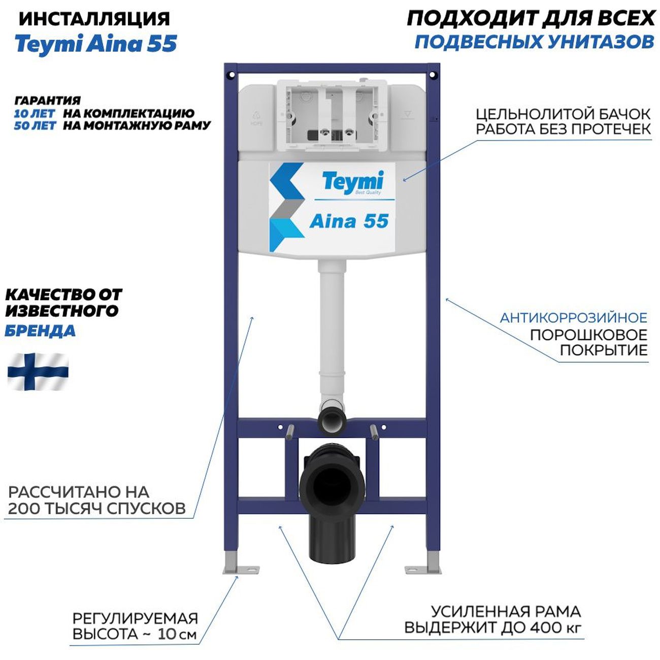 Комплект «Готовое решение» для установки инсталляции с подвесным унитазом: -- инсталляция TEYMI AINA 55 T70035 – монтажная рама из цельного стального профиля прямоугольного сечения, позволяющая выдерживать нагрузки до 400 кг. Габаритная ширина рамы 470 мм; -- клавиша смыва TEYMI LINA T70019WM, цвет БЕЛЫЙ МАТОВЫЙ; -- унитаз подвесной безободковый TEYMI VITRA PRO T40806; -- сиденье с микролифтом; -- полный комплект арматуры для монтажа: уплотнительные кольца, манжеты, труба смыва, фановый отвод с удлинителем, защитный кожух ревизионного окна с крепежной рамкой, закрывающей панелью и крышкой; -- полный комплект крепежа для установки: крепеж к стене, шпильки для унитаза, крепежная рамка, соединительные шпильки, толкатели, фиксаторы; -- инструкция по установке и обслуживанию. Преимущества комплекта: -- полная (максимальная) комплектация для установки - больше ничего докупать не придётся; -- все составляющие комплекта идеально подходят друг к другу; -- рама покрыта суперпрочной порошковой краской синего цвета с антикоррозионными свойствами; -- высота монтажной рамы может регулироваться с помощью ножек из оцинкованной стали; -- универсальный монтаж – межосевое расстояние под шпильки для подвесного унитаза 180 и 230 мм – подходит ко всем подвесным унитазам; -- сливной бачок скрытого монтажа, изготовленный из полиэтилена низкого давления, рассчитан на 200 тысяч циклов смыва, а цельнолитая бесшовная конструкция позволит работать без протечек в течение всего периода эксплуатации; -- 2-режимный слив 3 / 6 л с возможностью регулировки; -- лёгкость обслуживания бачка благодаря ревизионному окну, скрытому за клавишей смыва; -- гарантия 10 лет на весь комплект и 50 лет на стальную раму. Размер изделия: высота 1130 мм (регулируется) Х ширина 470 мм Х глубина 102 мм. Уважаемые покупатели, обращаем ваше внимание на то, что система инсталляции TEYMI AINA 55 может быть также укомплектована другими клавишами смыва или подвесными унитазами от бренда TEYMI (вы можете найти их на этом сайте по указанным артикулам). Предлагаем вам рассмотреть варианты сочетания со следующими клавишами: : HELMI хром T70202CH : HELMI черная T70203BM : HELMI белая T70018WM : HELMI нержавеющая сталь T70204 : HELMI черный матовый T70205 : HELMI белый глянцевый T70206 : LINA хром T70102CH : LINA черная T70103BM : LINA белая T70019WM : LINA нержавеющая сталь T70104 : LINA черный матовый T70105 : LINA белый матовый T70106 : AINA хром T70012CH : AINA черная T70013BM : AINA белая T70020WM : AINA нержавеющая сталь T70014 : KATI хром T70701CH : KATI черная T70702BM : KATI белая T70021WM : ELLIE хром T70022CH : ELLIE черная T70023BM : ELLIE белая T70024WM Также просим обратить взгляд на наши лучшие безободковые подвесные унитазы: : SOLLI T40201 : LINA S T40102 : HELMI S T40302 : HELMI VORTEX T40303 : IVA T40601 : ELLIE T40802 : LINA MEDIA T40105 : KATI T40701 : HANNA PRO T40901 : HELMI S BLACK T40302MB : VITRA PRO T40806 : VITRA T40804 : DEMI T40208 : LINA VORTEX T40110 : RITTA T40809 : LINA PRO T40106 : LINA S BLACK T40111