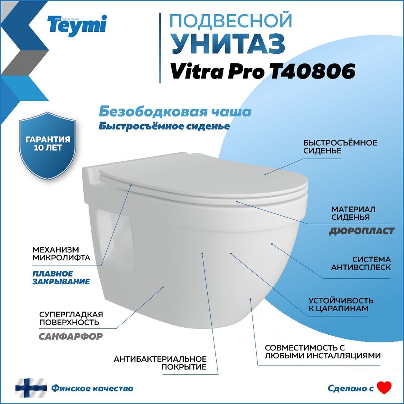 Комплект «Готовое решение» для установки инсталляции с подвесным унитазом: -- инсталляция TEYMI AINA 55 T70035 – монтажная рама из цельного стального профиля прямоугольного сечения, позволяющая выдерживать нагрузки до 400 кг. Габаритная ширина рамы 470 мм; -- клавиша смыва TEYMI AINA T70020WM, цвет БЕЛЫЙ МАТОВЫЙ; -- унитаз подвесной безободковый TEYMI VITRA PRO T40806; -- сиденье с микролифтом; -- полный комплект арматуры для монтажа: уплотнительные кольца, манжеты, труба смыва, фановый отвод с удлинителем, защитный кожух ревизионного окна с крепежной рамкой, закрывающей панелью и крышкой; -- полный комплект крепежа для установки: крепеж к стене, шпильки для унитаза, крепежная рамка, соединительные шпильки, толкатели, фиксаторы; -- инструкция по установке и обслуживанию. Преимущества комплекта: -- полная (максимальная) комплектация для установки - больше ничего докупать не придётся; -- все составляющие комплекта идеально подходят друг к другу; -- рама покрыта суперпрочной порошковой краской синего цвета с антикоррозионными свойствами; -- высота монтажной рамы может регулироваться с помощью ножек из оцинкованной стали; -- универсальный монтаж – межосевое расстояние под шпильки для подвесного унитаза 180 и 230 мм – подходит ко всем подвесным унитазам; -- сливной бачок скрытого монтажа, изготовленный из полиэтилена низкого давления, рассчитан на 200 тысяч циклов смыва, а цельнолитая бесшовная конструкция позволит работать без протечек в течение всего периода эксплуатации; -- 2-режимный слив 3 / 6 л с возможностью регулировки; -- лёгкость обслуживания бачка благодаря ревизионному окну, скрытому за клавишей смыва; -- гарантия 10 лет на весь комплект и 50 лет на стальную раму. Размер изделия: высота 1130 мм (регулируется) Х ширина 470 мм Х глубина 102 мм. Уважаемые покупатели, обращаем ваше внимание на то, что система инсталляции TEYMI AINA 55 может быть также укомплектована другими клавишами смыва или подвесными унитазами от бренда TEYMI (вы можете найти их на этом сайте по указанным артикулам). Предлагаем вам рассмотреть варианты сочетания со следующими клавишами: : HELMI хром T70202CH : HELMI черная T70203BM : HELMI белая T70018WM : HELMI нержавеющая сталь T70204 : HELMI черный матовый T70205 : HELMI белый глянцевый T70206 : LINA хром T70102CH : LINA черная T70103BM : LINA белая T70019WM : LINA нержавеющая сталь T70104 : LINA черный матовый T70105 : LINA белый матовый T70106 : AINA хром T70012CH : AINA черная T70013BM : AINA белая T70020WM : AINA нержавеющая сталь T70014 : KATI хром T70701CH : KATI черная T70702BM : KATI белая T70021WM : ELLIE хром T70022CH : ELLIE черная T70023BM : ELLIE белая T70024WM Также просим обратить взгляд на наши лучшие безободковые подвесные унитазы: : SOLLI T40201 : LINA S T40102 : HELMI S T40302 : HELMI VORTEX T40303 : IVA T40601 : ELLIE T40802 : LINA MEDIA T40105 : KATI T40701 : HANNA PRO T40901 : HELMI S BLACK T40302MB : VITRA PRO T40806 : VITRA T40804 : DEMI T40208 : LINA VORTEX T40110 : RITTA T40809 : LINA PRO T40106 : LINA S BLACK T40111