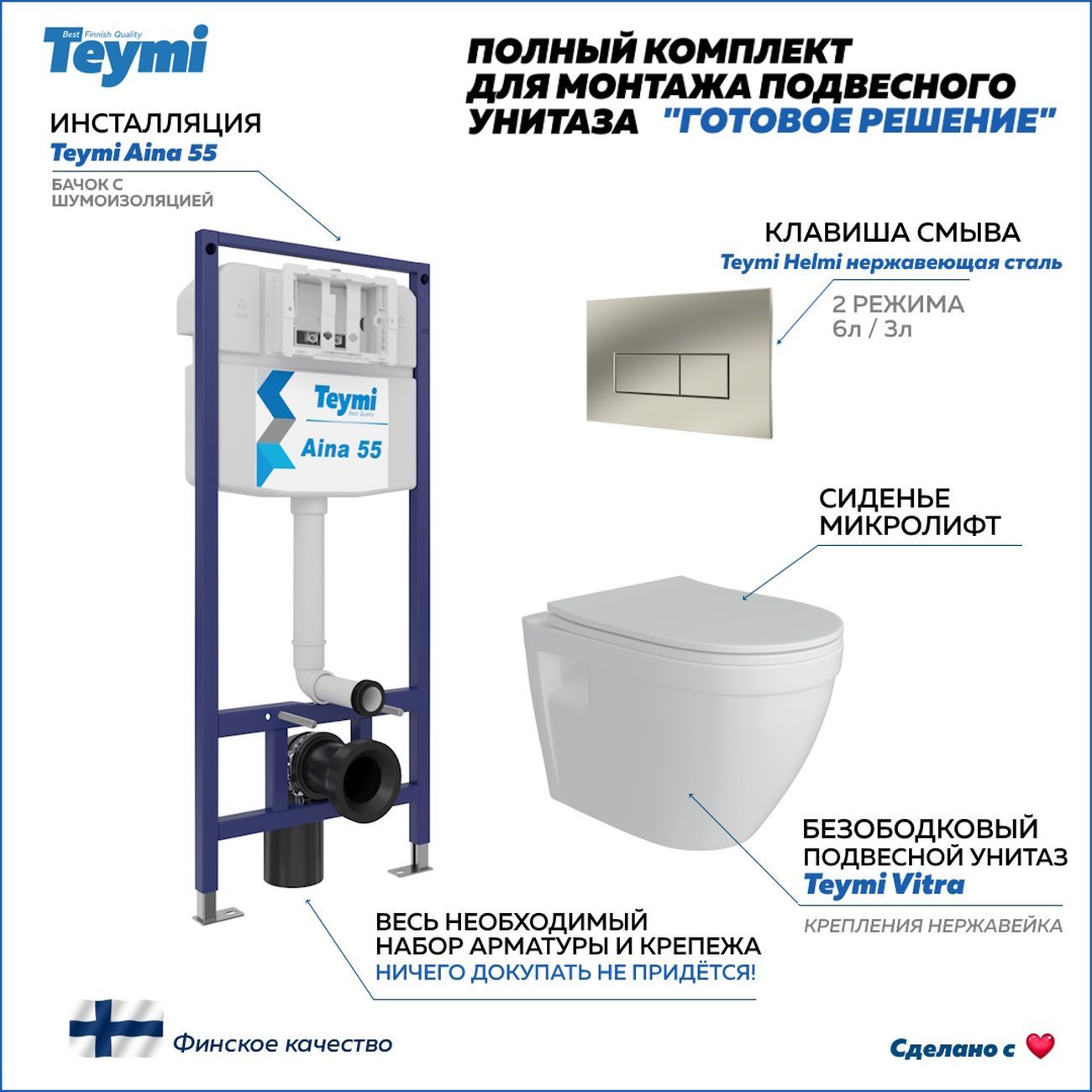 Комплект «Готовое решение» для установки инсталляции с подвесным унитазом: -- инсталляция TEYMI AINA 55 T70035 – монтажная рама из цельного стального профиля прямоугольного сечения, позволяющая выдерживать нагрузки до 400 кг. Габаритная ширина рамы 470 мм; -- клавиша смыва TEYMI HELMI T70204, корпус нержавеюшая сталь, цвет НЕРЖАВЕЮЩАЯ СТАЛЬ МАТОВЫЙ;; -- унитаз подвесной безободковый TEYMI VITRA T40804; -- сиденье с микролифтом; -- полный комплект арматуры для монтажа: уплотнительные кольца, манжеты, труба смыва, фановый отвод с удлинителем, защитный кожух ревизионного окна с крепежной рамкой, закрывающей панелью и крышкой; -- полный комплект крепежа для установки: крепеж к стене, шпильки для унитаза, крепежная рамка, соединительные шпильки, толкатели, фиксаторы; -- инструкция по установке и обслуживанию. Преимущества комплекта: -- полная (максимальная) комплектация для установки - больше ничего докупать не придётся; -- все составляющие комплекта идеально подходят друг к другу; -- рама покрыта суперпрочной порошковой краской синего цвета с антикоррозионными свойствами; -- высота монтажной рамы может регулироваться с помощью ножек из оцинкованной стали; -- универсальный монтаж – межосевое расстояние под шпильки для подвесного унитаза 180 и 230 мм – подходит ко всем подвесным унитазам; -- сливной бачок скрытого монтажа, изготовленный из полиэтилена низкого давления, рассчитан на 200 тысяч циклов смыва, а цельнолитая бесшовная конструкция позволит работать без протечек в течение всего периода эксплуатации; -- 2-режимный слив 3 / 6 л с возможностью регулировки; -- лёгкость обслуживания бачка благодаря ревизионному окну, скрытому за клавишей смыва; -- гарантия 10 лет на весь комплект и 50 лет на стальную раму. Размер изделия: высота 1130 мм (регулируется) Х ширина 470 мм Х глубина 102 мм. Уважаемые покупатели, обращаем ваше внимание на то, что система инсталляции TEYMI AINA 55 может быть также укомплектована другими клавишами смыва или подвесными унитазами от бренда TEYMI (вы можете найти их на этом сайте по указанным артикулам). Предлагаем вам рассмотреть варианты сочетания со следующими клавишами: : HELMI хром T70202CH : HELMI черная T70203BM : HELMI белая T70018WM : HELMI нержавеющая сталь T70204 : HELMI черный матовый T70205 : HELMI белый глянцевый T70206 : LINA хром T70102CH : LINA черная T70103BM : LINA белая T70019WM : LINA нержавеющая сталь T70104 : LINA черный матовый T70105 : LINA белый матовый T70106 : AINA хром T70012CH : AINA черная T70013BM : AINA белая T70020WM : AINA нержавеющая сталь T70014 : KATI хром T70701CH : KATI черная T70702BM : KATI белая T70021WM : ELLIE хром T70022CH : ELLIE черная T70023BM : ELLIE белая T70024WM Также просим обратить взгляд на наши лучшие безободковые подвесные унитазы: : SOLLI T40201 : LINA S T40102 : HELMI S T40302 : HELMI VORTEX T40303 : IVA T40601 : ELLIE T40802 : LINA MEDIA T40105 : KATI T40701 : HANNA PRO T40901 : HELMI S BLACK T40302MB : VITRA PRO T40806 : VITRA T40804 : DEMI T40208 : LINA VORTEX T40110 : RITTA T40809 : LINA PRO T40106 : LINA S BLACK T40111