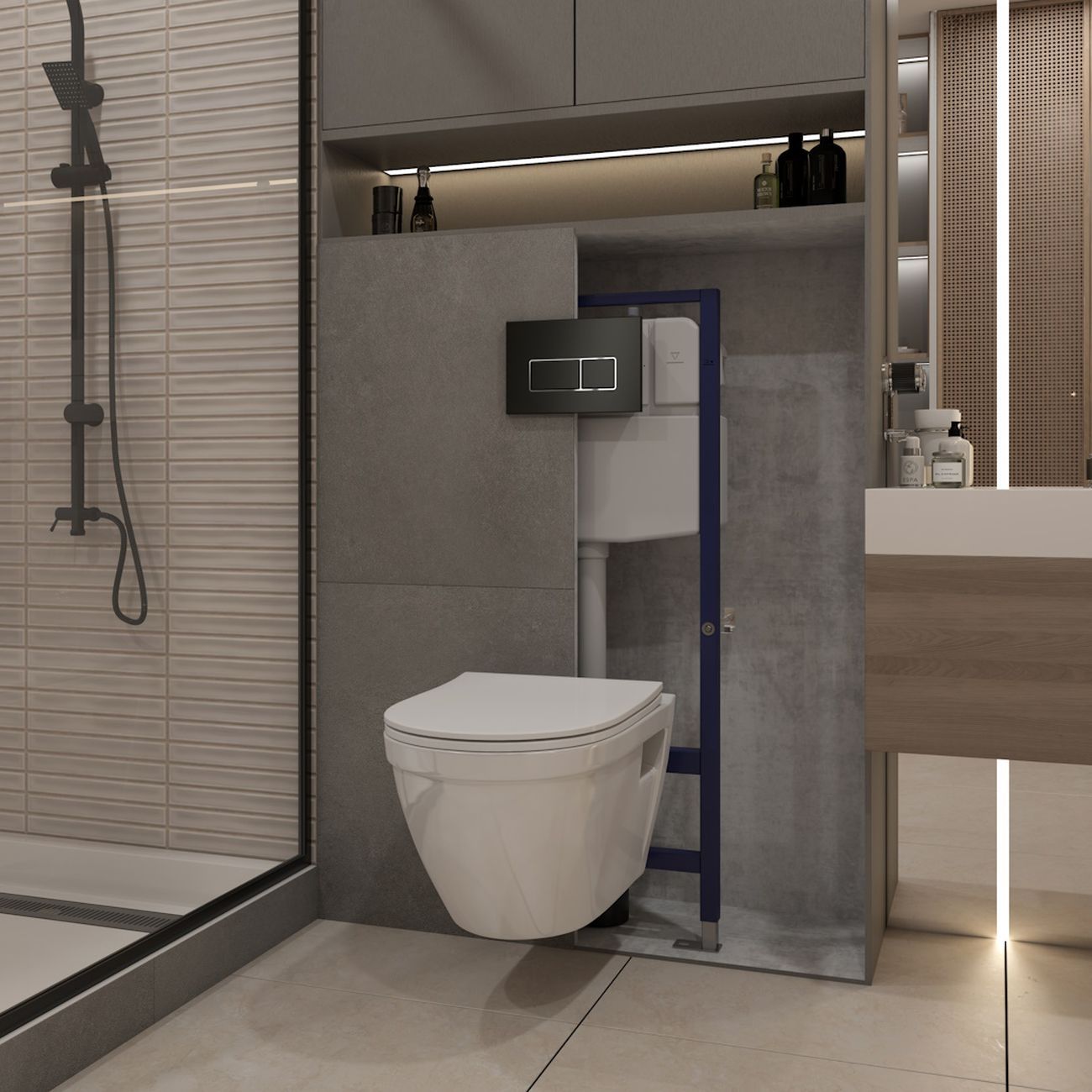 Комплект «Готовое решение» для установки инсталляции с подвесным унитазом: -- инсталляция TEYMI AINA 55 T70035 – монтажная рама из цельного стального профиля прямоугольного сечения, позволяющая выдерживать нагрузки до 400 кг. Габаритная ширина рамы 470 мм; -- клавиша смыва TEYMI HELMI T70205, цвет ЧЕРНЫЙ МАТОВЫЙ, ОКАНТОВКА ХРОМ; -- унитаз подвесной безободковый TEYMI VITRA T40804; -- сиденье с микролифтом; -- полный комплект арматуры для монтажа: уплотнительные кольца, манжеты, труба смыва, фановый отвод с удлинителем, защитный кожух ревизионного окна с крепежной рамкой, закрывающей панелью и крышкой; -- полный комплект крепежа для установки: крепеж к стене, шпильки для унитаза, крепежная рамка, соединительные шпильки, толкатели, фиксаторы; -- инструкция по установке и обслуживанию. Преимущества комплекта: -- полная (максимальная) комплектация для установки - больше ничего докупать не придётся; -- все составляющие комплекта идеально подходят друг к другу; -- рама покрыта суперпрочной порошковой краской синего цвета с антикоррозионными свойствами; -- высота монтажной рамы может регулироваться с помощью ножек из оцинкованной стали; -- универсальный монтаж – межосевое расстояние под шпильки для подвесного унитаза 180 и 230 мм – подходит ко всем подвесным унитазам; -- сливной бачок скрытого монтажа, изготовленный из полиэтилена низкого давления, рассчитан на 200 тысяч циклов смыва, а цельнолитая бесшовная конструкция позволит работать без протечек в течение всего периода эксплуатации; -- 2-режимный слив 3 / 6 л с возможностью регулировки; -- лёгкость обслуживания бачка благодаря ревизионному окну, скрытому за клавишей смыва; -- гарантия 10 лет на весь комплект и 50 лет на стальную раму. Размер изделия: высота 1130 мм (регулируется) Х ширина 470 мм Х глубина 102 мм. Уважаемые покупатели, обращаем ваше внимание на то, что система инсталляции TEYMI AINA 55 может быть также укомплектована другими клавишами смыва или подвесными унитазами от бренда TEYMI (вы можете найти их на этом сайте по указанным артикулам). Предлагаем вам рассмотреть варианты сочетания со следующими клавишами: : HELMI хром T70202CH : HELMI черная T70203BM : HELMI белая T70018WM : HELMI нержавеющая сталь T70204 : HELMI черный матовый T70205 : HELMI белый глянцевый T70206 : LINA хром T70102CH : LINA черная T70103BM : LINA белая T70019WM : LINA нержавеющая сталь T70104 : LINA черный матовый T70105 : LINA белый матовый T70106 : AINA хром T70012CH : AINA черная T70013BM : AINA белая T70020WM : AINA нержавеющая сталь T70014 : KATI хром T70701CH : KATI черная T70702BM : KATI белая T70021WM : ELLIE хром T70022CH : ELLIE черная T70023BM : ELLIE белая T70024WM Также просим обратить взгляд на наши лучшие безободковые подвесные унитазы: : SOLLI T40201 : LINA S T40102 : HELMI S T40302 : HELMI VORTEX T40303 : IVA T40601 : ELLIE T40802 : LINA MEDIA T40105 : KATI T40701 : HANNA PRO T40901 : HELMI S BLACK T40302MB : VITRA PRO T40806 : VITRA T40804 : DEMI T40208 : LINA VORTEX T40110 : RITTA T40809 : LINA PRO T40106 : LINA S BLACK T40111
