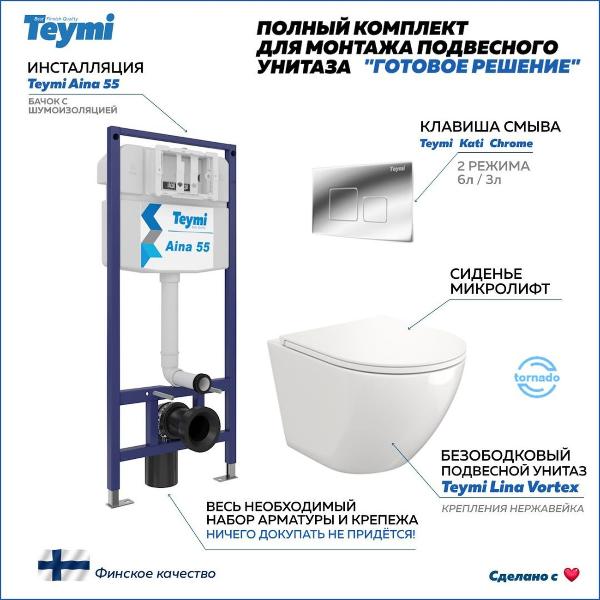 Комплект «Готовое решение» для установки инсталляции с подвесным унитазом: -- инсталляция TEYMI AINA 55 T70035 – монтажная рама из цельного стального профиля прямоугольного сечения, позволяющая выдерживать нагрузки до 400 кг. Габаритная ширина рамы 470 мм; -- клавиша смыва TEYMI KATI T70701CH, цвет ХРОМ ГЛЯНЕЦ; -- унитаз подвесной безободковый TEYMI LINA VORTEX T40110; -- сиденье с микролифтом; -- полный комплект арматуры для монтажа: уплотнительные кольца, манжеты, труба смыва, фановый отвод с удлинителем, защитный кожух ревизионного окна с крепежной рамкой, закрывающей панелью и крышкой; -- полный комплект крепежа для установки: крепеж к стене, шпильки для унитаза, крепежная рамка, соединительные шпильки, толкатели, фиксаторы; -- инструкция по установке и обслуживанию. Преимущества комплекта: -- полная (максимальная) комплектация для установки - больше ничего докупать не придётся; -- все составляющие комплекта идеально подходят друг к другу; -- рама покрыта суперпрочной порошковой краской синего цвета с антикоррозионными свойствами; -- высота монтажной рамы может регулироваться с помощью ножек из оцинкованной стали; -- универсальный монтаж – межосевое расстояние под шпильки для подвесного унитаза 180 и 230 мм – подходит ко всем подвесным унитазам; -- сливной бачок скрытого монтажа, изготовленный из полиэтилена низкого давления, рассчитан на 200 тысяч циклов смыва, а цельнолитая бесшовная конструкция позволит работать без протечек в течение всего периода эксплуатации; -- 2-режимный слив 3 / 6 л с возможностью регулировки; -- лёгкость обслуживания бачка благодаря ревизионному окну, скрытому за клавишей смыва; -- гарантия 10 лет на весь комплект и 50 лет на стальную раму. Размер изделия: высота 1130 мм (регулируется) Х ширина 470 мм Х глубина 102 мм. Уважаемые покупатели, обращаем ваше внимание на то, что система инсталляции TEYMI AINA 55 может быть также укомплектована другими клавишами смыва или подвесными унитазами от бренда TEYMI (вы можете найти их на этом сайте по указанным артикулам). Предлагаем вам рассмотреть варианты сочетания со следующими клавишами: : HELMI хром T70202CH : HELMI черная T70203BM : HELMI белая T70018WM : HELMI нержавеющая сталь T70204 : HELMI черный матовый T70205 : HELMI белый глянцевый T70206 : LINA хром T70102CH : LINA черная T70103BM : LINA белая T70019WM : LINA нержавеющая сталь T70104 : LINA черный матовый T70105 : LINA белый матовый T70106 : AINA хром T70012CH : AINA черная T70013BM : AINA белая T70020WM : AINA нержавеющая сталь T70014 : KATI хром T70701CH : KATI черная T70702BM : KATI белая T70021WM : ELLIE хром T70022CH : ELLIE черная T70023BM : ELLIE белая T70024WM Также просим обратить взгляд на наши лучшие безободковые подвесные унитазы: : SOLLI T40201 : LINA S T40102 : HELMI S T40302 : HELMI VORTEX T40303 : IVA T40601 : ELLIE T40802 : LINA MEDIA T40105 : KATI T40701 : HANNA PRO T40901 : HELMI S BLACK T40302MB : VITRA PRO T40806 : VITRA T40804 : DEMI T40208 : LINA VORTEX T40110 : RITTA T40809 : LINA PRO T40106 : LINA S BLACK T40111