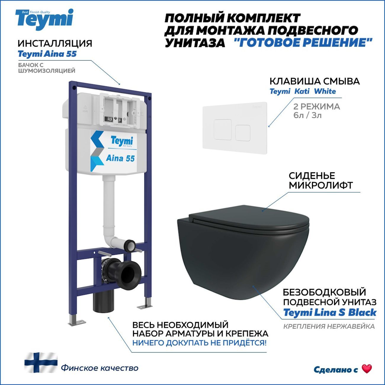 Комплект «Готовое решение» для установки инсталляции с подвесным унитазом: -- инсталляция TEYMI AINA 55 T70035 – монтажная рама из цельного стального профиля прямоугольного сечения, позволяющая выдерживать нагрузки до 400 кг. Габаритная ширина рамы 470 мм; -- клавиша смыва TEYMI KATI T70021WM, цвет БЕЛЫЙ МАТОВЫЙ; -- унитаз подвесной безободковый TEYMI LINA S черный T40111; -- сиденье с микролифтом; -- полный комплект арматуры для монтажа: уплотнительные кольца, манжеты, труба смыва, фановый отвод с удлинителем, защитный кожух ревизионного окна с крепежной рамкой, закрывающей панелью и крышкой; -- полный комплект крепежа для установки: крепеж к стене, шпильки для унитаза, крепежная рамка, соединительные шпильки, толкатели, фиксаторы; -- инструкция по установке и обслуживанию. Преимущества комплекта: -- полная (максимальная) комплектация для установки - больше ничего докупать не придётся; -- все составляющие комплекта идеально подходят друг к другу; -- рама покрыта суперпрочной порошковой краской синего цвета с антикоррозионными свойствами; -- высота монтажной рамы может регулироваться с помощью ножек из оцинкованной стали; -- универсальный монтаж – межосевое расстояние под шпильки для подвесного унитаза 180 и 230 мм – подходит ко всем подвесным унитазам; -- сливной бачок скрытого монтажа, изготовленный из полиэтилена низкого давления, рассчитан на 200 тысяч циклов смыва, а цельнолитая бесшовная конструкция позволит работать без протечек в течение всего периода эксплуатации; -- 2-режимный слив 3 / 6 л с возможностью регулировки; -- лёгкость обслуживания бачка благодаря ревизионному окну, скрытому за клавишей смыва; -- гарантия 10 лет на весь комплект и 50 лет на стальную раму. Размер изделия: высота 1130 мм (регулируется) Х ширина 470 мм Х глубина 102 мм. Уважаемые покупатели, обращаем ваше внимание на то, что система инсталляции TEYMI AINA 55 может быть также укомплектована другими клавишами смыва или подвесными унитазами от бренда TEYMI (вы можете найти их на этом сайте по указанным артикулам). Предлагаем вам рассмотреть варианты сочетания со следующими клавишами: : HELMI хром T70202CH : HELMI черная T70203BM : HELMI белая T70018WM : HELMI нержавеющая сталь T70204 : HELMI черный матовый T70205 : HELMI белый глянцевый T70206 : LINA хром T70102CH : LINA черная T70103BM : LINA белая T70019WM : LINA нержавеющая сталь T70104 : LINA черный матовый T70105 : LINA белый матовый T70106 : AINA хром T70012CH : AINA черная T70013BM : AINA белая T70020WM : AINA нержавеющая сталь T70014 : KATI хром T70701CH : KATI черная T70702BM : KATI белая T70021WM : ELLIE хром T70022CH : ELLIE черная T70023BM : ELLIE белая T70024WM Также просим обратить взгляд на наши лучшие безободковые подвесные унитазы: : SOLLI T40201 : LINA S T40102 : HELMI S T40302 : HELMI VORTEX T40303 : IVA T40601 : ELLIE T40802 : LINA MEDIA T40105 : KATI T40701 : HANNA PRO T40901 : HELMI S BLACK T40302MB : VITRA PRO T40806 : VITRA T40804 : DEMI T40208 : LINA VORTEX T40110 : RITTA T40809 : LINA PRO T40106 : LINA S BLACK T40111