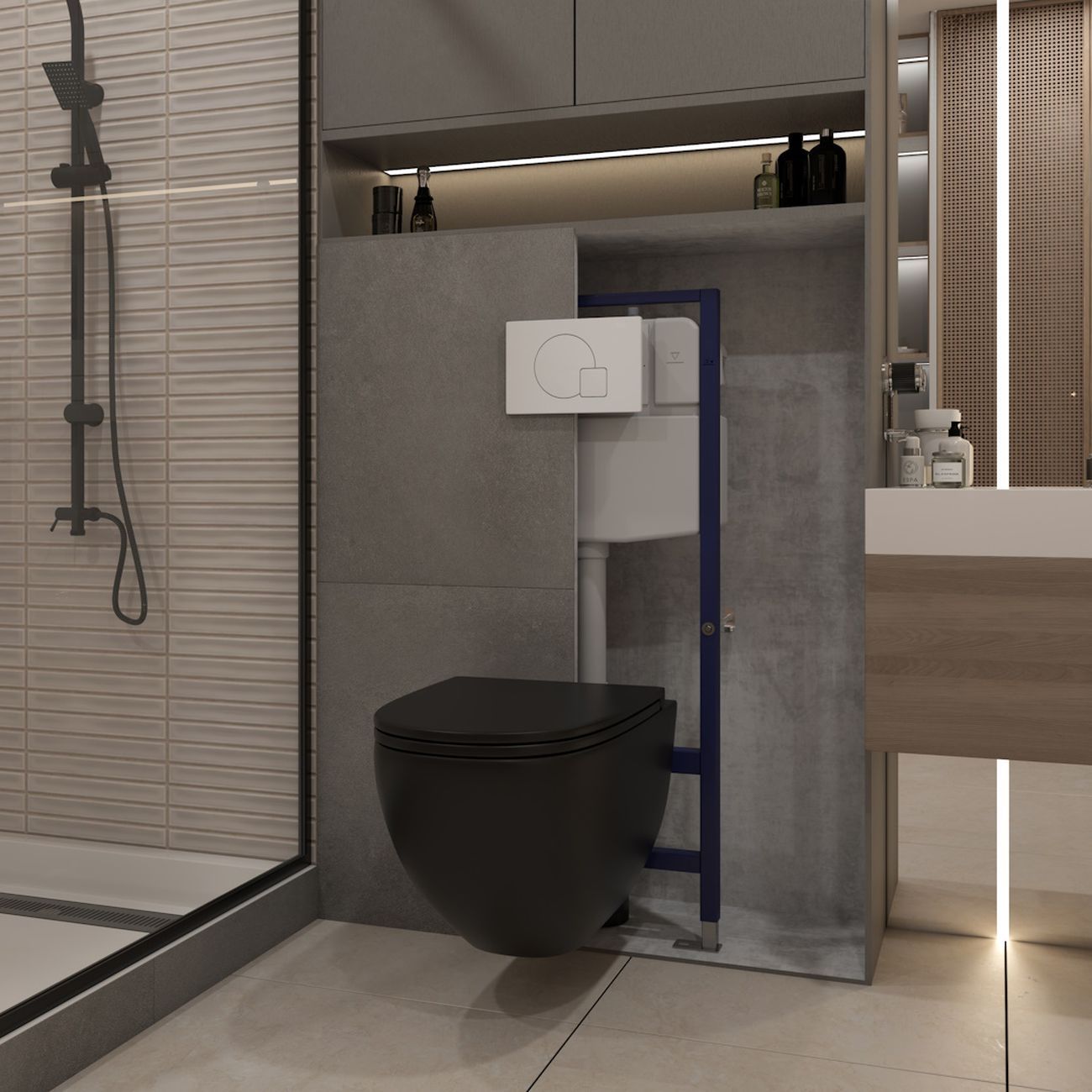 Комплект «Готовое решение» для установки инсталляции с подвесным унитазом: -- инсталляция TEYMI AINA 55 T70035 – монтажная рама из цельного стального профиля прямоугольного сечения, позволяющая выдерживать нагрузки до 400 кг. Габаритная ширина рамы 470 мм; -- клавиша смыва TEYMI ELLIE T70024WM, цвет БЕЛЫЙ МАТОВЫЙ; -- унитаз подвесной безободковый TEYMI LINA S черный T40111; -- сиденье с микролифтом; -- полный комплект арматуры для монтажа: уплотнительные кольца, манжеты, труба смыва, фановый отвод с удлинителем, защитный кожух ревизионного окна с крепежной рамкой, закрывающей панелью и крышкой; -- полный комплект крепежа для установки: крепеж к стене, шпильки для унитаза, крепежная рамка, соединительные шпильки, толкатели, фиксаторы; -- инструкция по установке и обслуживанию. Преимущества комплекта: -- полная (максимальная) комплектация для установки - больше ничего докупать не придётся; -- все составляющие комплекта идеально подходят друг к другу; -- рама покрыта суперпрочной порошковой краской синего цвета с антикоррозионными свойствами; -- высота монтажной рамы может регулироваться с помощью ножек из оцинкованной стали; -- универсальный монтаж – межосевое расстояние под шпильки для подвесного унитаза 180 и 230 мм – подходит ко всем подвесным унитазам; -- сливной бачок скрытого монтажа, изготовленный из полиэтилена низкого давления, рассчитан на 200 тысяч циклов смыва, а цельнолитая бесшовная конструкция позволит работать без протечек в течение всего периода эксплуатации; -- 2-режимный слив 3 / 6 л с возможностью регулировки; -- лёгкость обслуживания бачка благодаря ревизионному окну, скрытому за клавишей смыва; -- гарантия 10 лет на весь комплект и 50 лет на стальную раму. Размер изделия: высота 1130 мм (регулируется) Х ширина 470 мм Х глубина 102 мм. Уважаемые покупатели, обращаем ваше внимание на то, что система инсталляции TEYMI AINA 55 может быть также укомплектована другими клавишами смыва или подвесными унитазами от бренда TEYMI (вы можете найти их на этом сайте по указанным артикулам). Предлагаем вам рассмотреть варианты сочетания со следующими клавишами: : HELMI хром T70202CH : HELMI черная T70203BM : HELMI белая T70018WM : HELMI нержавеющая сталь T70204 : HELMI черный матовый T70205 : HELMI белый глянцевый T70206 : LINA хром T70102CH : LINA черная T70103BM : LINA белая T70019WM : LINA нержавеющая сталь T70104 : LINA черный матовый T70105 : LINA белый матовый T70106 : AINA хром T70012CH : AINA черная T70013BM : AINA белая T70020WM : AINA нержавеющая сталь T70014 : KATI хром T70701CH : KATI черная T70702BM : KATI белая T70021WM : ELLIE хром T70022CH : ELLIE черная T70023BM : ELLIE белая T70024WM Также просим обратить взгляд на наши лучшие безободковые подвесные унитазы: : SOLLI T40201 : LINA S T40102 : HELMI S T40302 : HELMI VORTEX T40303 : IVA T40601 : ELLIE T40802 : LINA MEDIA T40105 : KATI T40701 : HANNA PRO T40901 : HELMI S BLACK T40302MB : VITRA PRO T40806 : VITRA T40804 : DEMI T40208 : LINA VORTEX T40110 : RITTA T40809 : LINA PRO T40106 : LINA S BLACK T40111