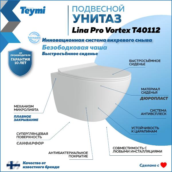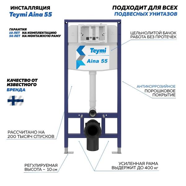 Комплект «Готовое решение» для установки инсталляции с подвесным унитазом: -- инсталляция TEYMI AINA 55 T70035 – монтажная рама из цельного стального профиля прямоугольного сечения, позволяющая выдерживать нагрузки до 400 кг. Габаритная ширина рамы 470 мм; -- клавиша смыва TEYMI HELMI T70206, цвет БЕЛЫЙ ГЛЯНЦЕВЫЙ, ОКАНТОВКА ХРОМ; -- унитаз подвесной безободковый TEYMI LINA PRO VORTEX T40112; -- сиденье с микролифтом; -- полный комплект арматуры для монтажа: уплотнительные кольца, манжеты, труба смыва, фановый отвод с удлинителем, защитный кожух ревизионного окна с крепежной рамкой, закрывающей панелью и крышкой; -- полный комплект крепежа для установки: крепеж к стене, шпильки для унитаза, крепежная рамка, соединительные шпильки, толкатели, фиксаторы; -- инструкция по установке и обслуживанию. Преимущества комплекта: -- полная (максимальная) комплектация для установки - больше ничего докупать не придётся; -- все составляющие комплекта идеально подходят друг к другу; -- рама покрыта суперпрочной порошковой краской синего цвета с антикоррозионными свойствами; -- высота монтажной рамы может регулироваться с помощью ножек из оцинкованной стали; -- универсальный монтаж – межосевое расстояние под шпильки для подвесного унитаза 180 и 230 мм – подходит ко всем подвесным унитазам; -- сливной бачок скрытого монтажа, изготовленный из полиэтилена низкого давления, рассчитан на 200 тысяч циклов смыва, а цельнолитая бесшовная конструкция позволит работать без протечек в течение всего периода эксплуатации; -- 2-режимный слив 3 / 6 л с возможностью регулировки; -- лёгкость обслуживания бачка благодаря ревизионному окну, скрытому за клавишей смыва; -- гарантия 10 лет на весь комплект и 50 лет на стальную раму. Размер изделия: высота 1130 мм (регулируется) Х ширина 470 мм Х глубина 102 мм. Уважаемые покупатели, обращаем ваше внимание на то, что система инсталляции TEYMI AINA 55 может быть также укомплектована другими клавишами смыва или подвесными унитазами от бренда TEYMI (вы можете найти их на этом сайте по указанным артикулам). Предлагаем вам рассмотреть варианты сочетания со следующими клавишами: : HELMI хром T70202CH : HELMI черная T70203BM : HELMI белая T70018WM : HELMI нержавеющая сталь T70204 : HELMI черный матовый T70205 : HELMI белый глянцевый T70206 : LINA хром T70102CH : LINA черная T70103BM : LINA белая T70019WM : LINA нержавеющая сталь T70104 : LINA черный матовый T70105 : LINA белый матовый T70106 : AINA хром T70012CH : AINA черная T70013BM : AINA белая T70020WM : AINA нержавеющая сталь T70014 : KATI хром T70701CH : KATI черная T70702BM : KATI белая T70021WM : ELLIE хром T70022CH : ELLIE черная T70023BM : ELLIE белая T70024WM Также просим обратить взгляд на наши лучшие безободковые подвесные унитазы: : SOLLI T40201 : LINA S T40102 : HELMI S T40302 : HELMI VORTEX T40303 : IVA T40601 : ELLIE T40802 : LINA MEDIA T40105 : KATI T40701 : HANNA PRO T40901 : HELMI S BLACK T40302MB : VITRA PRO T40806 : VITRA T40804 : DEMI T40208 : LINA VORTEX T40110 : RITTA T40809 : LINA PRO T40106 : LINA S BLACK T40111
