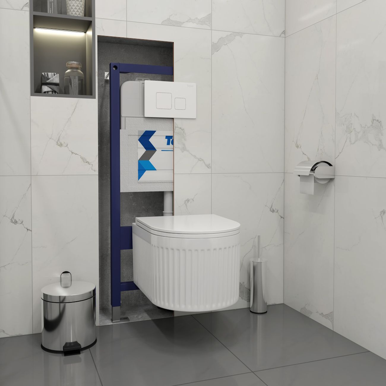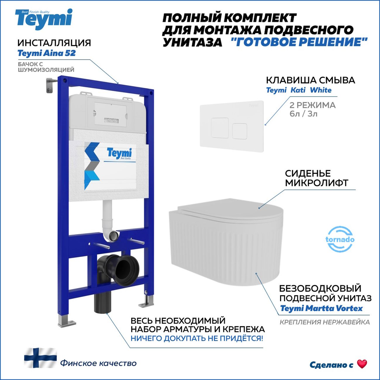 Комплект «Готовое решение» для установки инсталляции с подвесным унитазом включает: -- инсталляция TEYMI AINA 52 T70011 – монтажная рама из стального профиля толщиной 1.5 мм увеличенной ширины 52,5 см с дополнительными вертикальными усиливающими стойками, что позволяет выдерживать нагрузки до 400 кг; -- клавиша смыва TEYMI KATI T70021WM, цвет БЕЛЫЙ МАТОВЫЙ; -- унитаз подвесной TEYMI MARTTA VORTEX T42101; -- быстросъёмное сиденье с микролифтом; -- полный комплект арматуры для монтажа, включающий в себя уплотнительные кольца и манжеты, трубу смыва, фановый отвод с удлинителем, защитный кожух ревизионного окна с крепежной рамкой, закрывающей панелью и крышкой; -- полный комплект крепежа для установки, а именно: крепеж к стене, шпильки для унитаза, крепежная рамка, соединительные шпильки, толкатели; -- инструкция по установке и обслуживанию. Преимущества комплекта «Готовое решение» для установки инсталляции с подвесным унитазом: -- полная (максимальная) комплектация для установки - больше ничего докупать не придётся; -- все составляющие комплекта идеально подходят друг к другу; -- взаимозаменяемость комплектующих; -- рама покрыта суперпрочной порошковой краской с антикоррозионными свойствами; -- высота рамы может регулироваться с ходом до 20 см с помощью ножек, изготовленных из оцинкованной стали; -- сливной бачок скрытого монтажа изготовлен из современных полимерных материалов и является цельнолитым (бесшовным), что позволяет ему работать без протечек в течение всего периода эксплуатации; -- лёгкость обслуживания сливного бачка достигается благодаря удобному ревизионному окну, скрытому за клавишей смыва; -- клавиша смыва имеет две кнопки и работает в режиме ЭКОНОМ / ПОЛНЫЙ (объёмы смыва 3 / 6 литров); -- гарантия на весь комплект составляет 10 лет, а рама прослужит все 50. Уважаемые покупатели, обращаем ваше внимание на то, что система инсталляции TEYMI AINA 52 может быть также укомплектована другими клавишами смыва или подвесными унитазами от бренда TEYMI (вы можете найти их на этом сайте по указанным артикулам). Предлагаем вам рассмотреть варианты сочетания со следующими клавишами: : HELMI хром T70202CH : HELMI черная T70203BM : HELMI белая T70018WM : LINA хром T70102CH : LINA черная T70103BM : LINA белая T70019WM : AINA хром T70012CH : AINA черная T70013BM : AINA белая T70020WM : KATI хром T70701CH : KATI черная T70702BM : KATI белая T70021WM : ELLIE хром T70022CH : ELLIE черная T70023BM : ELLIE белая T70024WM Также просим обратить взгляд на наши лучшие безободковые подвесные унитазы: : SOLLI T40201 : LINA S T40102 : HELMI S T40302 : HELMI VORTEX T40303 : IVA T40601 : ELLIE T40802 : LINA MEDIA T40105 : KATI T40701 : HANNA PRO T40901 : HELMI S BLACK T40302MB : VITRA PRO T40806 : VITRA T40804 : DEMI T40208 : LINA VORTEX T40110 : RITTA T40809 : LINA PRO T40106 : LINA S BLACK T40111