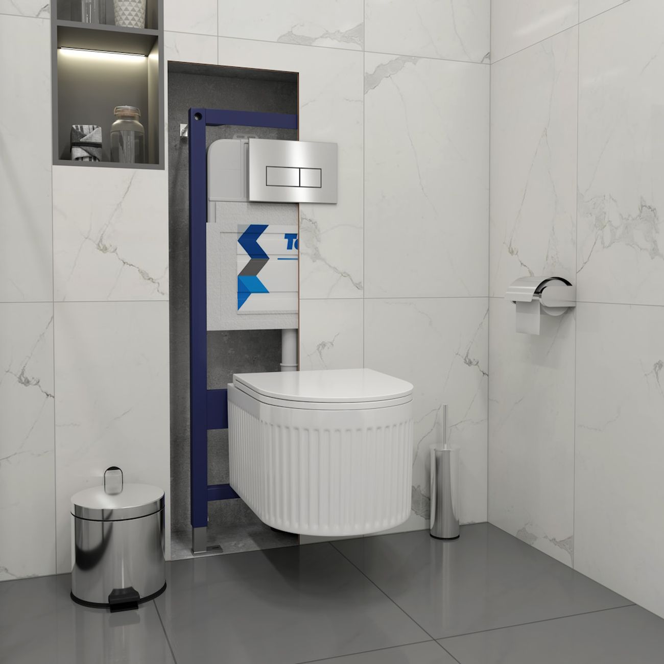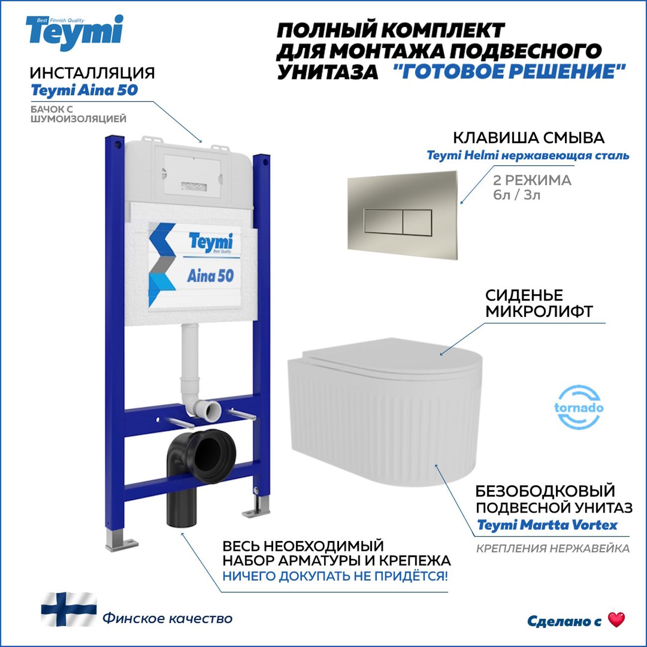 Комплект «Готовое решение» для установки инсталляции с подвесным унитазом: -- инсталляция TEYMI AINA 50 T70033 – монтажная рама из цельного стального профиля прямоугольного сечения, позволяющая выдерживать нагрузки до 400 кг. Габаритная ширина рамы 525 мм; -- клавиша смыва TEYMI HELMI T70204, корпус нержавеюшая сталь, цвет НЕРЖАВЕЮЩАЯ СТАЛЬ МАТОВЫЙ; -- унитаз подвесной TEYMI MARTTA VORTEX T42101; -- быстросъёмное сиденье с микролифтом; -- полный комплект арматуры для монтажа, включающий в себя уплотнительные кольца и манжеты, трубу смыва, фановый отвод с удлинителем, защитный кожух ревизионного окна с крепежной рамкой, закрывающей панелью и крышкой; -- полный комплект крепежа для установки, а именно: крепеж к стене, шпильки для унитаза, крепежная рамка, соединительные шпильки, толкатели; -- инструкция по установке и обслуживанию. Преимущества комплекта: -- полная (максимальная) комплектация для установки - больше ничего докупать не придётся; -- все составляющие комплекта идеально подходят друг к другу; -- рама покрыта суперпрочной порошковой краской синего цвета с антикоррозионными свойствами; -- высота монтажной рамы может регулироваться с ходом до 20 см с помощью ножек из оцинкованной стали; -- универсальный монтаж – межосевое расстояние под шпильки для подвесного унитаза 180 и 230 мм – подходит ко всем подвесным унитазам; -- сливной бачок скрытого монтажа, изготовленный из полиэтилена низкого давления, рассчитан на 200 тысяч циклов смыва, а цельнолитая бесшовная конструкция позволит работать без протечек в течение всего периода эксплуатации; -- 2-режимный слив 3 / 6 л с возможностью регулировки; -- лёгкость обслуживания бачка благодаря ревизионному окну, скрытому за клавишей смыва; -- гарантия 10 лет на весь комплект и 50 лет на стальную раму. Размер инсталляции с бачком: высота 1055 мм Х ширина 525 мм Х глубина 96 мм. Уважаемые покупатели, обращаем ваше внимание на то, что система инсталляции TEYMI AINA 50 может быть также укомплектована другими клавишами смыва или подвесными унитазами от бренда TEYMI (вы можете найти их на этом сайте по указанным артикулам). Предлагаем вам рассмотреть варианты сочетания со следующими клавишами: : HELMI хром T70202CH : HELMI черная T70203BM : HELMI белая T70018WM : HELMI нержавеющая сталь T70204 : HELMI черный матовый T70205 : HELMI белый глянцевый T70206 : LINA хром T70102CH : LINA черная T70103BM : LINA белая T70019WM : LINA нержавеющая сталь T70104 : LINA черный матовый T70105 : LINA белый матовый T70106 : AINA хром T70012CH : AINA черная T70013BM : AINA белая T70020WM : AINA нержавеющая сталь T70014 : KATI хром T70701CH : KATI черная T70702BM : KATI белая T70021WM : ELLIE хром T70022CH : ELLIE черная T70023BM : ELLIE белая T70024WM Также просим обратить взгляд на наши лучшие безободковые подвесные унитазы: : SOLLI T40201 : LINA S T40102 : HELMI S T40302 : HELMI VORTEX T40303 : IVA T40601 : ELLIE T40802 : LINA MEDIA T40105 : KATI T40701 : HANNA PRO T40901 : HELMI S BLACK T40302MB : VITRA PRO T40806 : VITRA T40804 : DEMI T40208 : LINA VORTEX T40110 : RITTA T40809 : LINA PRO T40106 : LINA S BLACK T40111