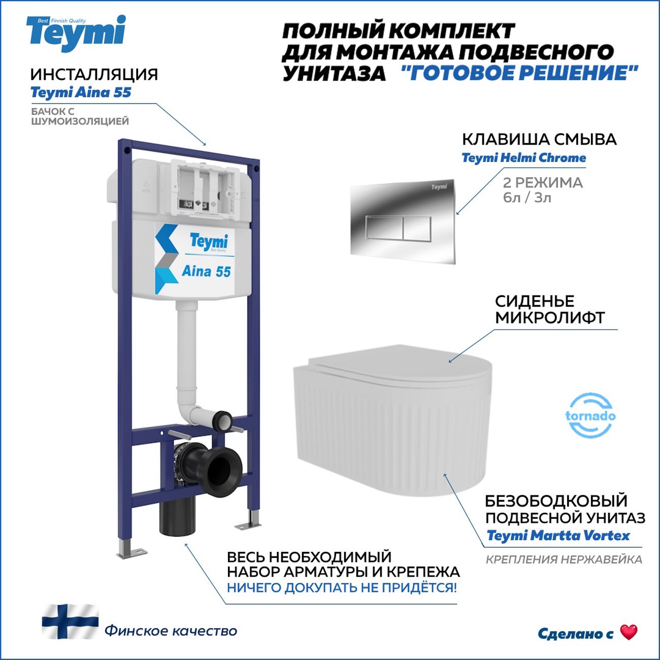 Комплект «Готовое решение» для установки инсталляции с подвесным унитазом: -- инсталляция TEYMI AINA 55 T70035 – монтажная рама из цельного стального профиля прямоугольного сечения, позволяющая выдерживать нагрузки до 400 кг. Габаритная ширина рамы 470 мм; -- клавиша смыва TEYMI HELMI T70202CH, цвет ХРОМ ГЛЯНЕЦ; -- унитаз подвесной безободковый TEYMI MARTTA VORTEX T42101; -- сиденье с микролифтом; -- полный комплект арматуры для монтажа: уплотнительные кольца, манжеты, труба смыва, фановый отвод с удлинителем, защитный кожух ревизионного окна с крепежной рамкой, закрывающей панелью и крышкой; -- полный комплект крепежа для установки: крепеж к стене, шпильки для унитаза, крепежная рамка, соединительные шпильки, толкатели, фиксаторы; -- инструкция по установке и обслуживанию. Преимущества комплекта: -- полная (максимальная) комплектация для установки - больше ничего докупать не придётся; -- все составляющие комплекта идеально подходят друг к другу; -- рама покрыта суперпрочной порошковой краской синего цвета с антикоррозионными свойствами; -- высота монтажной рамы может регулироваться с помощью ножек из оцинкованной стали; -- универсальный монтаж – межосевое расстояние под шпильки для подвесного унитаза 180 и 230 мм – подходит ко всем подвесным унитазам; -- сливной бачок скрытого монтажа, изготовленный из полиэтилена низкого давления, рассчитан на 200 тысяч циклов смыва, а цельнолитая бесшовная конструкция позволит работать без протечек в течение всего периода эксплуатации; -- 2-режимный слив 3 / 6 л с возможностью регулировки; -- лёгкость обслуживания бачка благодаря ревизионному окну, скрытому за клавишей смыва; -- гарантия 10 лет на весь комплект и 50 лет на стальную раму. Размер изделия: высота 1130 мм (регулируется) Х ширина 470 мм Х глубина 102 мм. Уважаемые покупатели, обращаем ваше внимание на то, что система инсталляции TEYMI AINA 55 может быть также укомплектована другими клавишами смыва или подвесными унитазами от бренда TEYMI (вы можете найти их на этом сайте по указанным артикулам). Предлагаем вам рассмотреть варианты сочетания со следующими клавишами: : HELMI хром T70202CH : HELMI черная T70203BM : HELMI белая T70018WM : HELMI нержавеющая сталь T70204 : HELMI черный матовый T70205 : HELMI белый глянцевый T70206 : LINA хром T70102CH : LINA черная T70103BM : LINA белая T70019WM : LINA нержавеющая сталь T70104 : LINA черный матовый T70105 : LINA белый матовый T70106 : AINA хром T70012CH : AINA черная T70013BM : AINA белая T70020WM : AINA нержавеющая сталь T70014 : KATI хром T70701CH : KATI черная T70702BM : KATI белая T70021WM : ELLIE хром T70022CH : ELLIE черная T70023BM : ELLIE белая T70024WM Также просим обратить взгляд на наши лучшие безободковые подвесные унитазы: : SOLLI T40201 : LINA S T40102 : HELMI S T40302 : HELMI VORTEX T40303 : IVA T40601 : ELLIE T40802 : LINA MEDIA T40105 : KATI T40701 : HANNA PRO T40901 : HELMI S BLACK T40302MB : VITRA PRO T40806 : VITRA T40804 : DEMI T40208 : LINA VORTEX T40110 : RITTA T40809 : LINA PRO T40106 : LINA S BLACK T40111