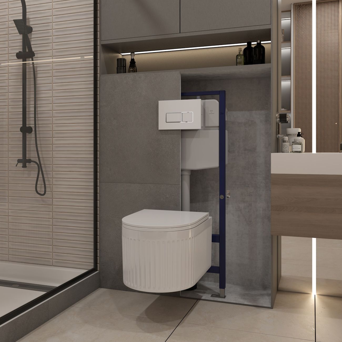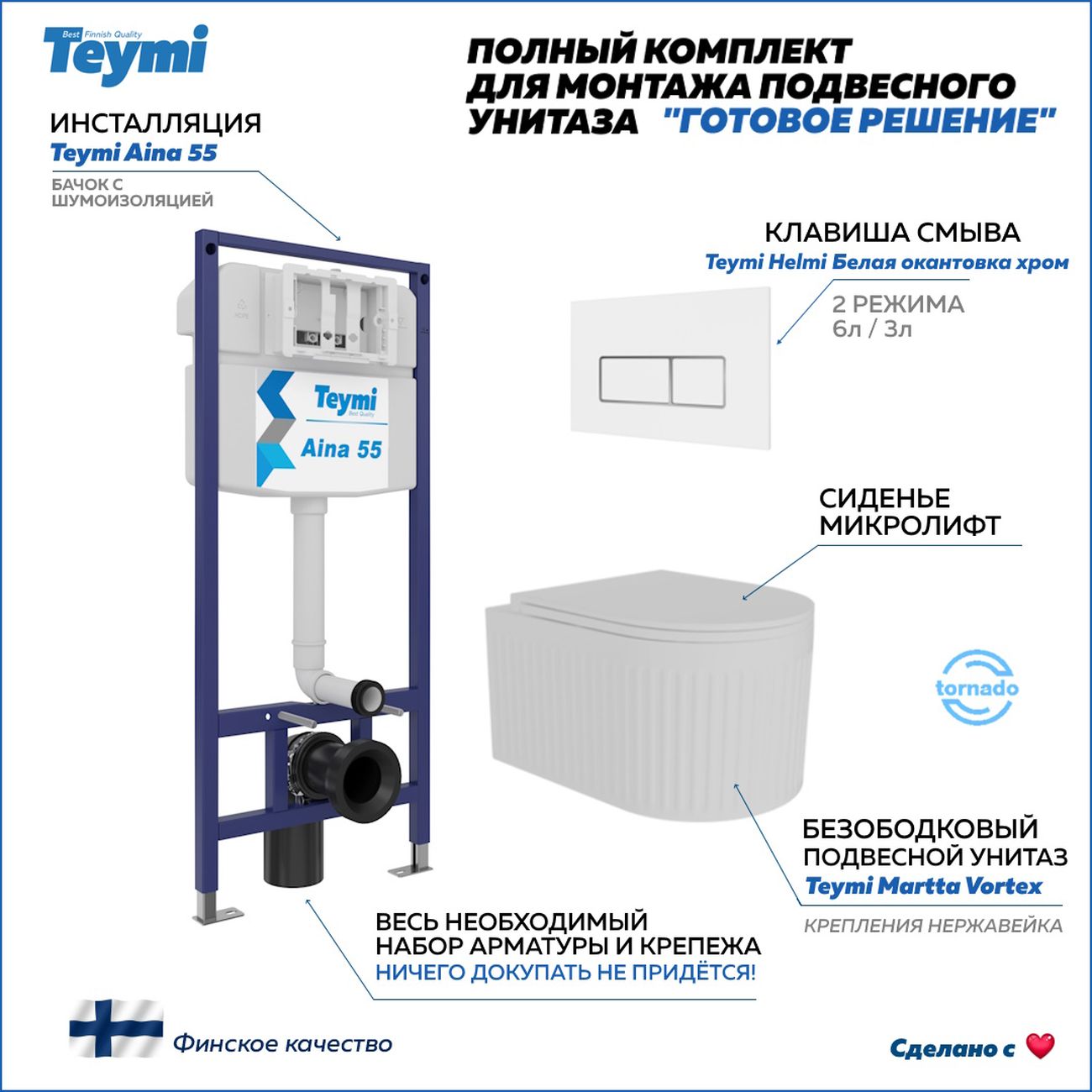Комплект «Готовое решение» для установки инсталляции с подвесным унитазом: -- инсталляция TEYMI AINA 55 T70035 – монтажная рама из цельного стального профиля прямоугольного сечения, позволяющая выдерживать нагрузки до 400 кг. Габаритная ширина рамы 470 мм; -- клавиша смыва TEYMI HELMI T70206, цвет БЕЛЫЙ ГЛЯНЦЕВЫЙ, ОКАНТОВКА ХРОМ; -- унитаз подвесной безободковый TEYMI MARTTA VORTEX T42101; -- сиденье с микролифтом; -- полный комплект арматуры для монтажа: уплотнительные кольца, манжеты, труба смыва, фановый отвод с удлинителем, защитный кожух ревизионного окна с крепежной рамкой, закрывающей панелью и крышкой; -- полный комплект крепежа для установки: крепеж к стене, шпильки для унитаза, крепежная рамка, соединительные шпильки, толкатели, фиксаторы; -- инструкция по установке и обслуживанию. Преимущества комплекта: -- полная (максимальная) комплектация для установки - больше ничего докупать не придётся; -- все составляющие комплекта идеально подходят друг к другу; -- рама покрыта суперпрочной порошковой краской синего цвета с антикоррозионными свойствами; -- высота монтажной рамы может регулироваться с помощью ножек из оцинкованной стали; -- универсальный монтаж – межосевое расстояние под шпильки для подвесного унитаза 180 и 230 мм – подходит ко всем подвесным унитазам; -- сливной бачок скрытого монтажа, изготовленный из полиэтилена низкого давления, рассчитан на 200 тысяч циклов смыва, а цельнолитая бесшовная конструкция позволит работать без протечек в течение всего периода эксплуатации; -- 2-режимный слив 3 / 6 л с возможностью регулировки; -- лёгкость обслуживания бачка благодаря ревизионному окну, скрытому за клавишей смыва; -- гарантия 10 лет на весь комплект и 50 лет на стальную раму. Размер изделия: высота 1130 мм (регулируется) Х ширина 470 мм Х глубина 102 мм. Уважаемые покупатели, обращаем ваше внимание на то, что система инсталляции TEYMI AINA 55 может быть также укомплектована другими клавишами смыва или подвесными унитазами от бренда TEYMI (вы можете найти их на этом сайте по указанным артикулам). Предлагаем вам рассмотреть варианты сочетания со следующими клавишами: : HELMI хром T70202CH : HELMI черная T70203BM : HELMI белая T70018WM : HELMI нержавеющая сталь T70204 : HELMI черный матовый T70205 : HELMI белый глянцевый T70206 : LINA хром T70102CH : LINA черная T70103BM : LINA белая T70019WM : LINA нержавеющая сталь T70104 : LINA черный матовый T70105 : LINA белый матовый T70106 : AINA хром T70012CH : AINA черная T70013BM : AINA белая T70020WM : AINA нержавеющая сталь T70014 : KATI хром T70701CH : KATI черная T70702BM : KATI белая T70021WM : ELLIE хром T70022CH : ELLIE черная T70023BM : ELLIE белая T70024WM Также просим обратить взгляд на наши лучшие безободковые подвесные унитазы: : SOLLI T40201 : LINA S T40102 : HELMI S T40302 : HELMI VORTEX T40303 : IVA T40601 : ELLIE T40802 : LINA MEDIA T40105 : KATI T40701 : HANNA PRO T40901 : HELMI S BLACK T40302MB : VITRA PRO T40806 : VITRA T40804 : DEMI T40208 : LINA VORTEX T40110 : RITTA T40809 : LINA PRO T40106 : LINA S BLACK T40111