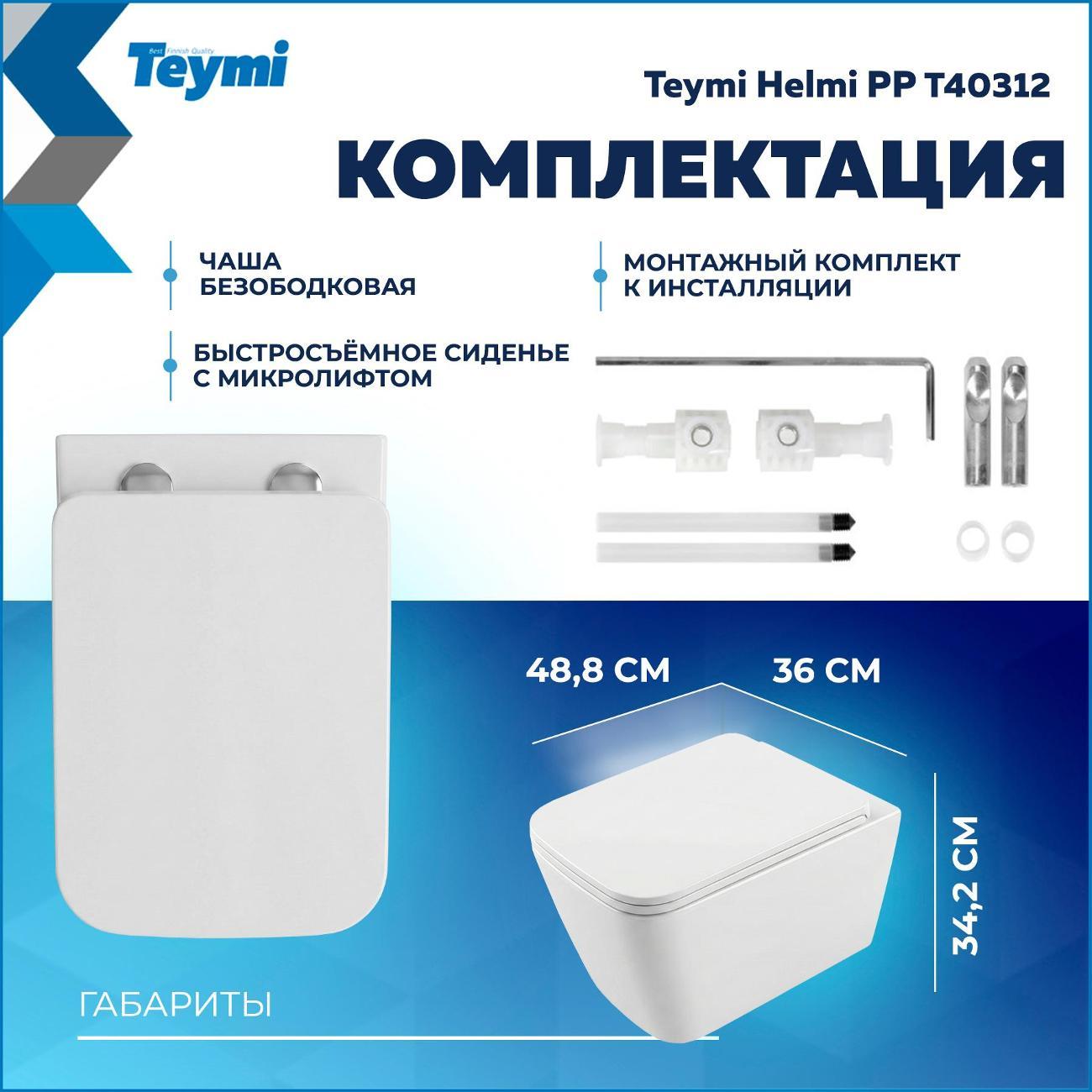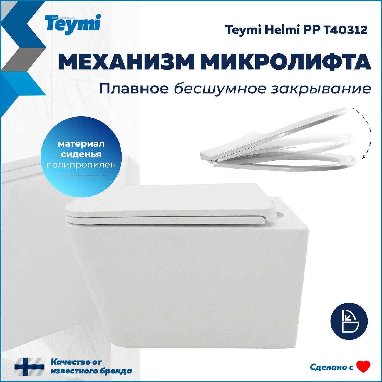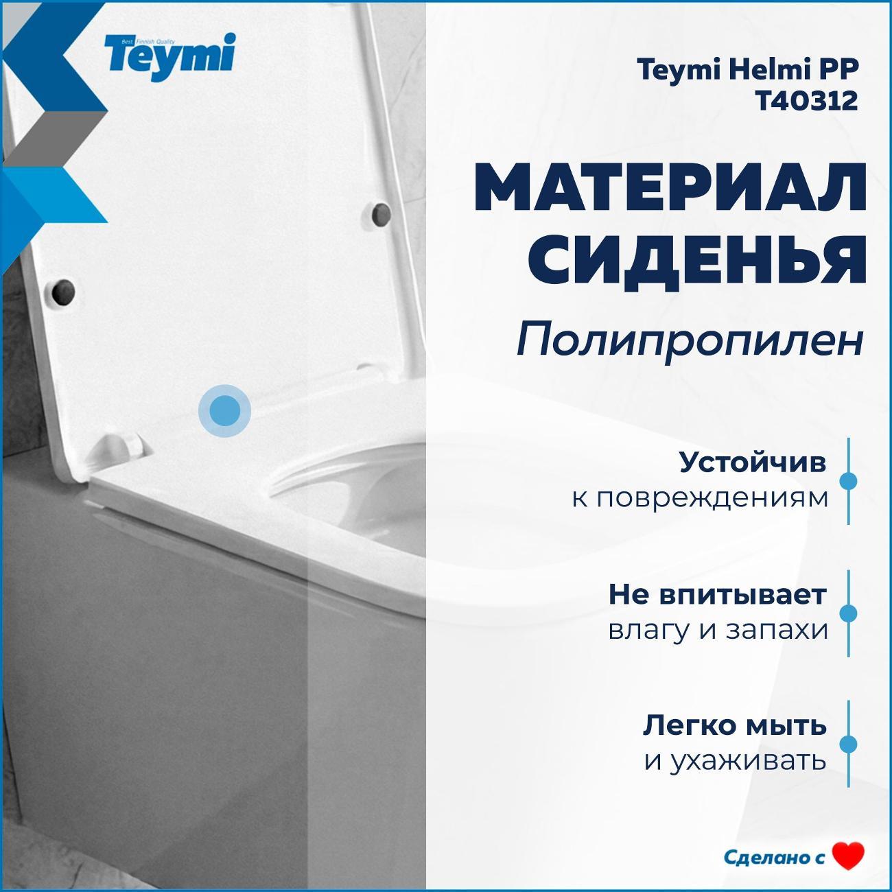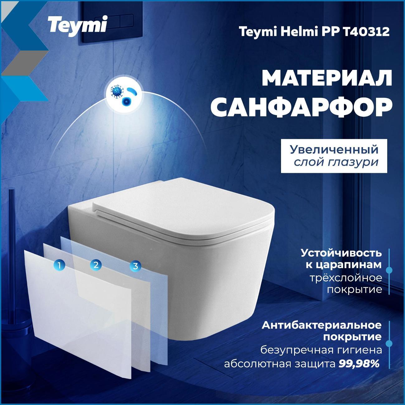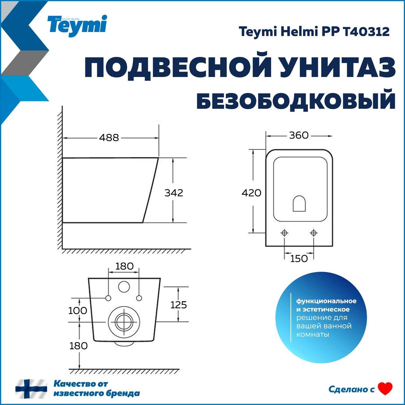 Подвесной унитаз Teymi Helmi PP — это воплощение финского подхода к комфорту: лаконичный дизайн, гигиеничность и продуманная эргономика. Прямоугольная чаша с глянцевой поверхностью и сглаженными углами визуально облегчает интерьер и идеально подходит для современных ванных комнат. Благодаря компактной глубине (48.8 см) модель станет отличным решением как для просторных, так и для небольших санузлов, сохраняя полезное пространство. Почему стоит выбрать Teymi Helmi: Безупречная гигиена. Чаша изготовлена из санфарфора с низкой пористостью. Трехслойное эмалевое покрытие и антибактериальная защита (99,98%) предотвращают впитывание запахов и образование налета. Безободковая конструкция (Rimless) не оставляет места для скопления грязи и микробов. Мощный смыв и чистота. Система каскадного смыва обеспечивает тщательное омывание всей внутренней поверхности чаши. Реализованная технология «антивсплеск» гарантирует отсутствие брызг при использовании. Надежное сиденье в комплекте. Унитаз поставляется с сиденьем из качественного полипропилена. Материал устойчив к повреждениям, не впитывает влагу и легок в уходе. Крепления из нержавеющей стали обеспечивают долгий срок службы. Тишина и комфорт. Крышка оснащена системой микролифт (Soft Close) — она опускается плавно и бесшумно, исключая риск удара о керамику. Механизм быстрого съема позволяет снять сиденье одним нажатием кнопки для идеальной уборки. Прочность конструкции. Несмотря на изящный подвесной вид, унитаз выдерживает нагрузку до 300 кг. Технические характеристики: Размеры (ШхВхГ): 360 × 342 × 488 мм. Тип монтажа: Подвесной (на инсталляцию). Выпуск: Горизонтальный (в стену). Материал: Санфарфор. Цвет: Белый глянец. Комплектация: Чаша унитаза, быстросъемное сиденье (полипропилен) с микролифтом, монтажный комплект к инсталляции, инструкция. Гарантия 10 лет от финского бренда Teymi подтверждает высокое качество изделия. Создайте стильное и гигиеничное пространство в вашей ванной с Teymi Helmi!