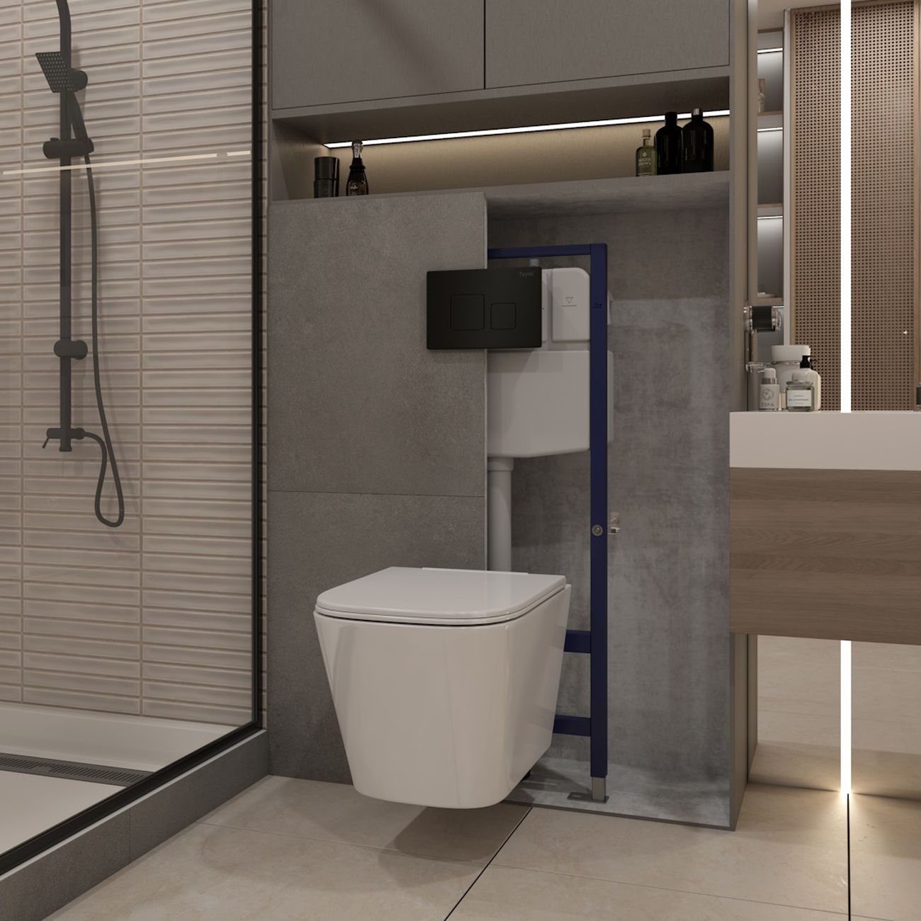 Комплект «Готовое решение» для установки инсталляции с подвесным унитазом: -- инсталляция TEYMI AINA 55 T70035 – монтажная рама из цельного стального профиля прямоугольного сечения, позволяющая выдерживать нагрузки до 400 кг. Габаритная ширина рамы 470 мм; -- цельнолитой бесшовный бачок скрытого монтажа; -- клавиша смыва TEYMI KATI T70702BM, цвет ЧЕРНЫЙ МАТОВЫЙ; -- унитаз подвесной безободковый Teymi Helmi Pro T40307; -- сиденье с микролифтом; -- полный комплект арматуры для монтажа: уплотнительные кольца, манжеты, труба смыва, фановый отвод с удлинителем, защитный кожух ревизионного окна с крепежной рамкой, закрывающей панелью и крышкой; -- полный комплект крепежа для установки: крепеж к стене, шпильки для унитаза, крепежная рамка, соединительные шпильки, толкатели, фиксаторы; -- инструкция по установке и обслуживанию. Преимущества комплекта: -- полная (максимальная) комплектация для установки - больше ничего докупать не придётся; -- все составляющие комплекта идеально подходят друг к другу; -- рама покрыта суперпрочной порошковой краской синего цвета с антикоррозионными свойствами; -- высота монтажной рамы может регулироваться с помощью ножек из оцинкованной стали; -- универсальный монтаж – межосевое расстояние под шпильки для подвесного унитаза 180 и 230 мм – подходит ко всем подвесным унитазам; -- сливной бачок скрытого монтажа, изготовленный из полиэтилена низкого давления, рассчитан на 200 тысяч циклов смыва, а цельнолитая бесшовная конструкция позволит работать без протечек в течение всего периода эксплуатации; -- 2-режимный слив 3 / 6 л с возможностью регулировки; -- лёгкость обслуживания бачка благодаря ревизионному окну, скрытому за клавишей смыва; -- гарантия 10 лет на весь комплект и 50 лет на стальную раму. Размер изделия: высота 1130 мм (регулируется) Х ширина 470 мм Х глубина 102 мм. Уважаемые покупатели, обращаем ваше внимание на то, что система инсталляции TEYMI AINA 55 может быть также укомплектована другими клавишами смыва или подвесными унитазами от бренда TEYMI (вы можете найти их на этом сайте по указанным артикулам). Предлагаем вам рассмотреть варианты сочетания со следующими клавишами: : HELMI хром T70202CH : HELMI черная T70203BM : HELMI белая T70018WM : HELMI нержавеющая сталь T70204 : HELMI черный матовый T70205 : HELMI белый глянцевый T70206 : LINA хром T70102CH : LINA черная T70103BM : LINA белая T70019WM : LINA нержавеющая сталь T70104 : LINA черный матовый T70105 : LINA белый матовый T70106 : AINA хром T70012CH : AINA черная T70013BM : AINA белая T70020WM : AINA нержавеющая сталь T70014 : KATI хром T70701CH : KATI черная T70702BM : KATI белая T70021WM : ELLIE хром T70022CH : ELLIE черная T70023BM : ELLIE белая T70024WM Также просим обратить взгляд на наши лучшие безободковые подвесные унитазы: : SOLLI T40201 : LINA S T40102 : HELMI S T40302 : HELMI VORTEX T40303 : IVA T40601 : ELLIE T40802 : LINA MEDIA T40105 : KATI T40701 : HANNA PRO T40901 : HELMI S BLACK T40302MB : VITRA PRO T40806 : VITRA T40804 : DEMI T40208 : LINA VORTEX T40110 : RITTA T40809 : LINA PRO T40106 : LINA S BLACK T40111