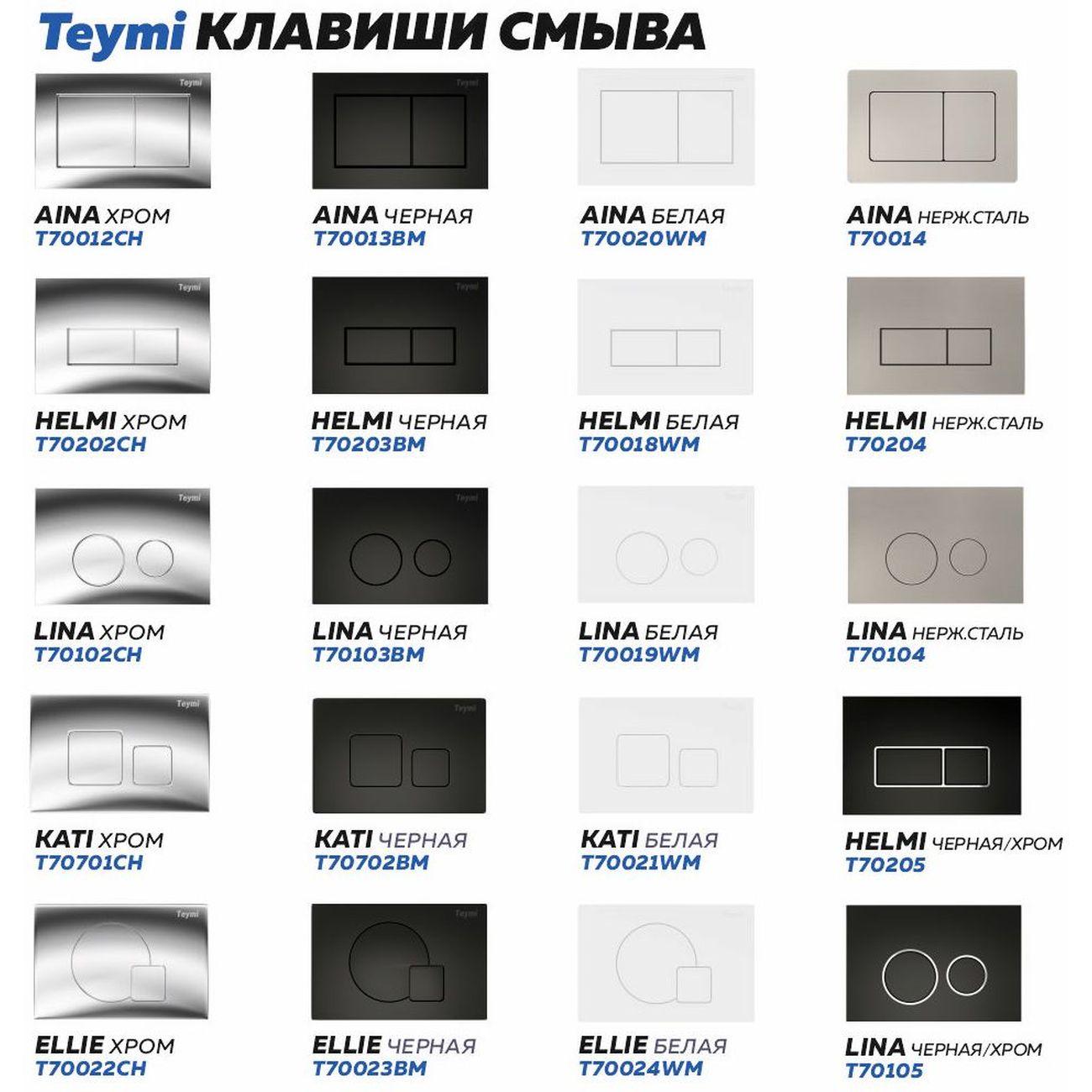 Комплект «Готовое решение» для установки инсталляции с подвесным унитазом: -- инсталляция TEYMI AINA 50 T70033 – монтажная рама из цельного стального профиля прямоугольного сечения, позволяющая выдерживать нагрузки до 400 кг. Габаритная ширина рамы 525 мм; -- цельнолитой бачок скрытого монтажа; -- клавиша смыва TEYMI AINA T70020WM, цвет БЕЛЫЙ МАТОВЫЙ; -- унитаз подвесной Teymi Helmi Pro Vortex T40310; -- быстросъёмное сиденье с микролифтом; -- полный комплект арматуры для монтажа, включающий в себя уплотнительные кольца и манжеты, трубу смыва, фановый отвод с удлинителем, защитный кожух ревизионного окна с крепежной рамкой, закрывающей панелью и крышкой; -- полный комплект крепежа для установки, а именно: крепеж к стене, шпильки для унитаза, крепежная рамка, соединительные шпильки, толкатели; -- инструкция по установке и обслуживанию. Преимущества комплекта: -- полная (максимальная) комплектация для установки - больше ничего докупать не придётся; -- все составляющие комплекта идеально подходят друг к другу; -- рама покрыта суперпрочной порошковой краской синего цвета с антикоррозионными свойствами; -- высота монтажной рамы может регулироваться с ходом до 20 см с помощью ножек из оцинкованной стали; -- универсальный монтаж – межосевое расстояние под шпильки для подвесного унитаза 180 и 230 мм – подходит ко всем подвесным унитазам; -- сливной бачок скрытого монтажа, изготовленный из полиэтилена низкого давления, рассчитан на 200 тысяч циклов смыва, а цельнолитая бесшовная конструкция позволит работать без протечек в течение всего периода эксплуатации; -- 2-режимный слив 3 / 6 л с возможностью регулировки; -- лёгкость обслуживания бачка благодаря ревизионному окну, скрытому за клавишей смыва; -- гарантия 10 лет на весь комплект и 50 лет на стальную раму. Размер инсталляции с бачком: высота 1055 мм Х ширина 525 мм Х глубина 96 мм. Уважаемые покупатели, обращаем ваше внимание на то, что система инсталляции TEYMI AINA 50 может быть также укомплектована другими клавишами смыва или подвесными унитазами от бренда TEYMI (вы можете найти их на этом сайте по указанным артикулам). Предлагаем вам рассмотреть варианты сочетания со следующими клавишами: : HELMI хром T70202CH : HELMI черная T70203BM : HELMI белая T70018WM : HELMI нержавеющая сталь T70204 : HELMI черный матовый T70205 : HELMI белый глянцевый T70206 : LINA хром T70102CH : LINA черная T70103BM : LINA белая T70019WM : LINA нержавеющая сталь T70104 : LINA черный матовый T70105 : LINA белый матовый T70106 : AINA хром T70012CH : AINA черная T70013BM : AINA белая T70020WM : AINA нержавеющая сталь T70014 : KATI хром T70701CH : KATI черная T70702BM : KATI белая T70021WM : ELLIE хром T70022CH : ELLIE черная T70023BM : ELLIE белая T70024WM Также просим обратить взгляд на наши лучшие безободковые подвесные унитазы: : SOLLI T40201 : LINA S T40102 : HELMI S T40302 : HELMI VORTEX T40303 : IVA T40601 : ELLIE T40802 : LINA MEDIA T40105 : KATI T40701 : HANNA PRO T40901 : HELMI S BLACK T40302MB : VITRA PRO T40806 : VITRA T40804 : DEMI T40208 : LINA VORTEX T40110 : RITTA T40809 : LINA PRO T40106 : LINA S BLACK T40111