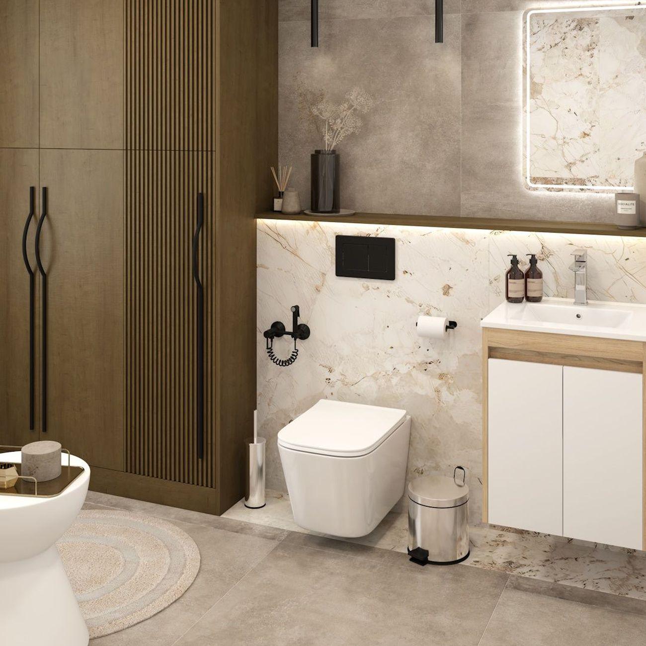 Комплект «Готовое решение» для установки инсталляции с подвесным унитазом: -- инсталляция TEYMI AINA 50 T70033 – монтажная рама из цельного стального профиля прямоугольного сечения, позволяющая выдерживать нагрузки до 400 кг. Габаритная ширина рамы 525 мм; -- цельнолитой бачок скрытого монтажа; -- клавиша смыва TEYMI XXXXXXX; -- унитаз подвесной Teymi Helmi Pro Vortex T40310; -- быстросъёмное сиденье с микролифтом; -- полный комплект арматуры для монтажа, включающий в себя уплотнительные кольца и манжеты, трубу смыва, фановый отвод с удлинителем, защитный кожух ревизионного окна с крепежной рамкой, закрывающей панелью и крышкой; -- полный комплект крепежа для установки, а именно: крепеж к стене, шпильки для унитаза, крепежная рамка, соединительные шпильки, толкатели; -- инструкция по установке и обслуживанию. Преимущества комплекта: -- полная (максимальная) комплектация для установки - больше ничего докупать не придётся; -- все составляющие комплекта идеально подходят друг к другу; -- рама покрыта суперпрочной порошковой краской синего цвета с антикоррозионными свойствами; -- высота монтажной рамы может регулироваться с ходом до 20 см с помощью ножек из оцинкованной стали; -- универсальный монтаж – межосевое расстояние под шпильки для подвесного унитаза 180 и 230 мм – подходит ко всем подвесным унитазам; -- сливной бачок скрытого монтажа, изготовленный из полиэтилена низкого давления, рассчитан на 200 тысяч циклов смыва, а цельнолитая бесшовная конструкция позволит работать без протечек в течение всего периода эксплуатации; -- 2-режимный слив 3 / 6 л с возможностью регулировки; -- лёгкость обслуживания бачка благодаря ревизионному окну, скрытому за клавишей смыва; -- гарантия 10 лет на весь комплект и 50 лет на стальную раму. Размер инсталляции с бачком: высота 1055 мм Х ширина 525 мм Х глубина 96 мм. Уважаемые покупатели, обращаем ваше внимание на то, что система инсталляции TEYMI AINA 50 может быть также укомплектована другими клавишами смыва или подвесными унитазами от бренда TEYMI (вы можете найти их на этом сайте по указанным артикулам). Предлагаем вам рассмотреть варианты сочетания со следующими клавишами: : HELMI хром T70202CH : HELMI черная T70203BM : HELMI белая T70018WM : HELMI нержавеющая сталь T70204 : HELMI черный матовый T70205 : HELMI белый глянцевый T70206 : LINA хром T70102CH : LINA черная T70103BM : LINA белая T70019WM : LINA нержавеющая сталь T70104 : LINA черный матовый T70105 : LINA белый матовый T70106 : AINA хром T70012CH : AINA черная T70013BM : AINA белая T70020WM : AINA нержавеющая сталь T70014 : KATI хром T70701CH : KATI черная T70702BM : KATI белая T70021WM : ELLIE хром T70022CH : ELLIE черная T70023BM : ELLIE белая T70024WM Также просим обратить взгляд на наши лучшие безободковые подвесные унитазы: : SOLLI T40201 : LINA S T40102 : HELMI S T40302 : HELMI VORTEX T40303 : IVA T40601 : ELLIE T40802 : LINA MEDIA T40105 : KATI T40701 : HANNA PRO T40901 : HELMI S BLACK T40302MB : VITRA PRO T40806 : VITRA T40804 : DEMI T40208 : LINA VORTEX T40110 : RITTA T40809 : LINA PRO T40106 : LINA S BLACK T40111