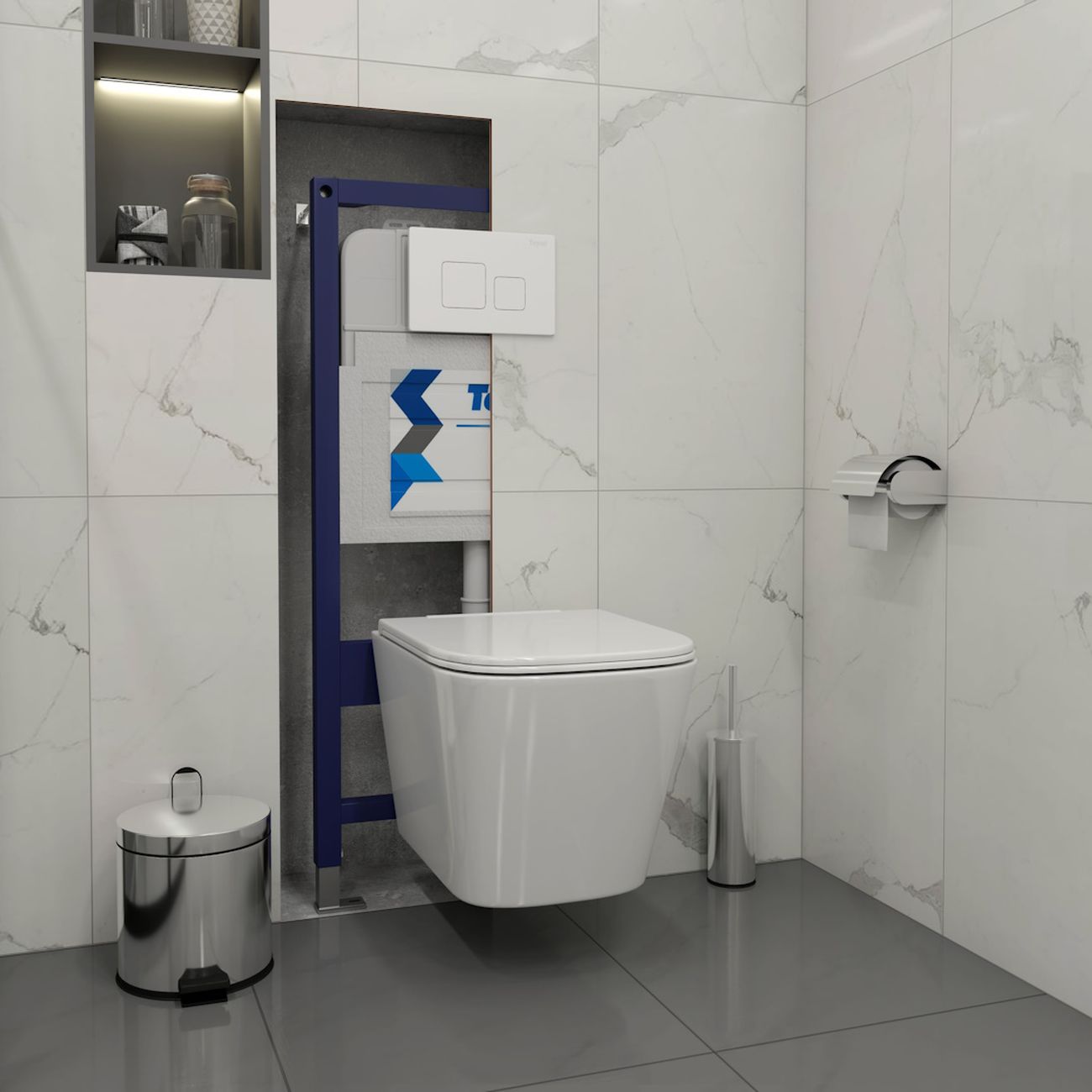 Комплект «Готовое решение» для установки инсталляции с подвесным унитазом включает: -- инсталляция TEYMI AINA 52 T70011 – монтажная рама из стального профиля толщиной 1.5 мм увеличенной ширины 52,5 см с дополнительными вертикальными усиливающими стойками, что позволяет выдерживать нагрузки до 400 кг; -- клавиша смыва TEYMI KATI T70021WM, цвет БЕЛЫЙ МАТОВЫЙ; -- унитаз подвесной TEYMI HELMI S T40302; -- быстросъёмное сиденье с микролифтом; -- полный комплект арматуры для монтажа, включающий в себя уплотнительные кольца и манжеты, трубу смыва, фановый отвод с удлинителем, защитный кожух ревизионного окна с крепежной рамкой, закрывающей панелью и крышкой; -- полный комплект крепежа для установки, а именно: крепеж к стене, шпильки для унитаза, крепежная рамка, соединительные шпильки, толкатели; -- инструкция по установке и обслуживанию. Преимущества комплекта «Готовое решение» для установки инсталляции с подвесным унитазом: -- полная (максимальная) комплектация для установки - больше ничего докупать не придётся; -- все составляющие комплекта идеально подходят друг к другу; -- взаимозаменяемость комплектующих; -- рама покрыта суперпрочной порошковой краской с антикоррозионными свойствами; -- высота рамы может регулироваться с ходом до 20 см с помощью ножек, изготовленных из оцинкованной стали; -- сливной бачок скрытого монтажа изготовлен из современных полимерных материалов и является цельнолитым (бесшовным), что позволяет ему работать без протечек в течение всего периода эксплуатации; -- лёгкость обслуживания сливного бачка достигается благодаря удобному ревизионному окну, скрытому за клавишей смыва; -- клавиша смыва имеет две кнопки и работает в режиме ЭКОНОМ / ПОЛНЫЙ (объёмы смыва 3 / 6 литров); -- гарантия на весь комплект составляет 10 лет, а рама прослужит все 50. Комплект «Готовое решение» для установки инсталляции TEYMI AINA 52 с подвесным унитазом TEYMI HELMI S T40302 и клавишей TEYMI KATI T70021WM в цвете белый матовый подобран специально для того, чтобы покупателям было проще сориентироваться в огромном выборе товаров для ванной комнаты. Оптимальное сочетание инсталляционной системы, клавиши смыва и подвесного унитаза позволит не задумываясь сделать правильный выбор. Инсталляция для подвесного унитаза от известного финского бренда TEYMI предназначена для оборудования санузлов и выгодно отличается своей надёжностью и простотой установки. Уважаемые покупатели, обращаем ваше внимание на то, что система инсталляции TEYMI AINA 52 может быть также укомплектована другими клавишами смыва или подвесными унитазами от бренда TEYMI (вы легко сможете найти их на этом сайте по указанным артикулам). Предлагаем вам рассмотреть варианты сочетания со следующими клавишами: : HELMI хром T70202CH : HELMI черная T70203BM : HELMI белая T70018WM : LINA хром T70102CH : LINA черная T70103BM : LINA белая T70019WM : AINA хром T70012CH : AINA черная T70013BM : AINA белая T70020WM : KATI хром T70701CH : KATI черная T70702BM : KATI белая T70021WM : ELLIE хром T70022CH : ELLIE черная T70023BM : ELLIE белая T70024WM Также просим обратить взгляд на наши лучшие безободковые подвесные унитазы: : SOLLI T40201 : LINA S T40102 : HELMI S T40302 : HELMI VORTEX T40303 : IVA T40601 : ELLIE T40802 : LINA MEDIA T40105 : LORI T40501 : KATI T40701 : HANNA PRO T40901 : HELMI S BLACK T40302MB : VITRA PRO T40806 : VITRA T40804 : DEMI T40208 : LINA VORTEX T40110 : RITTA T40809 : LINA PRO T40106