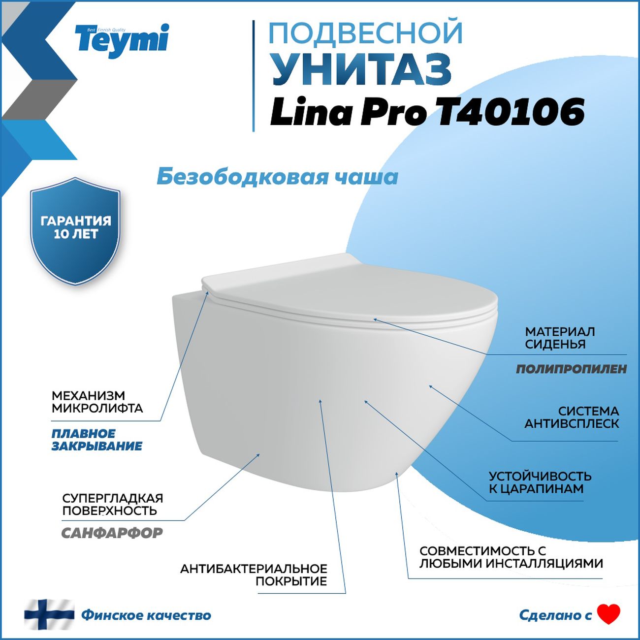 Комплект «Готовое решение» для установки инсталляции с подвесным унитазом включает: -- инсталляция TEYMI AINA 52 T70011 – монтажная рама из стального профиля толщиной 1.5 мм увеличенной ширины 52,5 см с дополнительными вертикальными усиливающими стойками, что позволяет выдерживать нагрузки до 400 кг; -- клавиша смыва TEYMI KATI T70021WM, цвет БЕЛЫЙ МАТОВЫЙ; -- унитаз подвесной TEYMI LINA PRO T40106; -- быстросъёмное сиденье с микролифтом; -- полный комплект арматуры для монтажа, включающий в себя уплотнительные кольца и манжеты, трубу смыва, фановый отвод с удлинителем, защитный кожух ревизионного окна с крепежной рамкой, закрывающей панелью и крышкой; -- полный комплект крепежа для установки, а именно: крепеж к стене, шпильки для унитаза, крепежная рамка, соединительные шпильки, толкатели; -- инструкция по установке и обслуживанию. Преимущества комплекта «Готовое решение» для установки инсталляции с подвесным унитазом: -- полная (максимальная) комплектация для установки - больше ничего докупать не придётся; -- все составляющие комплекта идеально подходят друг к другу; -- взаимозаменяемость комплектующих; -- рама покрыта суперпрочной порошковой краской с антикоррозионными свойствами; -- высота рамы может регулироваться с ходом до 20 см с помощью ножек, изготовленных из оцинкованной стали; -- сливной бачок скрытого монтажа изготовлен из современных полимерных материалов и является цельнолитым (бесшовным), что позволяет ему работать без протечек в течение всего периода эксплуатации; -- лёгкость обслуживания сливного бачка достигается благодаря удобному ревизионному окну, скрытому за клавишей смыва; -- клавиша смыва имеет две кнопки и работает в режиме ЭКОНОМ / ПОЛНЫЙ (объёмы смыва 3 / 6 литров); -- гарантия на весь комплект составляет 10 лет, а рама прослужит все 50. Комплект «Готовое решение» для установки инсталляции TEYMI AINA 52 с подвесным унитазом TEYMI LINA PRO T40106 и клавишей TEYMI KATI T70021WM в цвете белый матовый подобран специально для того, чтобы покупателям было проще сориентироваться в огромном выборе товаров для ванной комнаты. Оптимальное сочетание инсталляционной системы, клавиши смыва и подвесного унитаза позволит не задумываясь сделать правильный выбор. Инсталляция для подвесного унитаза от известного финского бренда TEYMI предназначена для оборудования санузлов и выгодно отличается своей надёжностью и простотой установки. Уважаемые покупатели, обращаем ваше внимание на то, что система инсталляции TEYMI AINA 52 может быть также укомплектована другими клавишами смыва или подвесными унитазами от бренда TEYMI (вы легко сможете найти их на этом сайте по указанным артикулам). Предлагаем вам рассмотреть варианты сочетания со следующими клавишами: : HELMI хром T70202CH : HELMI черная T70203BM : HELMI белая T70018WM : LINA хром T70102CH : LINA черная T70103BM : LINA белая T70019WM : AINA хром T70012CH : AINA черная T70013BM : AINA белая T70020WM : KATI хром T70701CH : KATI черная T70702BM : KATI белая T70021WM : ELLIE хром T70022CH : ELLIE черная T70023BM : ELLIE белая T70024WM Также просим обратить взгляд на наши лучшие безободковые подвесные унитазы: : SOLLI T40201 : LINA S T40102 : HELMI S T40302 : HELMI VORTEX T40303 : IVA T40601 : ELLIE T40802 : LINA MEDIA T40105 : LORI T40501 : KATI T40701 : HANNA PRO T40901 : HELMI S BLACK T40302MB : VITRA PRO T40806 : VITRA T40804 : DEMI T40208 : LINA VORTEX T40110 : RITTA T40809 : LINA PRO T40106
