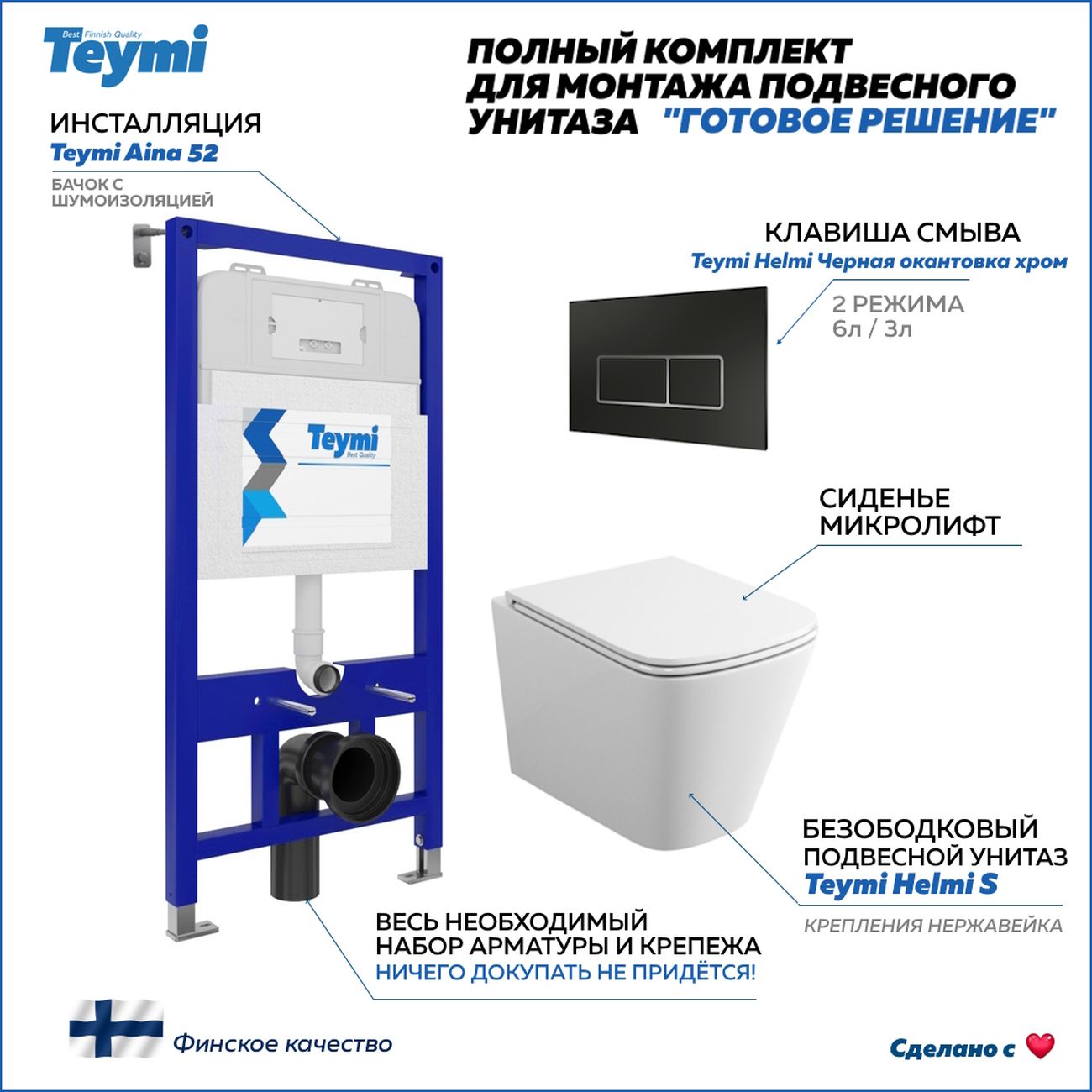 Комплект «Готовое решение» для установки инсталляции с подвесным унитазом включает: -- инсталляция TEYMI AINA 52 T70011 – монтажная рама из стального профиля толщиной 1.5 мм увеличенной ширины 52,5 см с дополнительными вертикальными усиливающими стойками, что позволяет выдерживать нагрузки до 400 кг; -- клавиша смыва TEYMI HELMI T70205, цвет ЧЕРНЫЙ МАТОВЫЙ, ОКАНТОВКА ХРОМ; -- унитаз подвесной TEYMI HELMI S T40302; -- быстросъёмное сиденье с микролифтом; -- полный комплект арматуры для монтажа, включающий в себя уплотнительные кольца и манжеты, трубу смыва, фановый отвод с удлинителем, защитный кожух ревизионного окна с крепежной рамкой, закрывающей панелью и крышкой; -- полный комплект крепежа для установки, а именно: крепеж к стене, шпильки для унитаза, крепежная рамка, соединительные шпильки, толкатели; -- инструкция по установке и обслуживанию. Преимущества комплекта «Готовое решение» для установки инсталляции с подвесным унитазом: -- полная (максимальная) комплектация для установки - больше ничего докупать не придётся; -- все составляющие комплекта идеально подходят друг к другу; -- взаимозаменяемость комплектующих; -- рама покрыта суперпрочной порошковой краской с антикоррозионными свойствами; -- высота рамы может регулироваться с ходом до 20 см с помощью ножек, изготовленных из оцинкованной стали; -- сливной бачок скрытого монтажа изготовлен из современных полимерных материалов и является цельнолитым (бесшовным), что позволяет ему работать без протечек в течение всего периода эксплуатации; -- лёгкость обслуживания сливного бачка достигается благодаря удобному ревизионному окну, скрытому за клавишей смыва; -- клавиша смыва имеет две кнопки и работает в режиме ЭКОНОМ / ПОЛНЫЙ (объёмы смыва 3 / 6 литров); -- гарантия на весь комплект составляет 10 лет, а рама прослужит все 50. Уважаемые покупатели, обращаем ваше внимание на то, что система инсталляции TEYMI AINA 52 может быть также укомплектована другими клавишами смыва или подвесными унитазами от бренда TEYMI (вы можете найти их на этом сайте по указанным артикулам). Предлагаем вам рассмотреть варианты сочетания со следующими клавишами: : HELMI хром T70202CH : HELMI черная T70203BM : HELMI белая T70018WM : LINA хром T70102CH : LINA черная T70103BM : LINA белая T70019WM : AINA хром T70012CH : AINA черная T70013BM : AINA белая T70020WM : KATI хром T70701CH : KATI черная T70702BM : KATI белая T70021WM : ELLIE хром T70022CH : ELLIE черная T70023BM : ELLIE белая T70024WM Также просим обратить взгляд на наши лучшие безободковые подвесные унитазы: : SOLLI T40201 : LINA S T40102 : HELMI S T40302 : HELMI VORTEX T40303 : IVA T40601 : ELLIE T40802 : LINA MEDIA T40105 : KATI T40701 : HANNA PRO T40901 : HELMI S BLACK T40302MB : VITRA PRO T40806 : VITRA T40804 : DEMI T40208 : LINA VORTEX T40110 : RITTA T40809 : LINA PRO T40106 : LINA S BLACK T40111