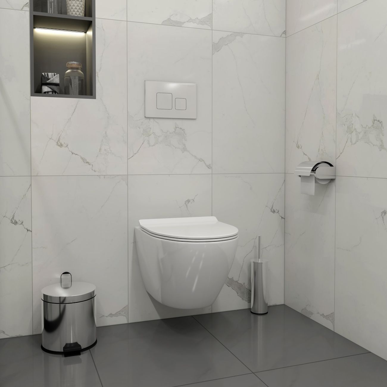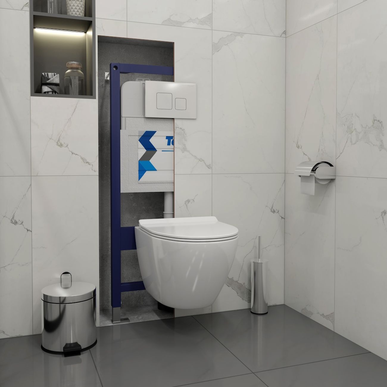 Комплект «Готовое решение» для установки инсталляции с подвесным унитазом включает в себя полный комплект всего необходимого, в том числе: -- инсталляция TEYMI AINA 52 T70011 – мощная монтажная рама из стального профиля толщиной 1.5 мм увеличенной ширины 52,5 см с дополнительными вертикальными усиливающими стойками, что позволяет выдерживать нагрузки до 400 кг; -- клавиша смыва TEYMI KATI T70701CH, цвет ХРОМ; -- унитаз подвесной безодобковый TEYMI LINA PRO T40106; -- ультратонкое сиденье с микролифтом; -- полный комплект арматуры для монтажа, включающий в себя уплотнительные кольца и манжеты, трубу смыва, фановый отвод с удлинителем, защитный кожух ревизионного окна с крепежной рамкой, закрывающей панелью и крышкой; -- полный комплект крепежа для установки, а именно: крепеж к стене, шпильки для унитаза, крепежная рамка, соединительные шпильки, толкатели; -- инструкция по установке и обслуживанию продукции на русском языке. Преимущества комплекта «Готовое решение» для установки инсталляции с подвесным унитазом: -- полная (максимальная) комплектация для установки - больше ничего докупать не придётся; -- все составляющие комплекта тщательно подобраны и идеально подходят друг к другу; -- известный финский бренд TEYMI, получивший признание покупателей на российском рынке; -- взаимозаменяемость – всегда можно заменить на другой унитаз или клавишу смыва; -- рама инсталляции покрыта суперпрочной порошковой краской с антикоррозионными свойствами; -- высота монтажной рамы может регулироваться с ходом до 20 см с помощью ножек, изготовленных из оцинкованной стали; -- сливной бачок скрытого монтажа изготовлен из современных полимерных материалов и является цельнолитым (бесшовным), что позволяет ему работать без протечек в течение всего периода эксплуатации; -- лёгкость обслуживания сливного бачка достигается благодаря удобному ревизионному окну, скрытому за клавишей смыва; -- клавиша смыва имеет две кнопки и работает в режиме ЭКОНОМ / ПОЛНЫЙ (объёмы смыва 3 литра / 6 литров); -- гарантия на весь комплект составляет 10 лет, а рама прослужит все 50; -- наши специалисты всегда рады оказать вам консультационную помощь. Комплект «Готовое решение» для установки инсталляции TEYMI AINA 52 с подвесным унитазом TEYMI LINA PRO T40106 и клавишей TEYMI KATI T70701CH в цвете хром подобран специально для того, чтобы покупателям было проще сориентироваться в огромном выборе товаров для ванной комнаты. Оптимальное сочетание инсталляционной системы, клавиши смыва и подвесного унитаза позволит не задумываясь сделать правильный выбор. Инсталляция для подвесного унитаза от известного финского бренда TEYMI предназначена для оборудования санузлов и выгодно отличается своей надёжностью и простотой установки. В комплект инсталляционной системы TEYMI AINA 52 входит цельнолитой смывной бачок белого цвета с ревизионным отверстием для удобного доступа к обслуживанию; стальная монтажная рама повышенной ширины и дополнительным усилением, окрашенная стойкой антикоррозионной порошковой краской синего вета; регулируемые по высоте ножки из оцинкованной стали (ход по высоте 20 см), полный комплект арматуры и деталей крепления для монтажа, а также подробная документация и чертежи на русском языке. Стальной каркас рамы инсталляции сертифицирован при нагрузке свыше 400 кг. Подвесной безободковый унитаз TEYMI LINA PRO T40106 от известного финского 