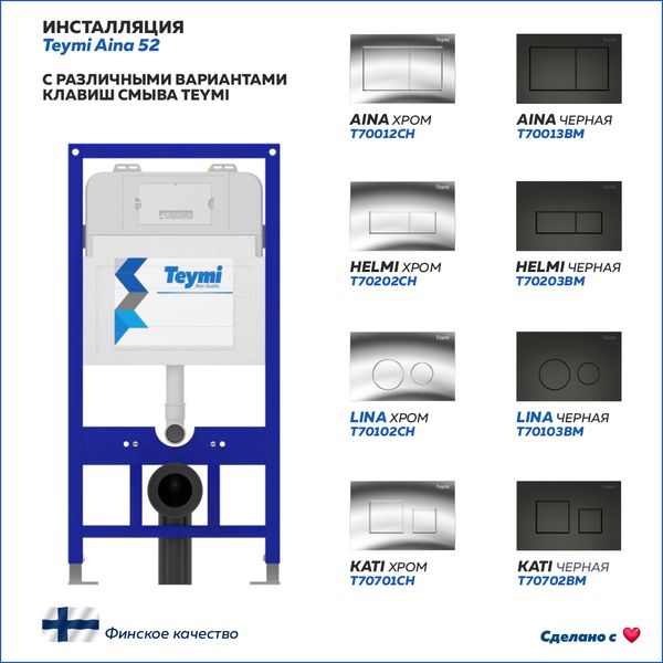 Комплект «Готовое решение» для установки инсталляции с подвесным унитазом включает в себя полный комплект всего необходимого, в том числе: -- инсталляция TEYMI AINA 52 T70011 – мощная монтажная рама из стального профиля толщиной 1.5 мм увеличенной ширины 52,5 см с дополнительными вертикальными усиливающими стойками, что позволяет выдерживать нагрузки до 400 кг; -- цельнолитой бачок скрытого монтажа, обшитый кожухом из пенопласта; -- клавиша смыва TEYMI AINA T70012CH, цвет ХРОМ; -- унитаз подвесной безодобковый TEYMI HELMI S T40302; -- ультратонкое сиденье с микролифтом; -- полный комплект арматуры для монтажа, включающий в себя уплотнительные кольца и манжеты, трубу смыва, фановый отвод с удлинителем, защитный кожух ревизионного окна с крепежной рамкой, закрывающей панелью и крышкой; -- полный комплект крепежа для установки, а именно: крепеж к стене, шпильки для унитаза, крепежная рамка, соединительные шпильки, толкатели; -- инструкция по установке и обслуживанию продукции на русском языке. Преимущества комплекта «Готовое решение» для установки инсталляции с подвесным унитазом: -- полная (максимальная) комплектация для установки - больше ничего докупать не придётся; -- все составляющие комплекта тщательно подобраны и идеально подходят друг к другу; -- известный финский бренд TEYMI, получивший признание покупателей на российском рынке; -- взаимозаменяемость – всегда можно заменить на другой унитаз или клавишу смыва; -- рама инсталляции покрыта суперпрочной порошковой краской с антикоррозионными свойствами; -- высота монтажной рамы может регулироваться с ходом до 20 см с помощью ножек, изготовленных из оцинкованной стали; -- сливной бачок скрытого монтажа изготовлен из современных полимерных материалов и является цельнолитым (бесшовным), что позволяет ему работать без протечек в течение всего периода эксплуатации; -- специальный кожух из пенопласта защищает сливной бачок от возникновения конденсата и создаёт дополнительную шумоизоляцию; -- лёгкость обслуживания сливного бачка достигается благодаря удобному ревизионному окну, скрытому за клавишей смыва; -- клавиша смыва имеет две кнопки и работает в режиме ЭКОНОМ / ПОЛНЫЙ (объёмы смыва 3 литра / 6 литров); -- гарантия на весь комплект составляет 10 лет, а рама прослужит все 50; -- наши специалисты всегда рады оказать вам консультационную помощь. Комплект «Готовое решение» для установки инсталляции TEYMI AINA 52 с подвесным унитазом TEYMI HELMI S T40302 и клавишей TEYMI AINA T70012CH в цвете хром подобран специально для того, чтобы покупателям было проще сориентироваться в огромном выборе товаров для ванной комнаты. Оптимальное сочетание инсталляционной системы, клавиши смыва и подвесного унитаза позволит не задумываясь сделать правильный выбор. Инсталляция для подвесного унитаза от известного финского бренда TEYMI предназначена для оборудования санузлов и выгодно отличается своей надёжностью и простотой установки. В комплект инсталляционной системы TEYMI AINA 52 входит цельнолитой смывной бачок белого цвета с ревизионным отверстием для удобного доступа к обслуживанию; кожух из пенопласта для защиты от конденсата и дополнительной шумоизоляции; стальная монтажная рама повышенной ширины и дополнительным усилением, окрашенная стойкой антикоррозионной порошковой краской синего вета; регулируемые по высоте ножки из оцинкованной стали (ход п