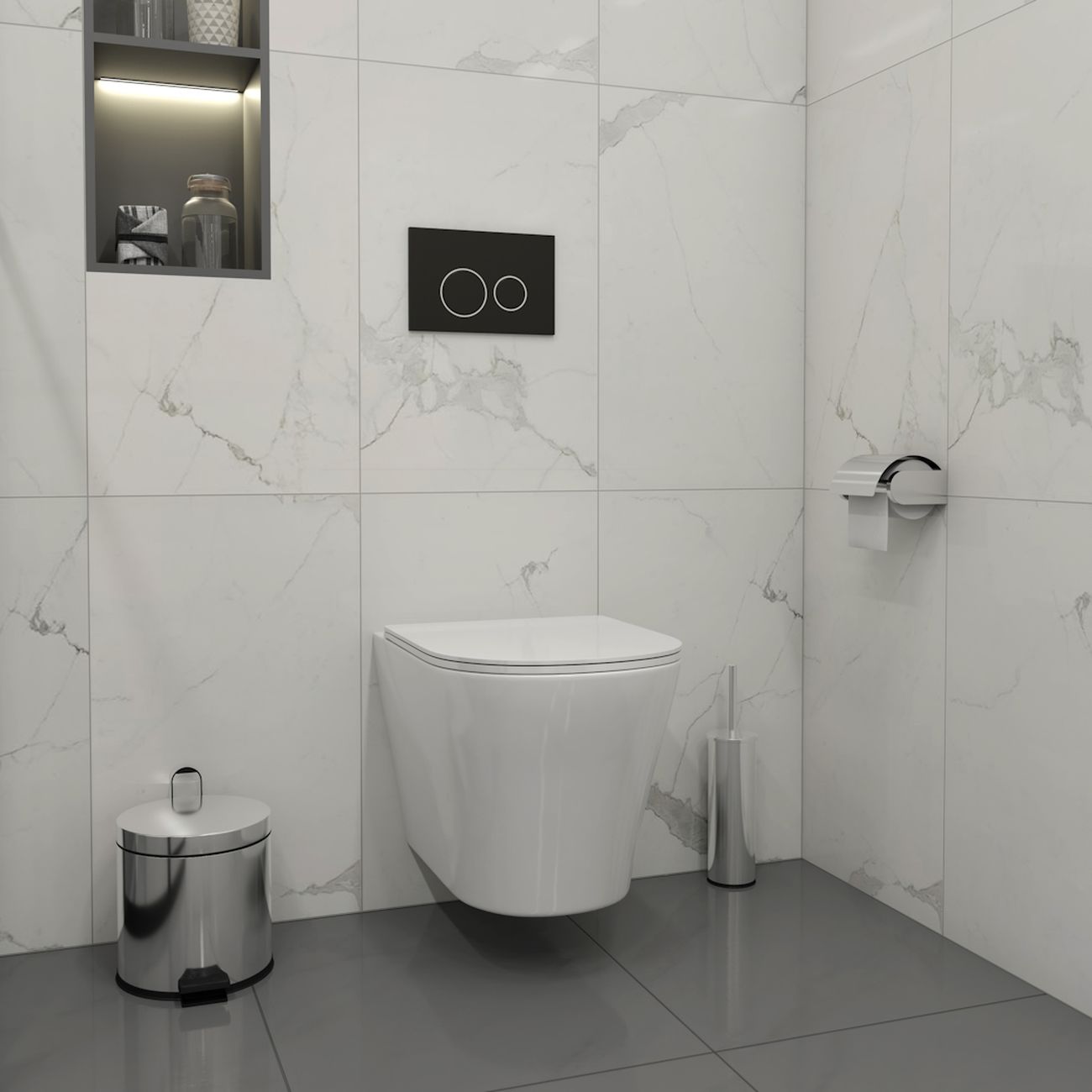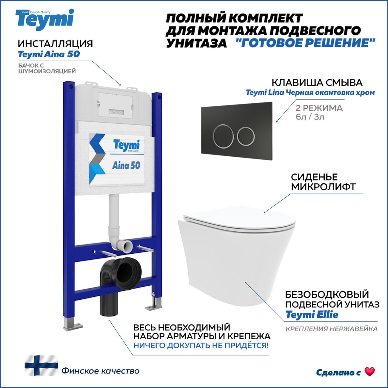 Комплект «Готовое решение» для установки инсталляции с подвесным унитазом: -- инсталляция TEYMI AINA 50 T70033 – монтажная рама из цельного стального профиля прямоугольного сечения, позволяющая выдерживать нагрузки до 400 кг. Габаритная ширина рамы 525 мм; -- клавиша смыва TEYMI LINA T70105, цвет ЧЕРНЫЙ МАТОВЫЙ, ОКАНТОВКА ХРОМ; -- унитаз подвесной TEYMI ELLIE T40802; -- быстросъёмное сиденье с микролифтом; -- полный комплект арматуры для монтажа, включающий в себя уплотнительные кольца и манжеты, трубу смыва, фановый отвод с удлинителем, защитный кожух ревизионного окна с крепежной рамкой, закрывающей панелью и крышкой; -- полный комплект крепежа для установки, а именно: крепеж к стене, шпильки для унитаза, крепежная рамка, соединительные шпильки, толкатели; -- инструкция по установке и обслуживанию. Преимущества комплекта: -- полная (максимальная) комплектация для установки - больше ничего докупать не придётся; -- все составляющие комплекта идеально подходят друг к другу; -- рама покрыта суперпрочной порошковой краской синего цвета с антикоррозионными свойствами; -- высота монтажной рамы может регулироваться с ходом до 20 см с помощью ножек из оцинкованной стали; -- универсальный монтаж – межосевое расстояние под шпильки для подвесного унитаза 180 и 230 мм – подходит ко всем подвесным унитазам; -- сливной бачок скрытого монтажа, изготовленный из полиэтилена низкого давления, рассчитан на 200 тысяч циклов смыва, а цельнолитая бесшовная конструкция позволит работать без протечек в течение всего периода эксплуатации; -- 2-режимный слив 3 / 6 л с возможностью регулировки; -- лёгкость обслуживания бачка благодаря ревизионному окну, скрытому за клавишей смыва; -- гарантия 10 лет на весь комплект и 50 лет на стальную раму. Размер инсталляции с бачком: высота 1055 мм Х ширина 525 мм Х глубина 96 мм. Уважаемые покупатели, обращаем ваше внимание на то, что система инсталляции TEYMI AINA 50 может быть также укомплектована другими клавишами смыва или подвесными унитазами от бренда TEYMI (вы можете найти их на этом сайте по указанным артикулам). Предлагаем вам рассмотреть варианты сочетания со следующими клавишами: : HELMI хром T70202CH : HELMI черная T70203BM : HELMI белая T70018WM : HELMI нержавеющая сталь T70204 : HELMI черный матовый T70205 : HELMI белый глянцевый T70206 : LINA хром T70102CH : LINA черная T70103BM : LINA белая T70019WM : LINA нержавеющая сталь T70104 : LINA черный матовый T70105 : LINA белый матовый T70106 : AINA хром T70012CH : AINA черная T70013BM : AINA белая T70020WM : AINA нержавеющая сталь T70014 : KATI хром T70701CH : KATI черная T70702BM : KATI белая T70021WM : ELLIE хром T70022CH : ELLIE черная T70023BM : ELLIE белая T70024WM Также просим обратить взгляд на наши лучшие безободковые подвесные унитазы: : SOLLI T40201 : LINA S T40102 : HELMI S T40302 : HELMI VORTEX T40303 : IVA T40601 : ELLIE T40802 : LINA MEDIA T40105 : KATI T40701 : HANNA PRO T40901 : HELMI S BLACK T40302MB : VITRA PRO T40806 : VITRA T40804 : DEMI T40208 : LINA VORTEX T40110 : RITTA T40809 : LINA PRO T40106 : LINA S BLACK T40111