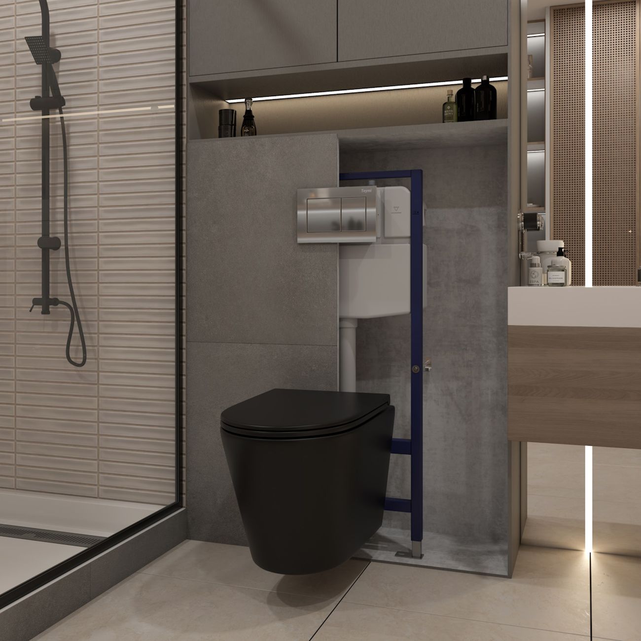 Комплект «Готовое решение» для установки инсталляции с подвесным унитазом: -- инсталляция TEYMI AINA 55 T70035 – монтажная рама из цельного стального профиля прямоугольного сечения, позволяющая выдерживать нагрузки до 400 кг. Габаритная ширина рамы 470 мм; -- клавиша смыва TEYMI AINA T70012CH, цвет ХРОМ ГЛЯНЕЦ; -- унитаз подвесной безободковый TEYMI SOLLI ЧЕРНЫЙ T40201MB; -- сиденье с микролифтом; -- полный комплект арматуры для монтажа: уплотнительные кольца, манжеты, труба смыва, фановый отвод с удлинителем, защитный кожух ревизионного окна с крепежной рамкой, закрывающей панелью и крышкой; -- полный комплект крепежа для установки: крепеж к стене, шпильки для унитаза, крепежная рамка, соединительные шпильки, толкатели, фиксаторы; -- инструкция по установке и обслуживанию. Преимущества комплекта: -- полная (максимальная) комплектация для установки - больше ничего докупать не придётся; -- все составляющие комплекта идеально подходят друг к другу; -- рама покрыта суперпрочной порошковой краской синего цвета с антикоррозионными свойствами; -- высота монтажной рамы может регулироваться с помощью ножек из оцинкованной стали; -- универсальный монтаж – межосевое расстояние под шпильки для подвесного унитаза 180 и 230 мм – подходит ко всем подвесным унитазам; -- сливной бачок скрытого монтажа, изготовленный из полиэтилена низкого давления, рассчитан на 200 тысяч циклов смыва, а цельнолитая бесшовная конструкция позволит работать без протечек в течение всего периода эксплуатации; -- 2-режимный слив 3 / 6 л с возможностью регулировки; -- лёгкость обслуживания бачка благодаря ревизионному окну, скрытому за клавишей смыва; -- гарантия 10 лет на весь комплект и 50 лет на стальную раму. Размер изделия: высота 1130 мм (регулируется) Х ширина 470 мм Х глубина 102 мм. Уважаемые покупатели, обращаем ваше внимание на то, что система инсталляции TEYMI AINA 55 может быть также укомплектована другими клавишами смыва или подвесными унитазами от бренда TEYMI (вы можете найти их на этом сайте по указанным артикулам). Предлагаем вам рассмотреть варианты сочетания со следующими клавишами: : HELMI хром T70202CH : HELMI черная T70203BM : HELMI белая T70018WM : HELMI нержавеющая сталь T70204 : HELMI черный матовый T70205 : HELMI белый глянцевый T70206 : LINA хром T70102CH : LINA черная T70103BM : LINA белая T70019WM : LINA нержавеющая сталь T70104 : LINA черный матовый T70105 : LINA белый матовый T70106 : AINA хром T70012CH : AINA черная T70013BM : AINA белая T70020WM : AINA нержавеющая сталь T70014 : KATI хром T70701CH : KATI черная T70702BM : KATI белая T70021WM : ELLIE хром T70022CH : ELLIE черная T70023BM : ELLIE белая T70024WM Также просим обратить взгляд на наши лучшие безободковые подвесные унитазы: : SOLLI T40201 : LINA S T40102 : HELMI S T40302 : HELMI VORTEX T40303 : IVA T40601 : ELLIE T40802 : LINA MEDIA T40105 : KATI T40701 : HANNA PRO T40901 : HELMI S BLACK T40302MB : VITRA PRO T40806 : VITRA T40804 : DEMI T40208 : LINA VORTEX T40110 : RITTA T40809 : LINA PRO T40106 : LINA S BLACK T40111