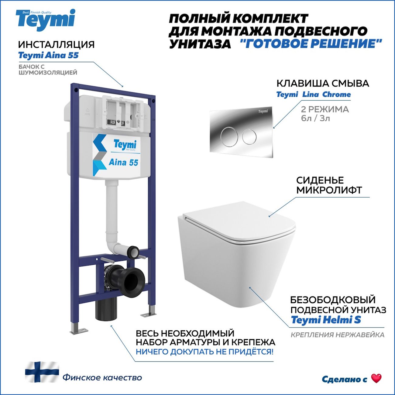 Комплект «Готовое решение» для установки инсталляции с подвесным унитазом: -- инсталляция TEYMI AINA 55 T70035 – монтажная рама из цельного стального профиля прямоугольного сечения, позволяющая выдерживать нагрузки до 400 кг. Габаритная ширина рамы 470 мм; -- клавиша смыва TEYMI LINA T70102CH, цвет ХРОМ ГЛЯНЕЦ; -- унитаз подвесной безободковый TEYMI HELMI S T40302; -- сиденье с микролифтом; -- полный комплект арматуры для монтажа: уплотнительные кольца, манжеты, труба смыва, фановый отвод с удлинителем, защитный кожух ревизионного окна с крепежной рамкой, закрывающей панелью и крышкой; -- полный комплект крепежа для установки: крепеж к стене, шпильки для унитаза, крепежная рамка, соединительные шпильки, толкатели, фиксаторы; -- инструкция по установке и обслуживанию. Преимущества комплекта: -- полная (максимальная) комплектация для установки - больше ничего докупать не придётся; -- все составляющие комплекта идеально подходят друг к другу; -- рама покрыта суперпрочной порошковой краской синего цвета с антикоррозионными свойствами; -- высота монтажной рамы может регулироваться с помощью ножек из оцинкованной стали; -- универсальный монтаж – межосевое расстояние под шпильки для подвесного унитаза 180 и 230 мм – подходит ко всем подвесным унитазам; -- сливной бачок скрытого монтажа, изготовленный из полиэтилена низкого давления, рассчитан на 200 тысяч циклов смыва, а цельнолитая бесшовная конструкция позволит работать без протечек в течение всего периода эксплуатации; -- 2-режимный слив 3 / 6 л с возможностью регулировки; -- лёгкость обслуживания бачка благодаря ревизионному окну, скрытому за клавишей смыва; -- гарантия 10 лет на весь комплект и 50 лет на стальную раму. Размер изделия: высота 1130 мм (регулируется) Х ширина 470 мм Х глубина 102 мм. Уважаемые покупатели, обращаем ваше внимание на то, что система инсталляции TEYMI AINA 55 может быть также укомплектована другими клавишами смыва или подвесными унитазами от бренда TEYMI (вы можете найти их на этом сайте по указанным артикулам). Предлагаем вам рассмотреть варианты сочетания со следующими клавишами: : HELMI хром T70202CH : HELMI черная T70203BM : HELMI белая T70018WM : HELMI нержавеющая сталь T70204 : HELMI черный матовый T70205 : HELMI белый глянцевый T70206 : LINA хром T70102CH : LINA черная T70103BM : LINA белая T70019WM : LINA нержавеющая сталь T70104 : LINA черный матовый T70105 : LINA белый матовый T70106 : AINA хром T70012CH : AINA черная T70013BM : AINA белая T70020WM : AINA нержавеющая сталь T70014 : KATI хром T70701CH : KATI черная T70702BM : KATI белая T70021WM : ELLIE хром T70022CH : ELLIE черная T70023BM : ELLIE белая T70024WM Также просим обратить взгляд на наши лучшие безободковые подвесные унитазы: : SOLLI T40201 : LINA S T40102 : HELMI S T40302 : HELMI VORTEX T40303 : IVA T40601 : ELLIE T40802 : LINA MEDIA T40105 : KATI T40701 : HANNA PRO T40901 : HELMI S BLACK T40302MB : VITRA PRO T40806 : VITRA T40804 : DEMI T40208 : LINA VORTEX T40110 : RITTA T40809 : LINA PRO T40106 : LINA S BLACK T40111