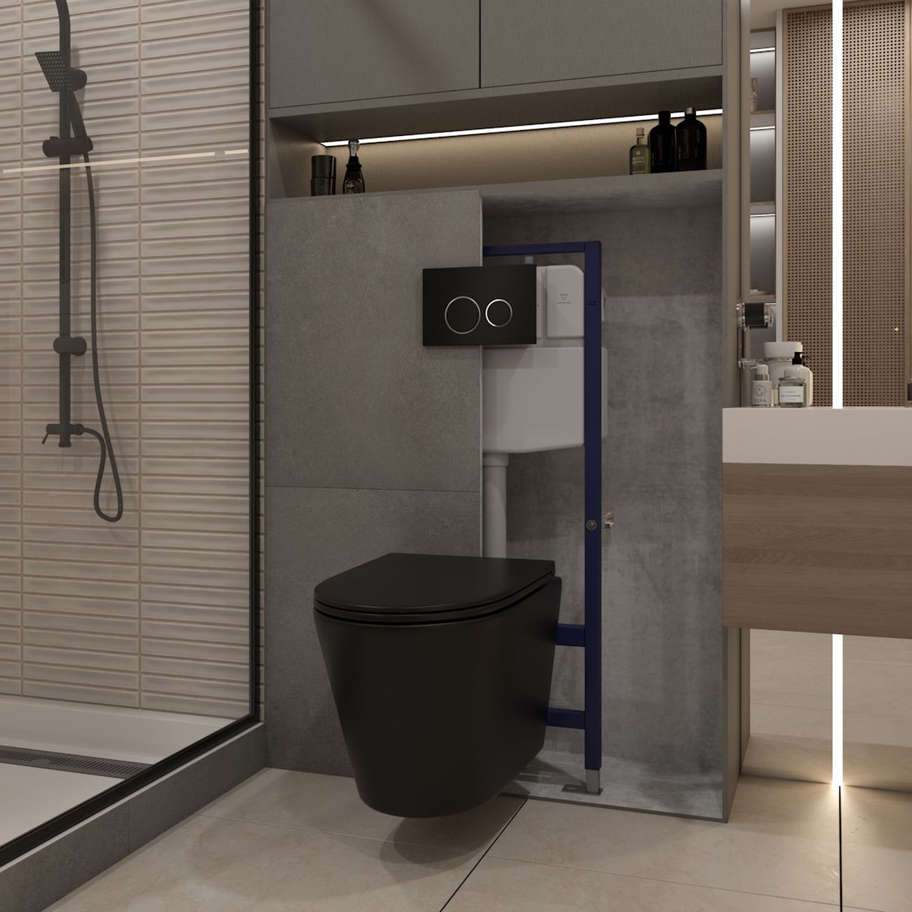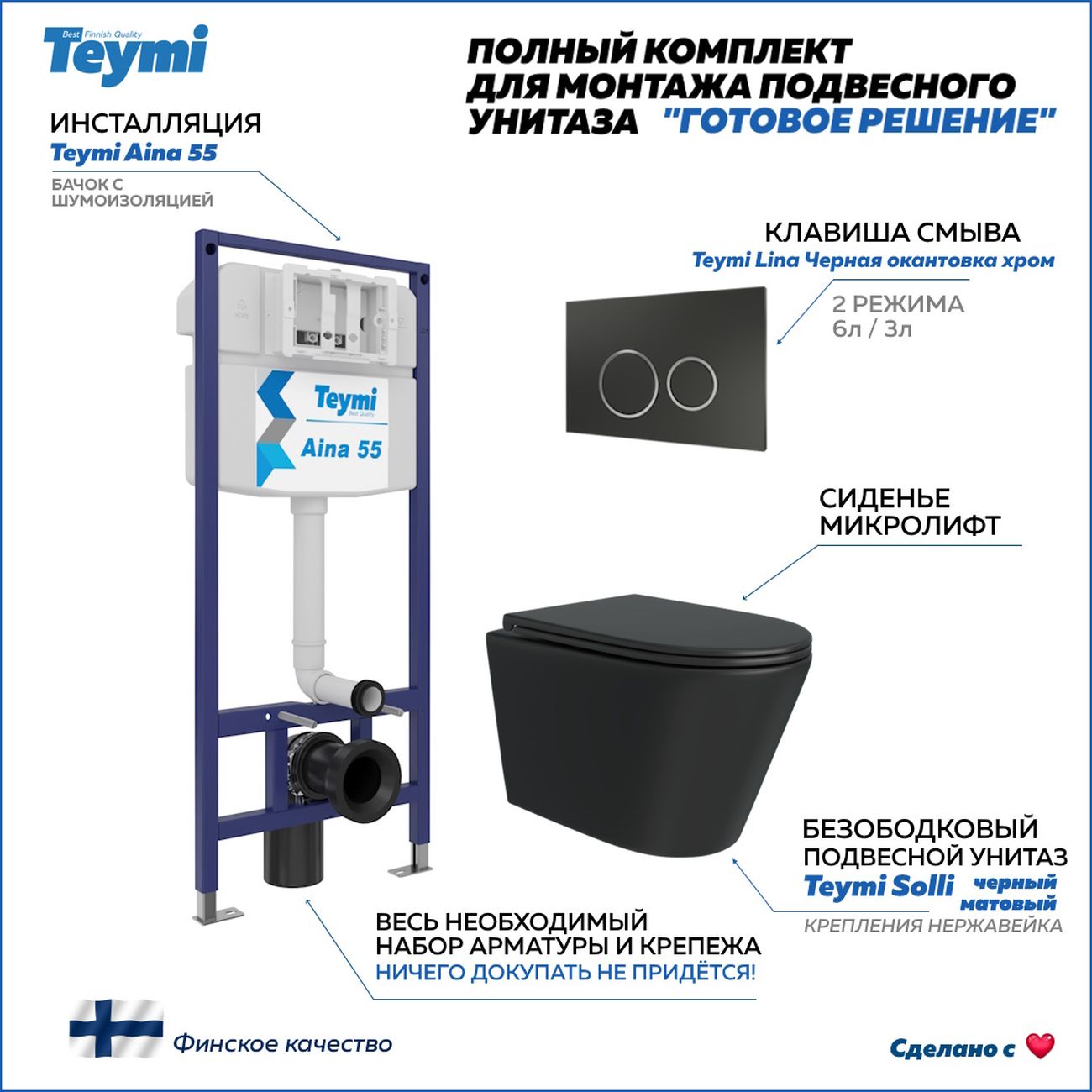 Комплект «Готовое решение» для установки инсталляции с подвесным унитазом: -- инсталляция TEYMI AINA 55 T70035 – монтажная рама из цельного стального профиля прямоугольного сечения, позволяющая выдерживать нагрузки до 400 кг. Габаритная ширина рамы 470 мм; -- клавиша смыва TEYMI LINA T70105, цвет ЧЕРНЫЙ МАТОВЫЙ, ОКАНТОВКА ХРОМ; -- унитаз подвесной безободковый TEYMI SOLLI ЧЕРНЫЙ T40201MB; -- сиденье с микролифтом; -- полный комплект арматуры для монтажа: уплотнительные кольца, манжеты, труба смыва, фановый отвод с удлинителем, защитный кожух ревизионного окна с крепежной рамкой, закрывающей панелью и крышкой; -- полный комплект крепежа для установки: крепеж к стене, шпильки для унитаза, крепежная рамка, соединительные шпильки, толкатели, фиксаторы; -- инструкция по установке и обслуживанию. Преимущества комплекта: -- полная (максимальная) комплектация для установки - больше ничего докупать не придётся; -- все составляющие комплекта идеально подходят друг к другу; -- рама покрыта суперпрочной порошковой краской синего цвета с антикоррозионными свойствами; -- высота монтажной рамы может регулироваться с помощью ножек из оцинкованной стали; -- универсальный монтаж – межосевое расстояние под шпильки для подвесного унитаза 180 и 230 мм – подходит ко всем подвесным унитазам; -- сливной бачок скрытого монтажа, изготовленный из полиэтилена низкого давления, рассчитан на 200 тысяч циклов смыва, а цельнолитая бесшовная конструкция позволит работать без протечек в течение всего периода эксплуатации; -- 2-режимный слив 3 / 6 л с возможностью регулировки; -- лёгкость обслуживания бачка благодаря ревизионному окну, скрытому за клавишей смыва; -- гарантия 10 лет на весь комплект и 50 лет на стальную раму. Размер изделия: высота 1130 мм (регулируется) Х ширина 470 мм Х глубина 102 мм. Уважаемые покупатели, обращаем ваше внимание на то, что система инсталляции TEYMI AINA 55 может быть также укомплектована другими клавишами смыва или подвесными унитазами от бренда TEYMI (вы можете найти их на этом сайте по указанным артикулам). Предлагаем вам рассмотреть варианты сочетания со следующими клавишами: : HELMI хром T70202CH : HELMI черная T70203BM : HELMI белая T70018WM : HELMI нержавеющая сталь T70204 : HELMI черный матовый T70205 : HELMI белый глянцевый T70206 : LINA хром T70102CH : LINA черная T70103BM : LINA белая T70019WM : LINA нержавеющая сталь T70104 : LINA черный матовый T70105 : LINA белый матовый T70106 : AINA хром T70012CH : AINA черная T70013BM : AINA белая T70020WM : AINA нержавеющая сталь T70014 : KATI хром T70701CH : KATI черная T70702BM : KATI белая T70021WM : ELLIE хром T70022CH : ELLIE черная T70023BM : ELLIE белая T70024WM Также просим обратить взгляд на наши лучшие безободковые подвесные унитазы: : SOLLI T40201 : LINA S T40102 : HELMI S T40302 : HELMI VORTEX T40303 : IVA T40601 : ELLIE T40802 : LINA MEDIA T40105 : KATI T40701 : HANNA PRO T40901 : HELMI S BLACK T40302MB : VITRA PRO T40806 : VITRA T40804 : DEMI T40208 : LINA VORTEX T40110 : RITTA T40809 : LINA PRO T40106 : LINA S BLACK T40111