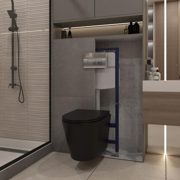 Комплект «Готовое решение» для установки инсталляции с подвесным унитазом: -- инсталляция TEYMI AINA 55 T70035 – монтажная рама из цельного стального профиля прямоугольного сечения, позволяющая выдерживать нагрузки до 400 кг. Габаритная ширина рамы 470 мм; -- клавиша смыва TEYMI HELMI T70202CH, цвет ХРОМ ГЛЯНЕЦ; -- унитаз подвесной безободковый TEYMI SOLLI ЧЕРНЫЙ T40201MB; -- сиденье с микролифтом; -- полный комплект арматуры для монтажа: уплотнительные кольца, манжеты, труба смыва, фановый отвод с удлинителем, защитный кожух ревизионного окна с крепежной рамкой, закрывающей панелью и крышкой; -- полный комплект крепежа для установки: крепеж к стене, шпильки для унитаза, крепежная рамка, соединительные шпильки, толкатели, фиксаторы; -- инструкция по установке и обслуживанию. Преимущества комплекта: -- полная (максимальная) комплектация для установки - больше ничего докупать не придётся; -- все составляющие комплекта идеально подходят друг к другу; -- рама покрыта суперпрочной порошковой краской синего цвета с антикоррозионными свойствами; -- высота монтажной рамы может регулироваться с помощью ножек из оцинкованной стали; -- универсальный монтаж – межосевое расстояние под шпильки для подвесного унитаза 180 и 230 мм – подходит ко всем подвесным унитазам; -- сливной бачок скрытого монтажа, изготовленный из полиэтилена низкого давления, рассчитан на 200 тысяч циклов смыва, а цельнолитая бесшовная конструкция позволит работать без протечек в течение всего периода эксплуатации; -- 2-режимный слив 3 / 6 л с возможностью регулировки; -- лёгкость обслуживания бачка благодаря ревизионному окну, скрытому за клавишей смыва; -- гарантия 10 лет на весь комплект и 50 лет на стальную раму. Размер изделия: высота 1130 мм (регулируется) Х ширина 470 мм Х глубина 102 мм. Уважаемые покупатели, обращаем ваше внимание на то, что система инсталляции TEYMI AINA 55 может быть также укомплектована другими клавишами смыва или подвесными унитазами от бренда TEYMI (вы можете найти их на этом сайте по указанным артикулам). Предлагаем вам рассмотреть варианты сочетания со следующими клавишами: : HELMI хром T70202CH : HELMI черная T70203BM : HELMI белая T70018WM : HELMI нержавеющая сталь T70204 : HELMI черный матовый T70205 : HELMI белый глянцевый T70206 : LINA хром T70102CH : LINA черная T70103BM : LINA белая T70019WM : LINA нержавеющая сталь T70104 : LINA черный матовый T70105 : LINA белый матовый T70106 : AINA хром T70012CH : AINA черная T70013BM : AINA белая T70020WM : AINA нержавеющая сталь T70014 : KATI хром T70701CH : KATI черная T70702BM : KATI белая T70021WM : ELLIE хром T70022CH : ELLIE черная T70023BM : ELLIE белая T70024WM Также просим обратить взгляд на наши лучшие безободковые подвесные унитазы: : SOLLI T40201 : LINA S T40102 : HELMI S T40302 : HELMI VORTEX T40303 : IVA T40601 : ELLIE T40802 : LINA MEDIA T40105 : KATI T40701 : HANNA PRO T40901 : HELMI S BLACK T40302MB : VITRA PRO T40806 : VITRA T40804 : DEMI T40208 : LINA VORTEX T40110 : RITTA T40809 : LINA PRO T40106 : LINA S BLACK T40111