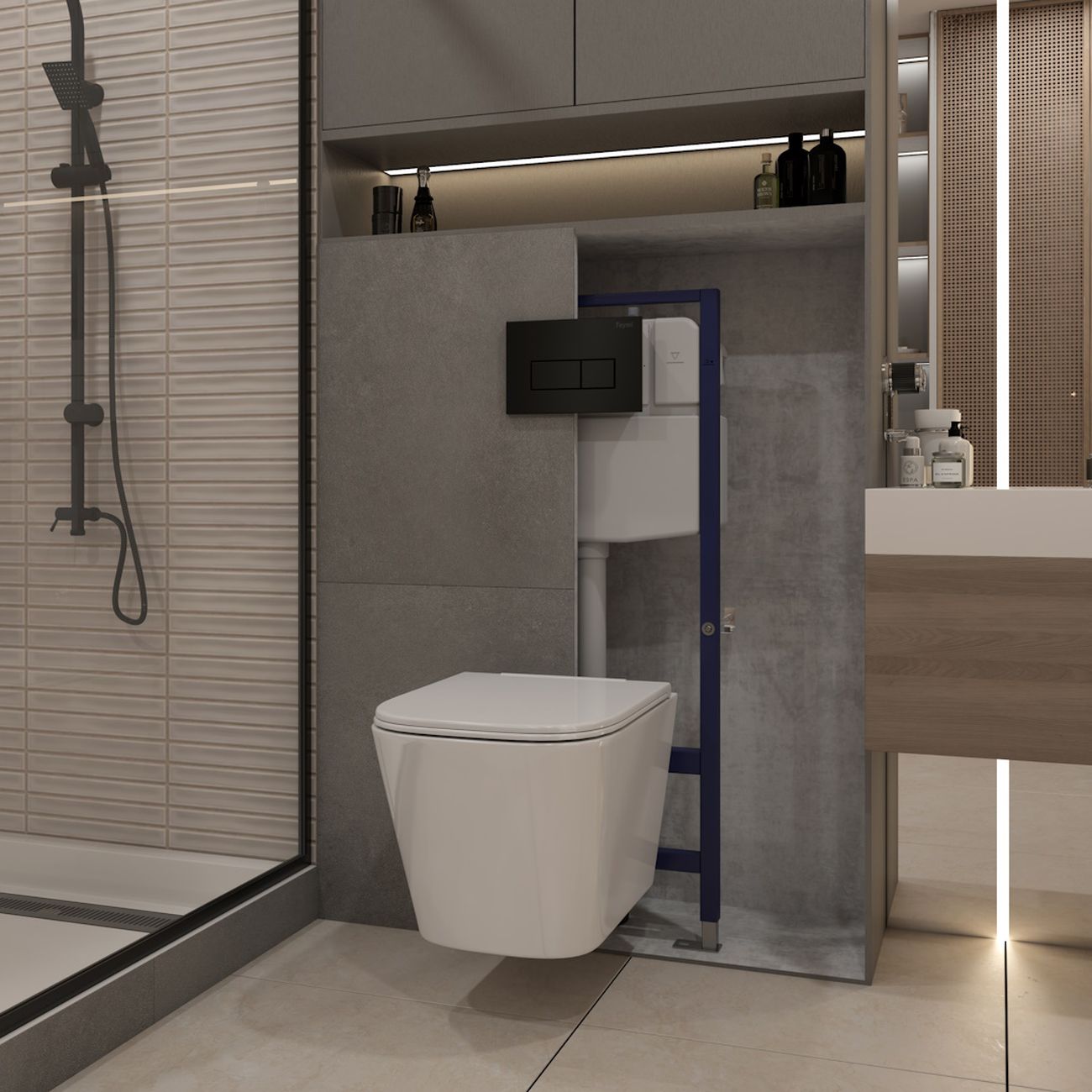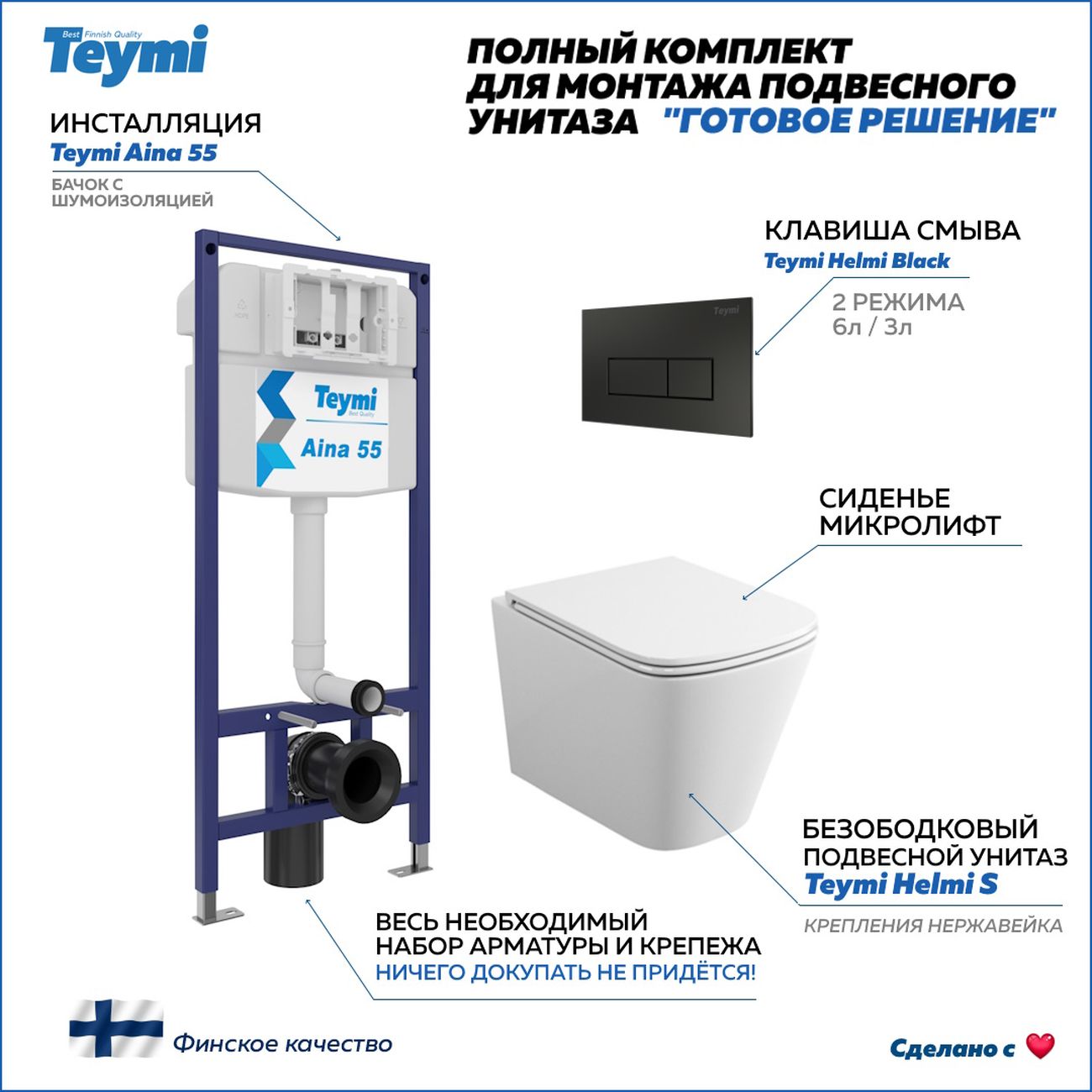 Комплект «Готовое решение» для установки инсталляции с подвесным унитазом: -- инсталляция TEYMI AINA 55 T70035 – монтажная рама из цельного стального профиля прямоугольного сечения, позволяющая выдерживать нагрузки до 400 кг. Габаритная ширина рамы 470 мм; -- клавиша смыва TEYMI HELMI T70203BM, цвет ЧЕРНЫЙ МАТОВЫЙ; -- унитаз подвесной безободковый TEYMI HELMI S T40302; -- сиденье с микролифтом; -- полный комплект арматуры для монтажа: уплотнительные кольца, манжеты, труба смыва, фановый отвод с удлинителем, защитный кожух ревизионного окна с крепежной рамкой, закрывающей панелью и крышкой; -- полный комплект крепежа для установки: крепеж к стене, шпильки для унитаза, крепежная рамка, соединительные шпильки, толкатели, фиксаторы; -- инструкция по установке и обслуживанию. Преимущества комплекта: -- полная (максимальная) комплектация для установки - больше ничего докупать не придётся; -- все составляющие комплекта идеально подходят друг к другу; -- рама покрыта суперпрочной порошковой краской синего цвета с антикоррозионными свойствами; -- высота монтажной рамы может регулироваться с помощью ножек из оцинкованной стали; -- универсальный монтаж – межосевое расстояние под шпильки для подвесного унитаза 180 и 230 мм – подходит ко всем подвесным унитазам; -- сливной бачок скрытого монтажа, изготовленный из полиэтилена низкого давления, рассчитан на 200 тысяч циклов смыва, а цельнолитая бесшовная конструкция позволит работать без протечек в течение всего периода эксплуатации; -- 2-режимный слив 3 / 6 л с возможностью регулировки; -- лёгкость обслуживания бачка благодаря ревизионному окну, скрытому за клавишей смыва; -- гарантия 10 лет на весь комплект и 50 лет на стальную раму. Размер изделия: высота 1130 мм (регулируется) Х ширина 470 мм Х глубина 102 мм. Уважаемые покупатели, обращаем ваше внимание на то, что система инсталляции TEYMI AINA 55 может быть также укомплектована другими клавишами смыва или подвесными унитазами от бренда TEYMI (вы можете найти их на этом сайте по указанным артикулам). Предлагаем вам рассмотреть варианты сочетания со следующими клавишами: : HELMI хром T70202CH : HELMI черная T70203BM : HELMI белая T70018WM : HELMI нержавеющая сталь T70204 : HELMI черный матовый T70205 : HELMI белый глянцевый T70206 : LINA хром T70102CH : LINA черная T70103BM : LINA белая T70019WM : LINA нержавеющая сталь T70104 : LINA черный матовый T70105 : LINA белый матовый T70106 : AINA хром T70012CH : AINA черная T70013BM : AINA белая T70020WM : AINA нержавеющая сталь T70014 : KATI хром T70701CH : KATI черная T70702BM : KATI белая T70021WM : ELLIE хром T70022CH : ELLIE черная T70023BM : ELLIE белая T70024WM Также просим обратить взгляд на наши лучшие безободковые подвесные унитазы: : SOLLI T40201 : LINA S T40102 : HELMI S T40302 : HELMI VORTEX T40303 : IVA T40601 : ELLIE T40802 : LINA MEDIA T40105 : KATI T40701 : HANNA PRO T40901 : HELMI S BLACK T40302MB : VITRA PRO T40806 : VITRA T40804 : DEMI T40208 : LINA VORTEX T40110 : RITTA T40809 : LINA PRO T40106 : LINA S BLACK T40111
