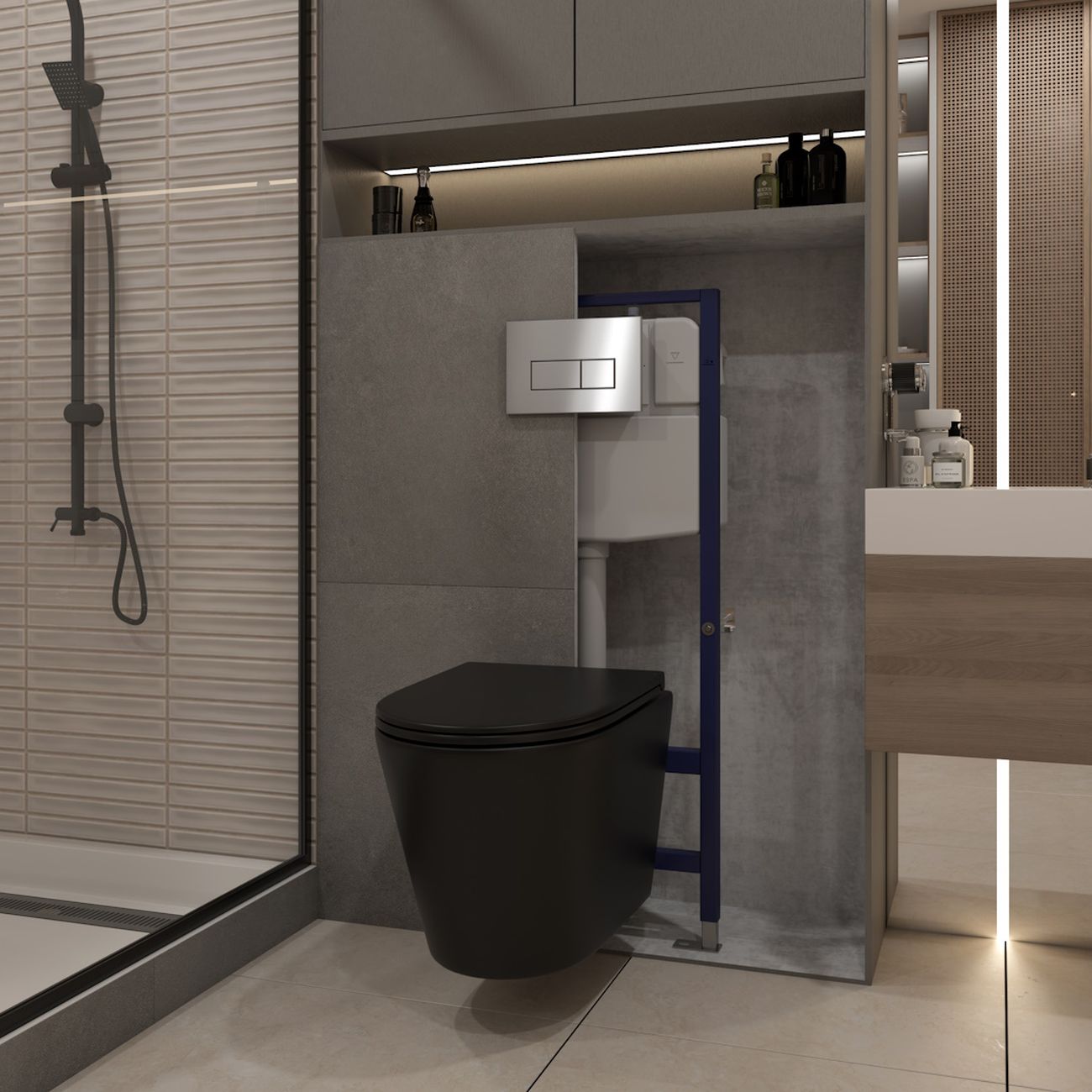 Комплект «Готовое решение» для установки инсталляции с подвесным унитазом: -- инсталляция TEYMI AINA 55 T70035 – монтажная рама из цельного стального профиля прямоугольного сечения, позволяющая выдерживать нагрузки до 400 кг. Габаритная ширина рамы 470 мм; -- клавиша смыва TEYMI HELMI T70204, корпус нержавеюшая сталь, цвет НЕРЖАВЕЮЩАЯ СТАЛЬ МАТОВЫЙ;; -- унитаз подвесной безободковый TEYMI SOLLI ЧЕРНЫЙ T40201MB; -- сиденье с микролифтом; -- полный комплект арматуры для монтажа: уплотнительные кольца, манжеты, труба смыва, фановый отвод с удлинителем, защитный кожух ревизионного окна с крепежной рамкой, закрывающей панелью и крышкой; -- полный комплект крепежа для установки: крепеж к стене, шпильки для унитаза, крепежная рамка, соединительные шпильки, толкатели, фиксаторы; -- инструкция по установке и обслуживанию. Преимущества комплекта: -- полная (максимальная) комплектация для установки - больше ничего докупать не придётся; -- все составляющие комплекта идеально подходят друг к другу; -- рама покрыта суперпрочной порошковой краской синего цвета с антикоррозионными свойствами; -- высота монтажной рамы может регулироваться с помощью ножек из оцинкованной стали; -- универсальный монтаж – межосевое расстояние под шпильки для подвесного унитаза 180 и 230 мм – подходит ко всем подвесным унитазам; -- сливной бачок скрытого монтажа, изготовленный из полиэтилена низкого давления, рассчитан на 200 тысяч циклов смыва, а цельнолитая бесшовная конструкция позволит работать без протечек в течение всего периода эксплуатации; -- 2-режимный слив 3 / 6 л с возможностью регулировки; -- лёгкость обслуживания бачка благодаря ревизионному окну, скрытому за клавишей смыва; -- гарантия 10 лет на весь комплект и 50 лет на стальную раму. Размер изделия: высота 1130 мм (регулируется) Х ширина 470 мм Х глубина 102 мм. Уважаемые покупатели, обращаем ваше внимание на то, что система инсталляции TEYMI AINA 55 может быть также укомплектована другими клавишами смыва или подвесными унитазами от бренда TEYMI (вы можете найти их на этом сайте по указанным артикулам). Предлагаем вам рассмотреть варианты сочетания со следующими клавишами: : HELMI хром T70202CH : HELMI черная T70203BM : HELMI белая T70018WM : HELMI нержавеющая сталь T70204 : HELMI черный матовый T70205 : HELMI белый глянцевый T70206 : LINA хром T70102CH : LINA черная T70103BM : LINA белая T70019WM : LINA нержавеющая сталь T70104 : LINA черный матовый T70105 : LINA белый матовый T70106 : AINA хром T70012CH : AINA черная T70013BM : AINA белая T70020WM : AINA нержавеющая сталь T70014 : KATI хром T70701CH : KATI черная T70702BM : KATI белая T70021WM : ELLIE хром T70022CH : ELLIE черная T70023BM : ELLIE белая T70024WM Также просим обратить взгляд на наши лучшие безободковые подвесные унитазы: : SOLLI T40201 : LINA S T40102 : HELMI S T40302 : HELMI VORTEX T40303 : IVA T40601 : ELLIE T40802 : LINA MEDIA T40105 : KATI T40701 : HANNA PRO T40901 : HELMI S BLACK T40302MB : VITRA PRO T40806 : VITRA T40804 : DEMI T40208 : LINA VORTEX T40110 : RITTA T40809 : LINA PRO T40106 : LINA S BLACK T40111