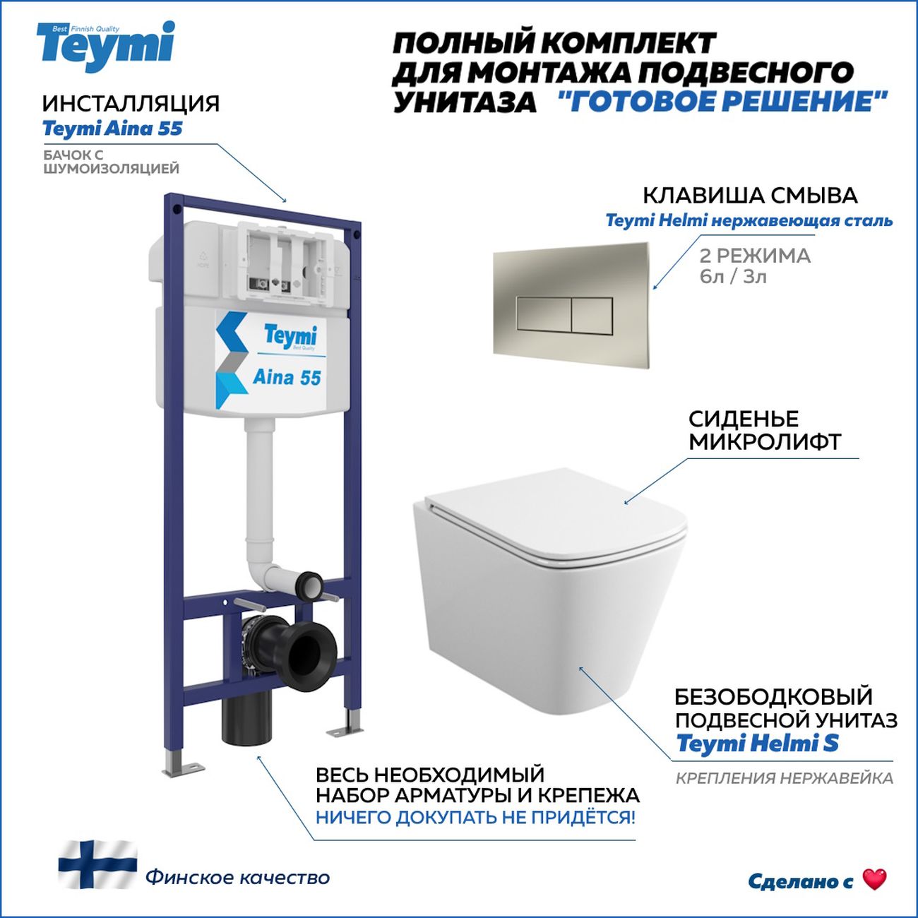Комплект «Готовое решение» для установки инсталляции с подвесным унитазом: -- инсталляция TEYMI AINA 55 T70035 – монтажная рама из цельного стального профиля прямоугольного сечения, позволяющая выдерживать нагрузки до 400 кг. Габаритная ширина рамы 470 мм; -- клавиша смыва TEYMI HELMI T70204, корпус нержавеюшая сталь, цвет НЕРЖАВЕЮЩАЯ СТАЛЬ МАТОВЫЙ;; -- унитаз подвесной безободковый TEYMI HELMI S T40302; -- сиденье с микролифтом; -- полный комплект арматуры для монтажа: уплотнительные кольца, манжеты, труба смыва, фановый отвод с удлинителем, защитный кожух ревизионного окна с крепежной рамкой, закрывающей панелью и крышкой; -- полный комплект крепежа для установки: крепеж к стене, шпильки для унитаза, крепежная рамка, соединительные шпильки, толкатели, фиксаторы; -- инструкция по установке и обслуживанию. Преимущества комплекта: -- полная (максимальная) комплектация для установки - больше ничего докупать не придётся; -- все составляющие комплекта идеально подходят друг к другу; -- рама покрыта суперпрочной порошковой краской синего цвета с антикоррозионными свойствами; -- высота монтажной рамы может регулироваться с помощью ножек из оцинкованной стали; -- универсальный монтаж – межосевое расстояние под шпильки для подвесного унитаза 180 и 230 мм – подходит ко всем подвесным унитазам; -- сливной бачок скрытого монтажа, изготовленный из полиэтилена низкого давления, рассчитан на 200 тысяч циклов смыва, а цельнолитая бесшовная конструкция позволит работать без протечек в течение всего периода эксплуатации; -- 2-режимный слив 3 / 6 л с возможностью регулировки; -- лёгкость обслуживания бачка благодаря ревизионному окну, скрытому за клавишей смыва; -- гарантия 10 лет на весь комплект и 50 лет на стальную раму. Размер изделия: высота 1130 мм (регулируется) Х ширина 470 мм Х глубина 102 мм. Уважаемые покупатели, обращаем ваше внимание на то, что система инсталляции TEYMI AINA 55 может быть также укомплектована другими клавишами смыва или подвесными унитазами от бренда TEYMI (вы можете найти их на этом сайте по указанным артикулам). Предлагаем вам рассмотреть варианты сочетания со следующими клавишами: : HELMI хром T70202CH : HELMI черная T70203BM : HELMI белая T70018WM : HELMI нержавеющая сталь T70204 : HELMI черный матовый T70205 : HELMI белый глянцевый T70206 : LINA хром T70102CH : LINA черная T70103BM : LINA белая T70019WM : LINA нержавеющая сталь T70104 : LINA черный матовый T70105 : LINA белый матовый T70106 : AINA хром T70012CH : AINA черная T70013BM : AINA белая T70020WM : AINA нержавеющая сталь T70014 : KATI хром T70701CH : KATI черная T70702BM : KATI белая T70021WM : ELLIE хром T70022CH : ELLIE черная T70023BM : ELLIE белая T70024WM Также просим обратить взгляд на наши лучшие безободковые подвесные унитазы: : SOLLI T40201 : LINA S T40102 : HELMI S T40302 : HELMI VORTEX T40303 : IVA T40601 : ELLIE T40802 : LINA MEDIA T40105 : KATI T40701 : HANNA PRO T40901 : HELMI S BLACK T40302MB : VITRA PRO T40806 : VITRA T40804 : DEMI T40208 : LINA VORTEX T40110 : RITTA T40809 : LINA PRO T40106 : LINA S BLACK T40111