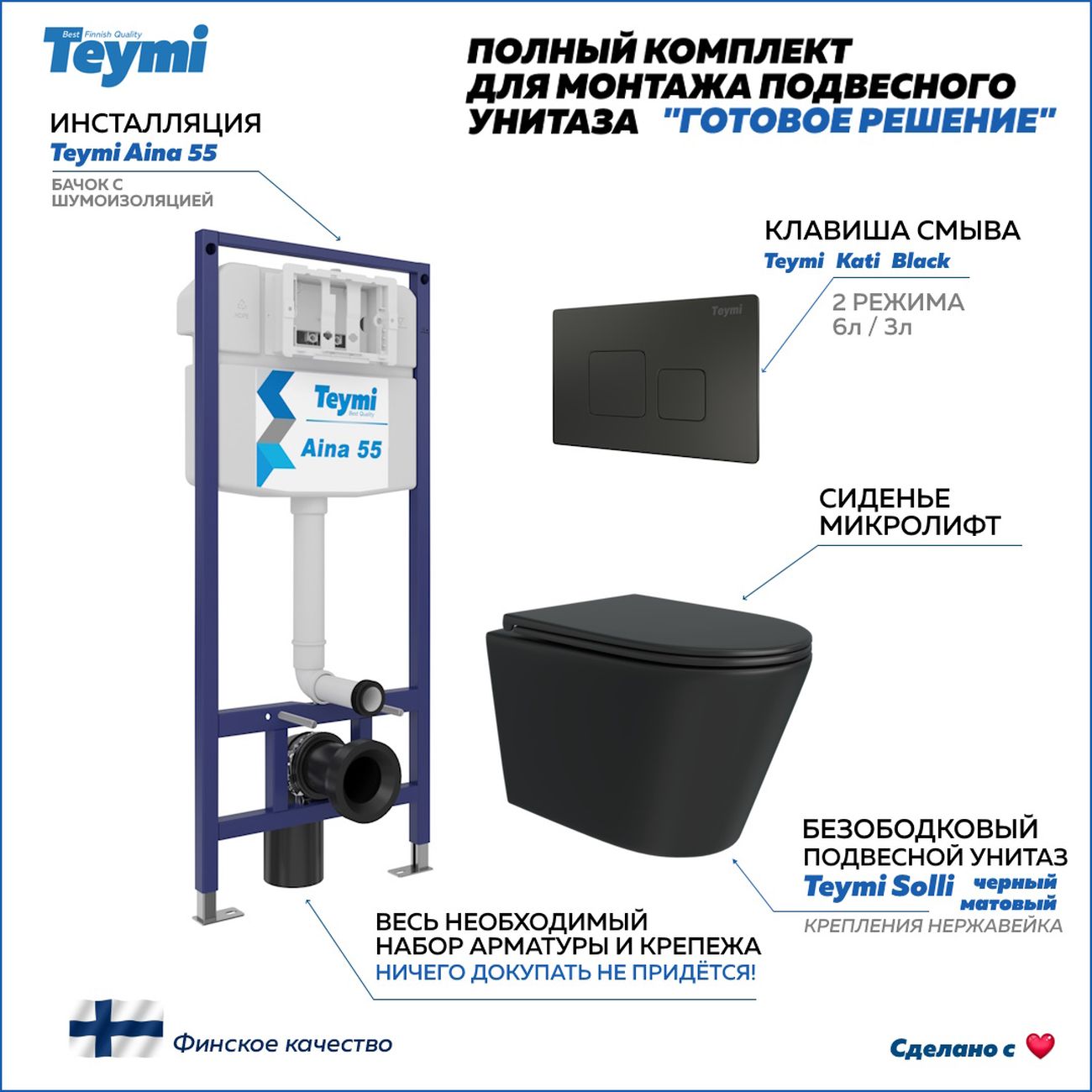 Комплект «Готовое решение» для установки инсталляции с подвесным унитазом: -- инсталляция TEYMI AINA 55 T70035 – монтажная рама из цельного стального профиля прямоугольного сечения, позволяющая выдерживать нагрузки до 400 кг. Габаритная ширина рамы 470 мм; -- клавиша смыва TEYMI KATI T70702BM, цвет ЧЕРНЫЙ МАТОВЫЙ; -- унитаз подвесной безободковый TEYMI SOLLI ЧЕРНЫЙ T40201MB; -- сиденье с микролифтом; -- полный комплект арматуры для монтажа: уплотнительные кольца, манжеты, труба смыва, фановый отвод с удлинителем, защитный кожух ревизионного окна с крепежной рамкой, закрывающей панелью и крышкой; -- полный комплект крепежа для установки: крепеж к стене, шпильки для унитаза, крепежная рамка, соединительные шпильки, толкатели, фиксаторы; -- инструкция по установке и обслуживанию. Преимущества комплекта: -- полная (максимальная) комплектация для установки - больше ничего докупать не придётся; -- все составляющие комплекта идеально подходят друг к другу; -- рама покрыта суперпрочной порошковой краской синего цвета с антикоррозионными свойствами; -- высота монтажной рамы может регулироваться с помощью ножек из оцинкованной стали; -- универсальный монтаж – межосевое расстояние под шпильки для подвесного унитаза 180 и 230 мм – подходит ко всем подвесным унитазам; -- сливной бачок скрытого монтажа, изготовленный из полиэтилена низкого давления, рассчитан на 200 тысяч циклов смыва, а цельнолитая бесшовная конструкция позволит работать без протечек в течение всего периода эксплуатации; -- 2-режимный слив 3 / 6 л с возможностью регулировки; -- лёгкость обслуживания бачка благодаря ревизионному окну, скрытому за клавишей смыва; -- гарантия 10 лет на весь комплект и 50 лет на стальную раму. Размер изделия: высота 1130 мм (регулируется) Х ширина 470 мм Х глубина 102 мм. Уважаемые покупатели, обращаем ваше внимание на то, что система инсталляции TEYMI AINA 55 может быть также укомплектована другими клавишами смыва или подвесными унитазами от бренда TEYMI (вы можете найти их на этом сайте по указанным артикулам). Предлагаем вам рассмотреть варианты сочетания со следующими клавишами: : HELMI хром T70202CH : HELMI черная T70203BM : HELMI белая T70018WM : HELMI нержавеющая сталь T70204 : HELMI черный матовый T70205 : HELMI белый глянцевый T70206 : LINA хром T70102CH : LINA черная T70103BM : LINA белая T70019WM : LINA нержавеющая сталь T70104 : LINA черный матовый T70105 : LINA белый матовый T70106 : AINA хром T70012CH : AINA черная T70013BM : AINA белая T70020WM : AINA нержавеющая сталь T70014 : KATI хром T70701CH : KATI черная T70702BM : KATI белая T70021WM : ELLIE хром T70022CH : ELLIE черная T70023BM : ELLIE белая T70024WM Также просим обратить взгляд на наши лучшие безободковые подвесные унитазы: : SOLLI T40201 : LINA S T40102 : HELMI S T40302 : HELMI VORTEX T40303 : IVA T40601 : ELLIE T40802 : LINA MEDIA T40105 : KATI T40701 : HANNA PRO T40901 : HELMI S BLACK T40302MB : VITRA PRO T40806 : VITRA T40804 : DEMI T40208 : LINA VORTEX T40110 : RITTA T40809 : LINA PRO T40106 : LINA S BLACK T40111