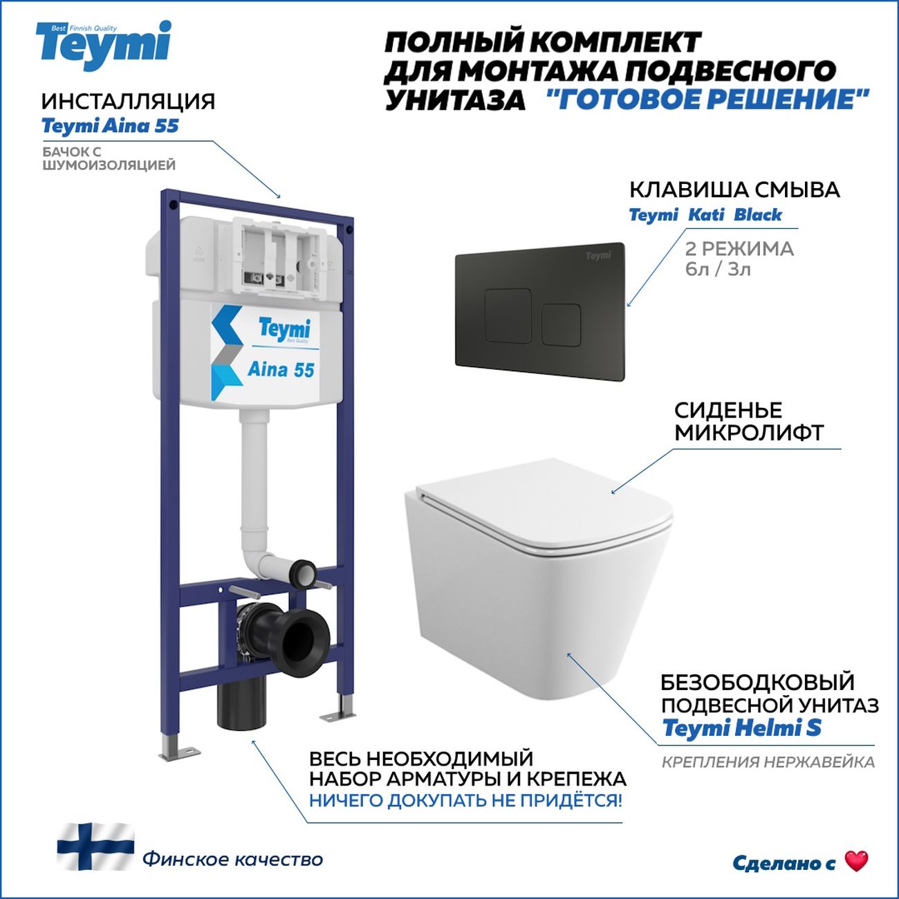 Комплект «Готовое решение» для установки инсталляции с подвесным унитазом: -- инсталляция TEYMI AINA 55 T70035 – монтажная рама из цельного стального профиля прямоугольного сечения, позволяющая выдерживать нагрузки до 400 кг. Габаритная ширина рамы 470 мм; -- клавиша смыва TEYMI KATI T70702BM, цвет ЧЕРНЫЙ МАТОВЫЙ; -- унитаз подвесной безободковый TEYMI HELMI S T40302; -- сиденье с микролифтом; -- полный комплект арматуры для монтажа: уплотнительные кольца, манжеты, труба смыва, фановый отвод с удлинителем, защитный кожух ревизионного окна с крепежной рамкой, закрывающей панелью и крышкой; -- полный комплект крепежа для установки: крепеж к стене, шпильки для унитаза, крепежная рамка, соединительные шпильки, толкатели, фиксаторы; -- инструкция по установке и обслуживанию. Преимущества комплекта: -- полная (максимальная) комплектация для установки - больше ничего докупать не придётся; -- все составляющие комплекта идеально подходят друг к другу; -- рама покрыта суперпрочной порошковой краской синего цвета с антикоррозионными свойствами; -- высота монтажной рамы может регулироваться с помощью ножек из оцинкованной стали; -- универсальный монтаж – межосевое расстояние под шпильки для подвесного унитаза 180 и 230 мм – подходит ко всем подвесным унитазам; -- сливной бачок скрытого монтажа, изготовленный из полиэтилена низкого давления, рассчитан на 200 тысяч циклов смыва, а цельнолитая бесшовная конструкция позволит работать без протечек в течение всего периода эксплуатации; -- 2-режимный слив 3 / 6 л с возможностью регулировки; -- лёгкость обслуживания бачка благодаря ревизионному окну, скрытому за клавишей смыва; -- гарантия 10 лет на весь комплект и 50 лет на стальную раму. Размер изделия: высота 1130 мм (регулируется) Х ширина 470 мм Х глубина 102 мм. Уважаемые покупатели, обращаем ваше внимание на то, что система инсталляции TEYMI AINA 55 может быть также укомплектована другими клавишами смыва или подвесными унитазами от бренда TEYMI (вы можете найти их на этом сайте по указанным артикулам). Предлагаем вам рассмотреть варианты сочетания со следующими клавишами: : HELMI хром T70202CH : HELMI черная T70203BM : HELMI белая T70018WM : HELMI нержавеющая сталь T70204 : HELMI черный матовый T70205 : HELMI белый глянцевый T70206 : LINA хром T70102CH : LINA черная T70103BM : LINA белая T70019WM : LINA нержавеющая сталь T70104 : LINA черный матовый T70105 : LINA белый матовый T70106 : AINA хром T70012CH : AINA черная T70013BM : AINA белая T70020WM : AINA нержавеющая сталь T70014 : KATI хром T70701CH : KATI черная T70702BM : KATI белая T70021WM : ELLIE хром T70022CH : ELLIE черная T70023BM : ELLIE белая T70024WM Также просим обратить взгляд на наши лучшие безободковые подвесные унитазы: : SOLLI T40201 : LINA S T40102 : HELMI S T40302 : HELMI VORTEX T40303 : IVA T40601 : ELLIE T40802 : LINA MEDIA T40105 : KATI T40701 : HANNA PRO T40901 : HELMI S BLACK T40302MB : VITRA PRO T40806 : VITRA T40804 : DEMI T40208 : LINA VORTEX T40110 : RITTA T40809 : LINA PRO T40106 : LINA S BLACK T40111