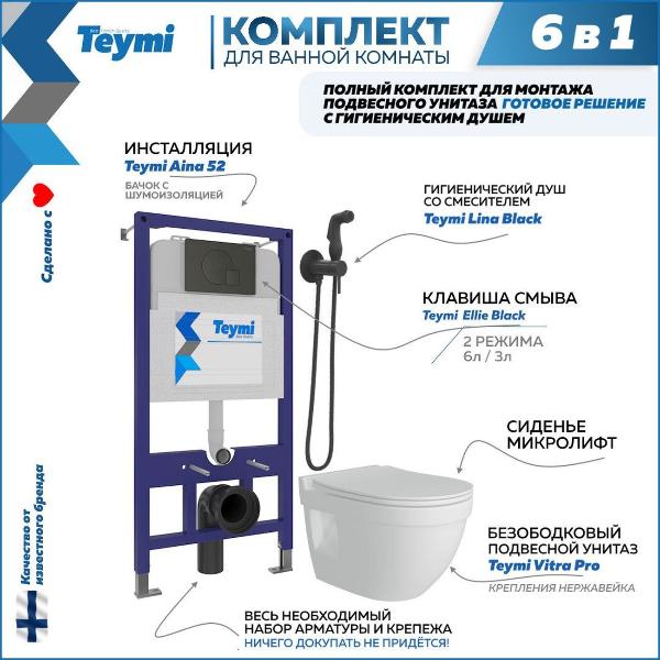 1216389 Комплект «Готовое решение» для установки инсталляции с подвесным унитазом включает: -- инсталляция TEYMI AINA 52 T70011 – монтажная рама из стального профиля толщиной 1.5 мм увеличенной ширины 52,5 см с дополнительными вертикальными усиливающими стойками, что позволяет выдерживать нагрузки до 400 кг; -- клавиша смыва TEYMI ELLIE T70023BM, цвет ЧЕРНЫЙ МАТОВЫЙ; -- унитаз подвесной TEYMI VITRA PRO T40806; -- быстросъёмное сиденье с микролифтом; -- смеситель с гигиенической лейкой TEYMI LINA, черный матовый T10230; -- полный комплект арматуры для монтажа, включающий в себя уплотнительные кольца и манжеты, трубу смыва, фановый отвод с удлинителем, защитный кожух ревизионного окна с крепежной рамкой, закрывающей панелью и крышкой; -- полный комплект крепежа для установки, а именно: крепеж к стене, шпильки для унитаза, крепежная рамка, соединительные шпильки, толкатели; -- инструкция по установке и обслуживанию. Преимущества комплекта «Готовое решение» для установки инсталляции с подвесным унитазом: -- полная (максимальная) комплектация для установки - больше ничего докупать не придётся; -- все составляющие комплекта идеально подходят друг к другу; -- взаимозаменяемость комплектующих; -- рама покрыта суперпрочной порошковой краской с антикоррозионными свойствами; -- высота рамы может регулироваться с ходом до 20 см с помощью ножек, изготовленных из оцинкованной стали; -- сливной бачок скрытого монтажа изготовлен из современных полимерных материалов и является цельнолитым (бесшовным), что позволяет ему работать без протечек в течение всего периода эксплуатации; -- лёгкость обслуживания сливного бачка достигается благодаря удобному ревизионному окну, скрытому за клавишей смыва; -- клавиша смыва имеет две кнопки и работает в режиме ЭКОНОМ / ПОЛНЫЙ (объёмы смыва 3 / 6 литров); -- смеситель с удобной гигиенической лейкой; -- гарантия на весь комплект составляет 10 лет, а рама прослужит все 50. Комплект «Готовое решение» для установки инсталляции TEYMI AINA 52 с подвесным унитазом TEYMI VITRA PRO T40806 и клавишей TEYMI ELLIE T70023BM в цвете черный матовый c гигиеническим душем TEYMI LINA T10230 подобран специально для того, чтобы покупателям было проще сориентироваться в огромном выборе товаров для ванной комнаты. Оптимальное сочетание инсталляционной системы, клавиши смыва и подвесного унитаза позволит не задумываясь сделать правильный выбор. Инсталляция для подвесного унитаза от известного финского бренда TEYMI предназначена для оборудования санузлов и выгодно отличается своей надёжностью и простотой установки. Уважаемые покупатели, обращаем ваше внимание на то, что система инсталляции TEYMI AINA 52 может быть также укомплектована другими клавишами смыва или подвесными унитазами от бренда TEYMI (вы легко сможете найти их на этом сайте по указанным артикулам). Предлагаем вам рассмотреть варианты сочетания со следующими клавишами: : HELMI хром T70202CH : HELMI черная T70203BM : HELMI белая T70018WM : LINA хром T70102CH : LINA черная T70103BM : LINA белая T70019WM : AINA хром T70012CH : AINA черная T70013BM : AINA белая T70020WM : KATI хром T70701CH : KATI черная T70702BM : KATI белая T70021WM : ELLIE хром T70022CH : ELLIE черная T70023BM : ELLIE белая T70024WM Также просим обратить взгляд на наши лучшие безободковые подвесные унитазы: : SOLLI T40201 : LINA S T40102 : HELMI S T40302 : HELMI VORTEX T40303 : IVA T40601 : ELLIE T40802 : LINA MEDIA T40105 : LORI T40501 : KATI T40701 : HANNA PRO T40901 : HELMI S BLACK T40302MB : VITRA PRO T40806 : VITRA T40804 : DEMI T40208 : LINA VORTEX T40110 : RITTA T40809 : LINA PRO T40106