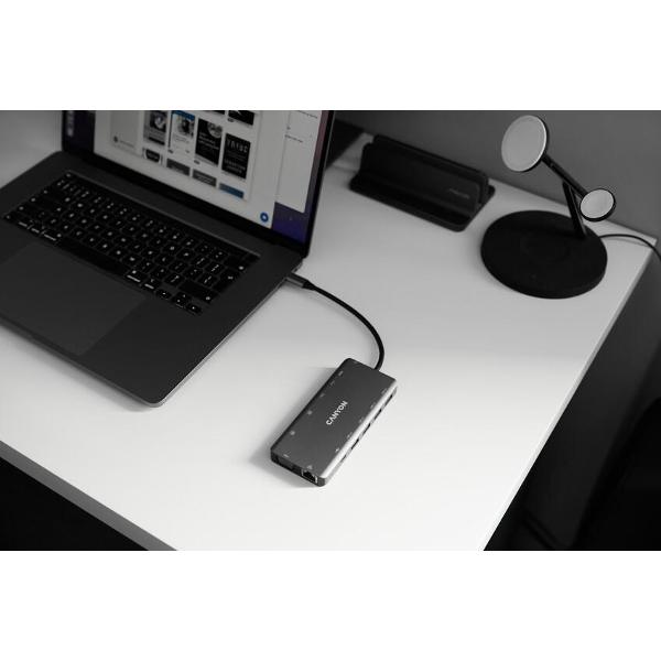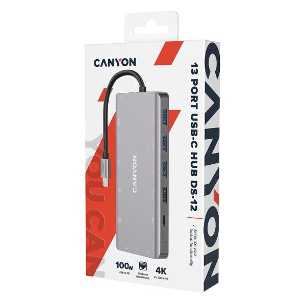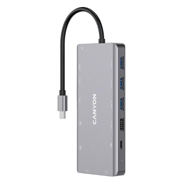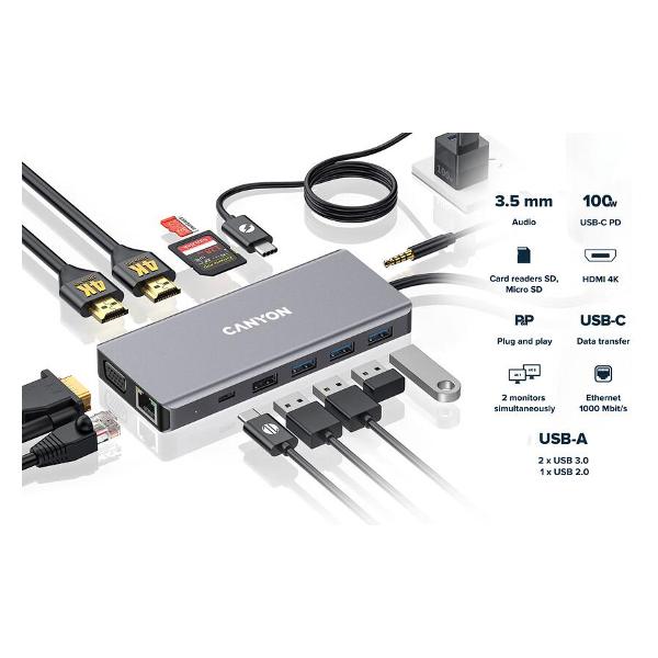 Устройство гарантирует передачу данных с максимальной скоростью 5 Гбит/с. Универсальная модель оснащена 13 портами — USB 3.1 типа A и С, USB 3.2 типа A и С, USB 3.0 типа A, HDMI, VGA, RJ45, 3,5 мм и слотом для microSD, microSDHC или microSDXC. Световые индикаторы информируют о включении прибора и активном разъеме. Доступна поддержка Samsung DEX и Nintendo Switch. В комплектацию входят кабель длиной 0,15 м с интерфейсом 0.15 м для подсоединения к ПК.