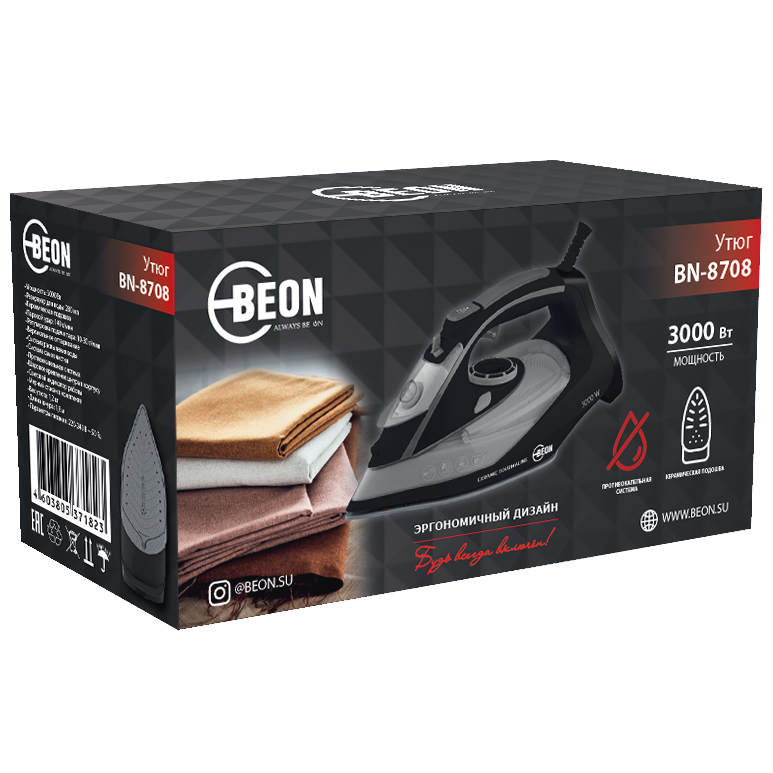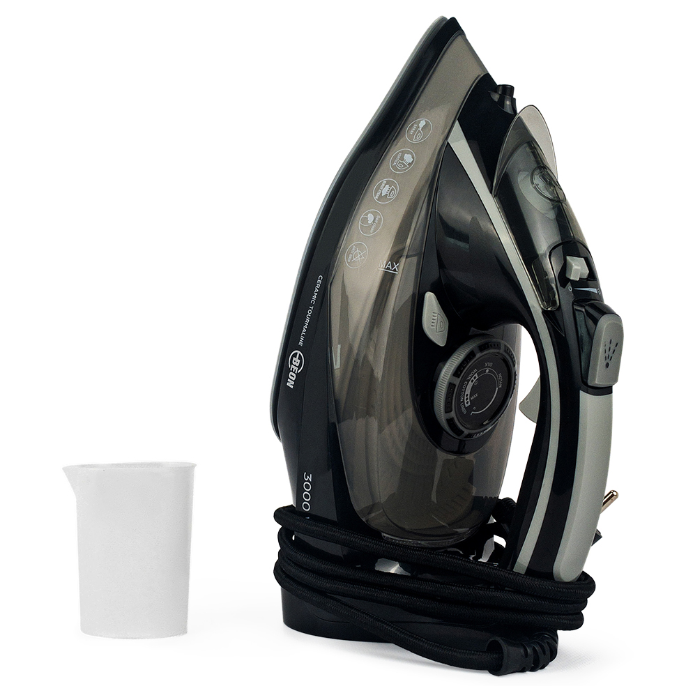 Утюг Beon BN-8708 серого цвета с тремя режимами оснащен системой самоочищения от накипи. Интенсивность подачи пара регулируется (от 20 до 40 г/мин). Присутствует функция отпаривания одежды в вертикальном положении. Вес изделия — 1,2 кг. Мерный стаканчик идет в комплекте. Подошва сделана из керамики, предотвращающей прилипание к ткани, корпус — из легкого пластика. Ручка с прорезиненной поверхностью надежно сидит в ладони. Удобный узкий носик позволяет разгладить материал возле мелких деталей. Индикатор показывает включение, готовность прибора к работе и уровень воды. Мощность — 3 кВт.